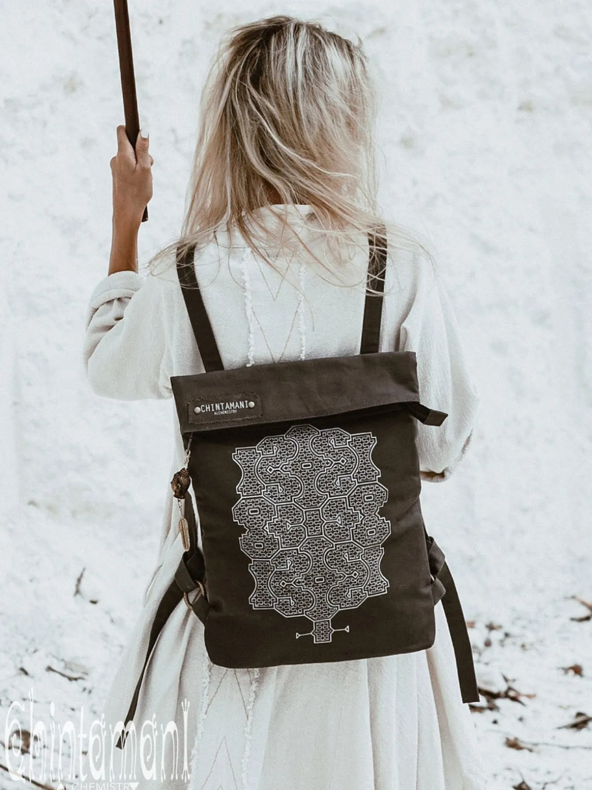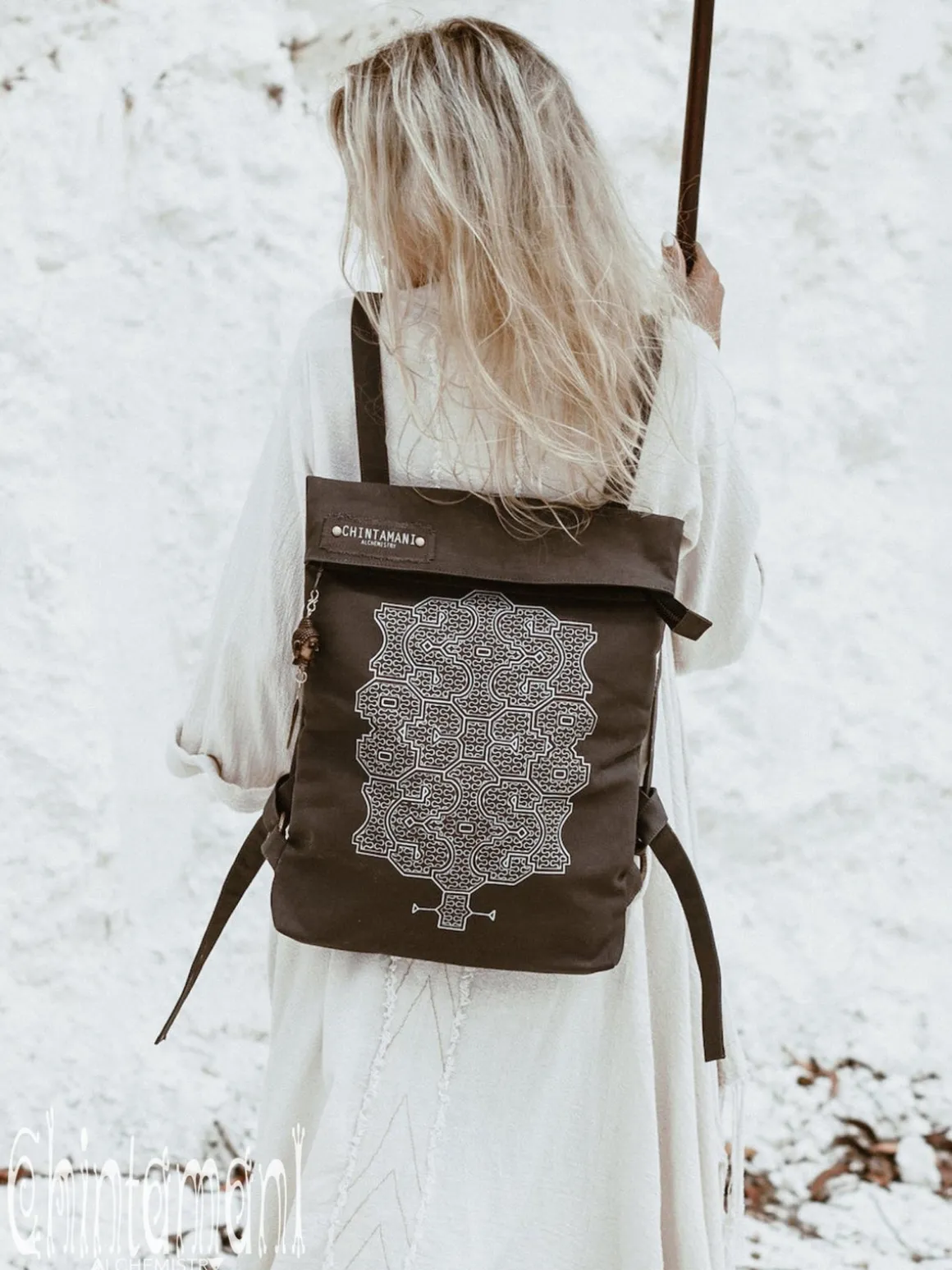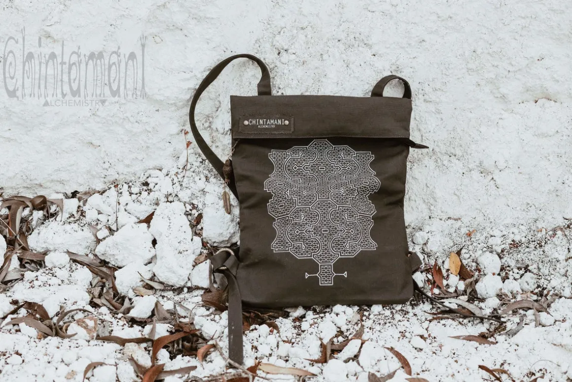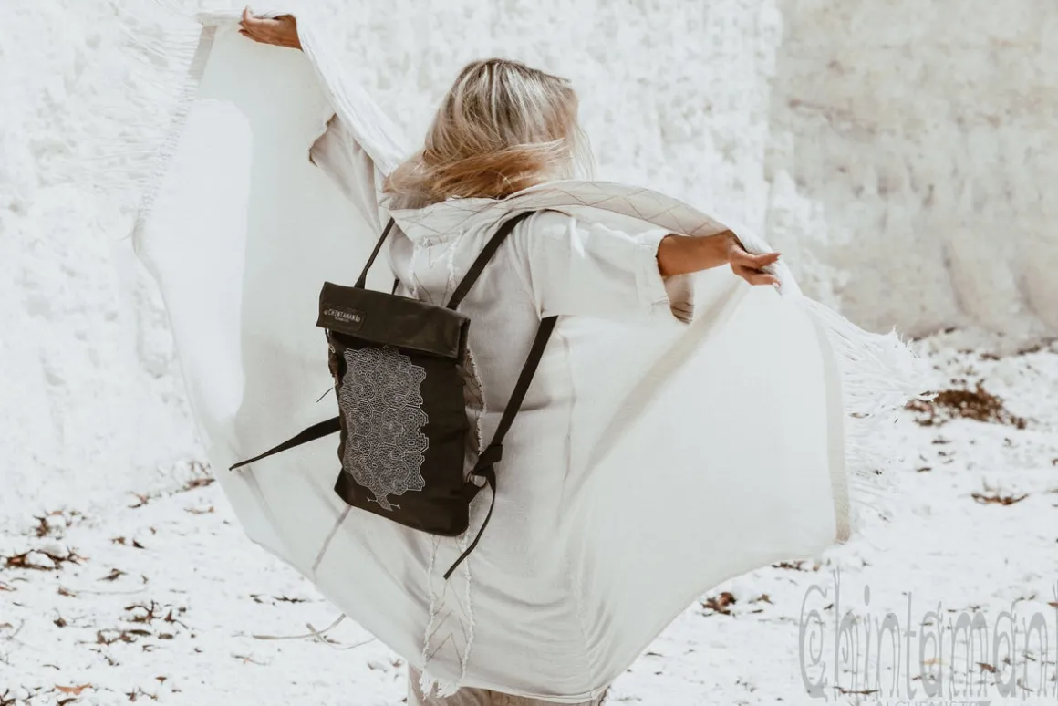 Rolltop Flat Laptop City Backpack, made of strong Cotton Canvas – it is a perfect every day bag and an ultimate fashion statement. This roll top piece is 100% vegetarian, as we do not use leather or any other animal products in its creation. The back of the model is made with two layers of canvas for extra strength, the straps can be adjusted, as they are tied around decorated brass rings. Backpack seals with zipper, and then the top can be rolled and fixed with magnets. There is a pocket inside for valuables, as well, as pocket on the back, which opens from the side and can be reached when you are wearing the backpack. It is quite spacious – you will be amazed, as you can fit even big professional notebook in this visually small bag! It comes in universal grey, stunning off white, gentle beige and classic black color, and is decorated with handprinted traditional Shipibo Conibo pattern, as well, as unique Buddha Head brass pendent, made by our artisans on Bali. Each and every backpack is a one of a kind artefact!