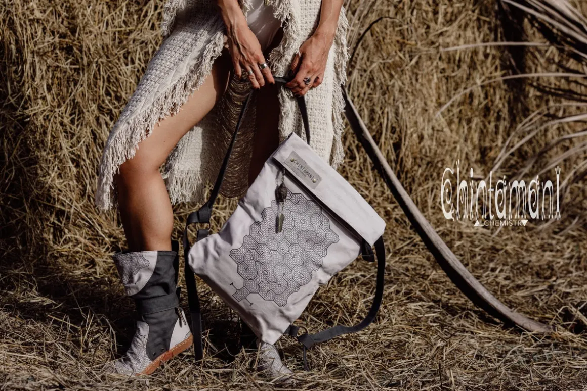Rolltop Flat Laptop City Backpack, made of strong Cotton Canvas – it is a perfect every day bag and an ultimate fashion statement. This roll top piece is 100% vegetarian, as we do not use leather or any other animal products in its creation. The back of the model is made with two layers of canvas for extra strength, the straps can be adjusted, as they are tied around decorated brass rings. Backpack seals with zipper, and then the top can be rolled and fixed with magnets. There is a pocket inside for valuables, as well, as pocket on the back, which opens from the side and can be reached when you are wearing the backpack. It is quite spacious – you will be amazed, as you can fit even big professional notebook in this visually small bag! It comes in universal grey, stunning off white, gentle beige and classic black color, and is decorated with handprinted traditional Shipibo Conibo pattern, as well, as unique Buddha Head brass pendent, made by our artisans on Bali. Each and every backpack is a one of a kind artefact!