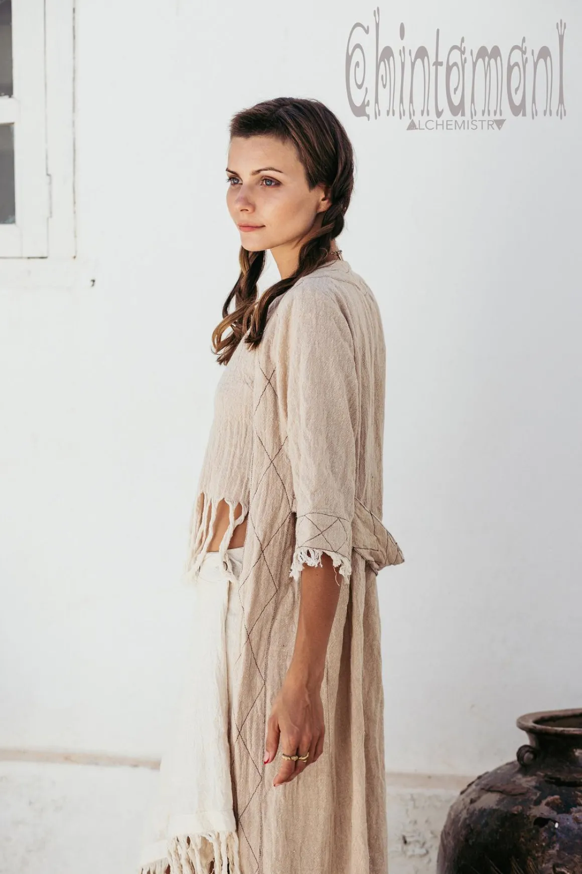 Hand woven cotton long cardigan robe was created to serve as a gorgeous second layer to any basic dress. You can also wear it with shorts or pants and our raw cotton tops to create elegant evening look. Fully natural 100% cotton fabric feels very unstarched and raw, floaty silhouette is especially beautiful on the move. Sleeves and hemline are decorated with handmade fringe. There is a half belt adorned with stitched pattern on the back. The item comes in 3 sizes, that differ in width and length. This piece is that little extra to introduce to your wardrobe for instant feel good effect. It will add boho accent and make your appearance unforgettable.
