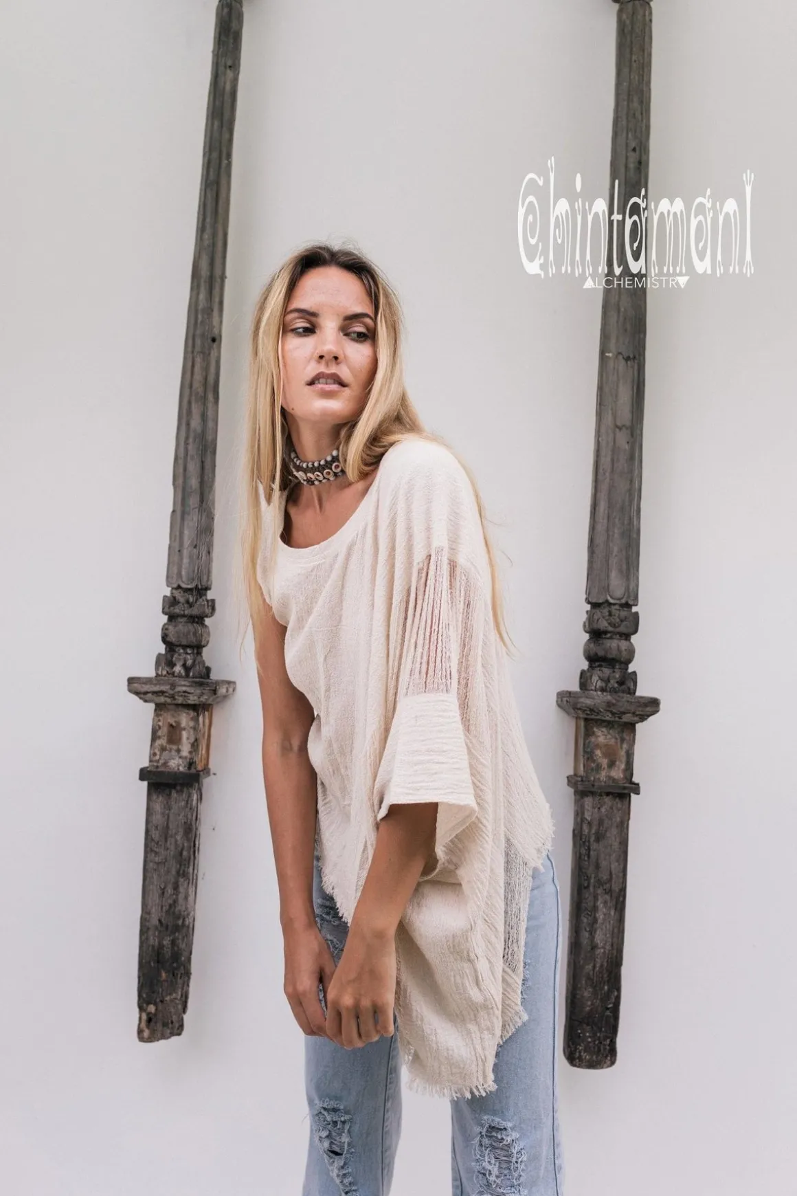 Asymmetrical Boho Top is a new and awesome addition to our Raw Cotton Collection. It is the most comfy summer wear ever – so light, a little baggy, but still stunningly feminine! From the first glimpse it looks like a simple t-shirt, but has two very original designer twists. First, it is decorated with a handmade open thread stripe, and then one side has a little slit, so you can tie up the edges and make a crop top out of it! The fabric made of handwoven raw cotton is a very airy and breathable material by itself. It is a perfect option for very hot tropical climate or summer heatwave. We make this gypsy tee shirt from raw unbleached cotton in its gorgeous sandy beige natural color, as well, as in gently bleached off-white shade. Oversized Cotton Tshirt looks amazing with boho skirts or wide linen pants from our collection, but you can actually just wear it with your favorite jean shorts and boots for a simple hot summer look with a bohemian twist.