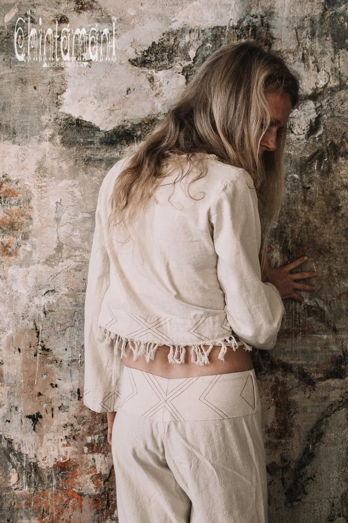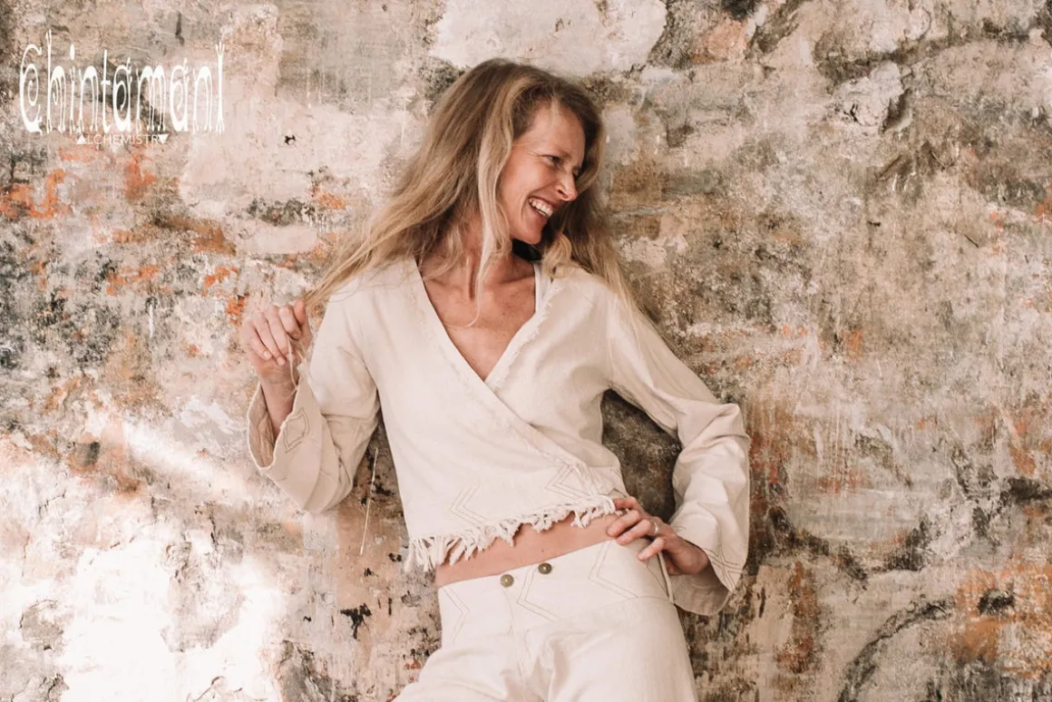 Off White long sleeved Boho Wrap Top is a gorgeous Chintamani Alchemistry creation with a very simple silhouette, adjustable to almost any type of figure. It is wrapped around and fixed with straps – in a very convenient traditional way. Made out of 100% natural raw cotton in amazing off white or classic black color, this Top is quite thick and durable, but very soft. It is decorated with geometric Navajo inspired embroidery and hand made fringes. Goes perfectly with our Wide Linen trousers or Flared Distressed jeans, as well, as all Chintamani Alchemistry skirts.