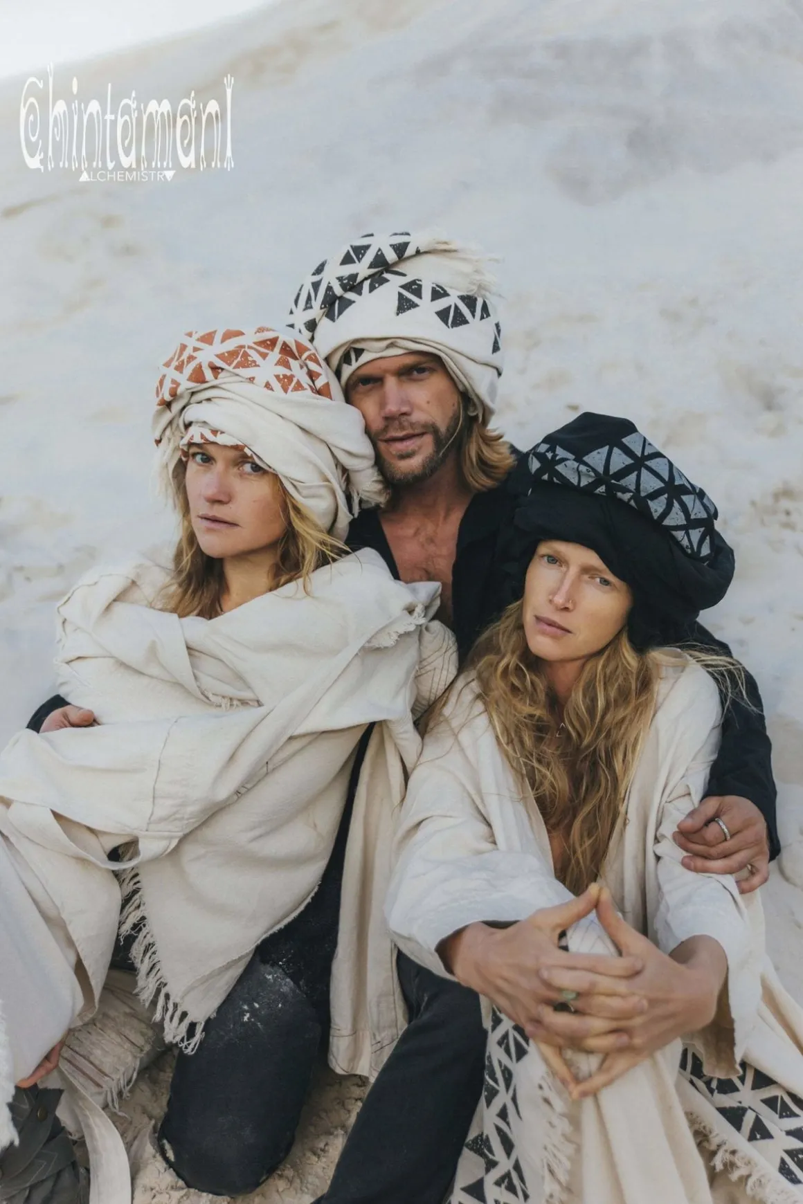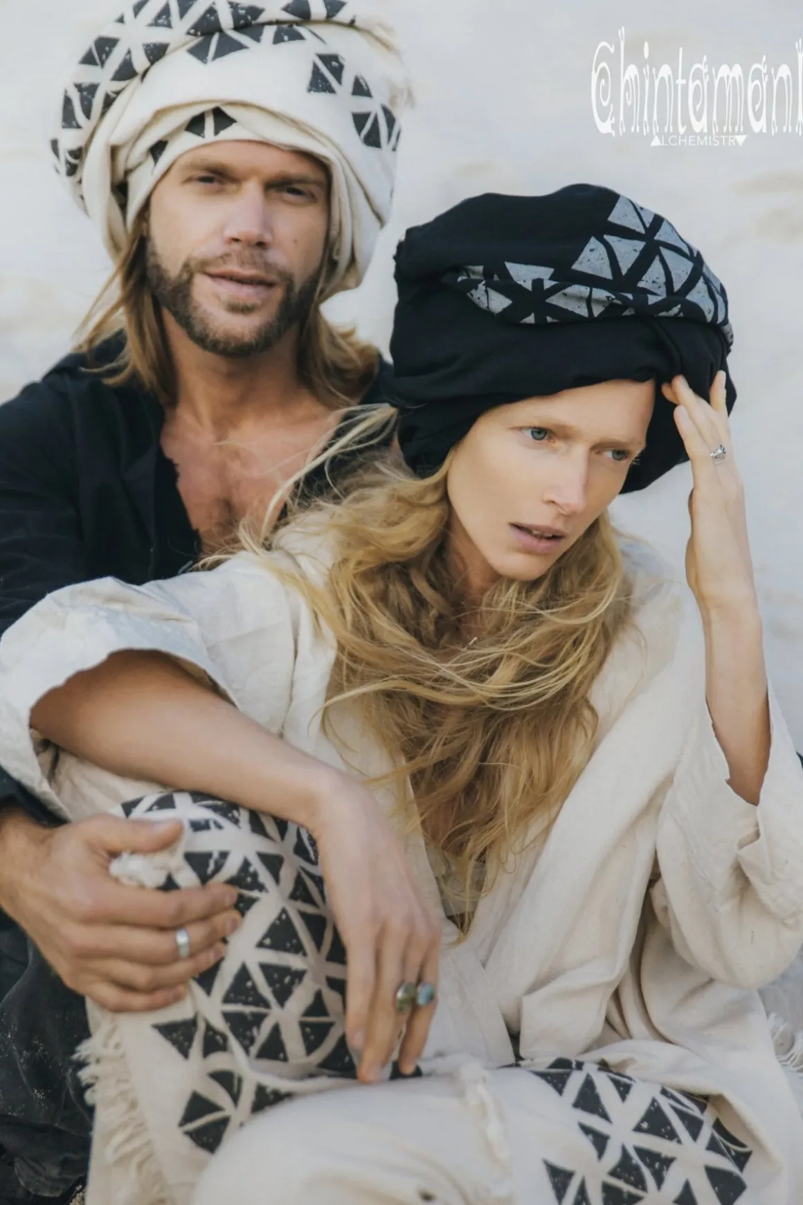 ATUA Black Bohemian Shawl is a gorgeous accessory with geometrical handprinted tribal patterns. “Atua” means God in Polynesian, as well, as power or strength. Decorating their bodies with intricate geometric tattoos, which encrypt protective deities, Polynesian people believe, they connect to the divine force. Chintamani Alchemistry used this as inspiration for our simple triangular pattern collection. Atua Natural Cotton Boho Scarf gives you a taste of it. Made of wonderful soft pure cotton, this piece is very cozy and has an amazing organic raw look. It is quite long (210 cm) and can be used in various ways. You can wrap it up as a boho turban, use as beach sarong, as blanket and artistic furniture cover. And of course, it can be just a stunning simple scarf. The item comes in classic white or black color, to compliment most other clothes from Chintamani Alchemistry.