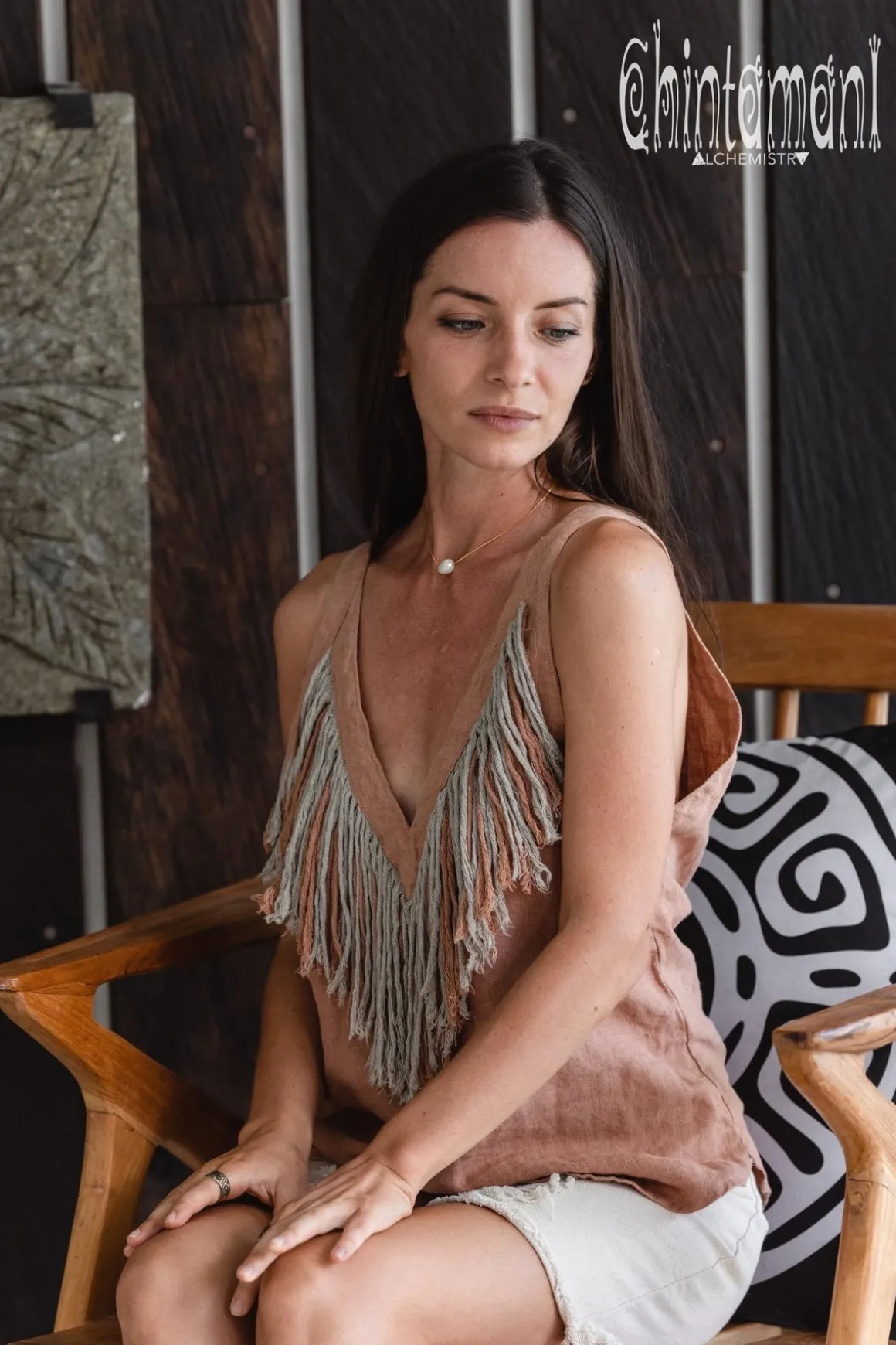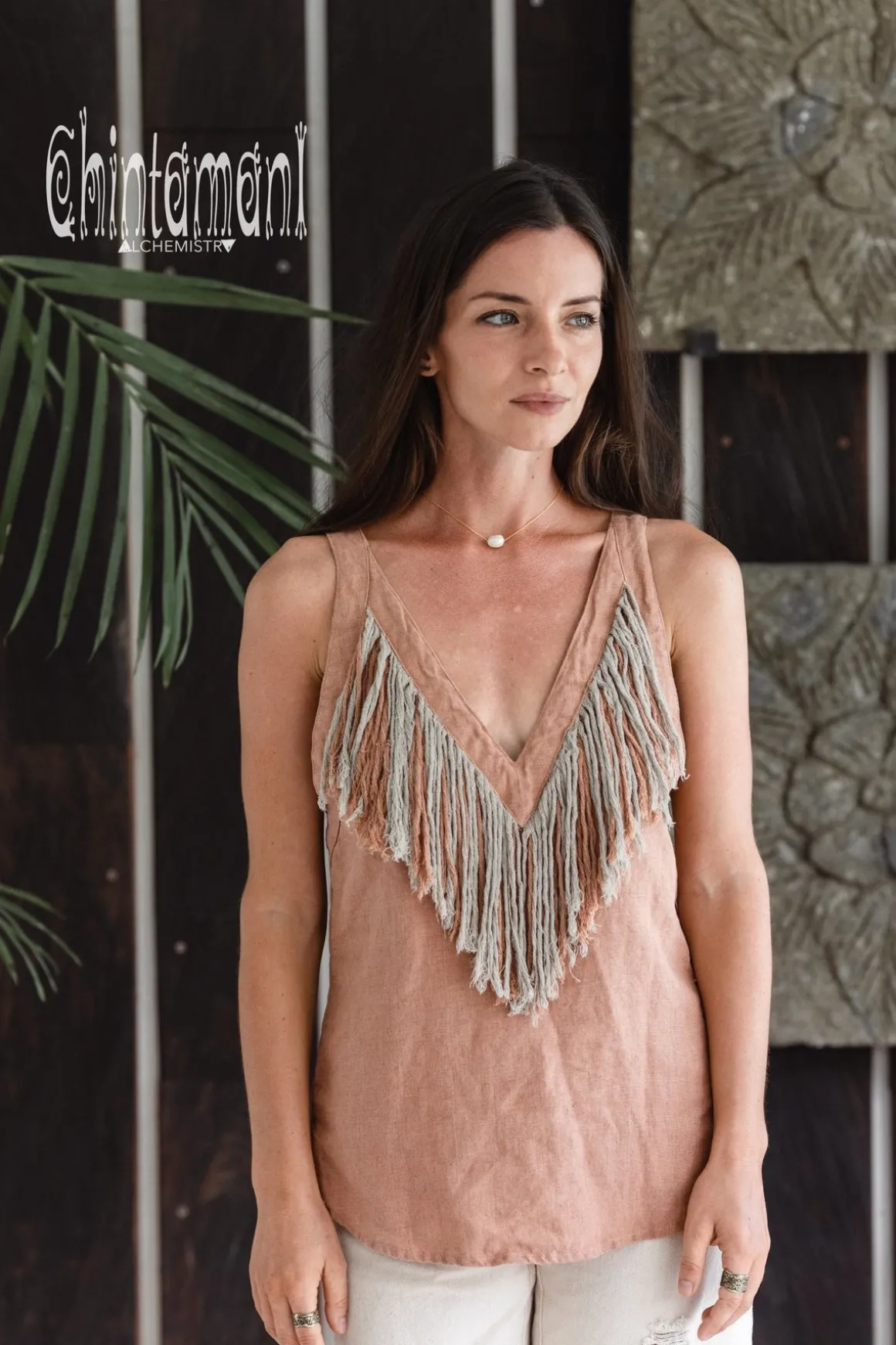 Alma Libra V-Back Top is a unique bohemian tank top, decorated with stunning linen fringes along the neckline. This very original, both tribal and bohemian decorative element is made from strong and thick linen so that the fringe does not wear off and entangle too soon. The back of the Top is also quite amazing – there is a deep triangular v-cut which is secured by the connecting strap. This way your back is displayed, but nothing is exposed, and both shoulder straps stay on their place. This little artefact is available in various beautiful colors – raw unbleached grey, off-white, dusty pink, red ochre and classy black. The decorative fringe combines the main color of the Top and raw grey linen color. Alma Libra Open Back Top creates instant boho chic look if you pair it up with any long skirt or distressed jeans, but there is also a special Alma Libra skirt from our new collection that combines with Open Back Top into breathtaking festival ensemble.