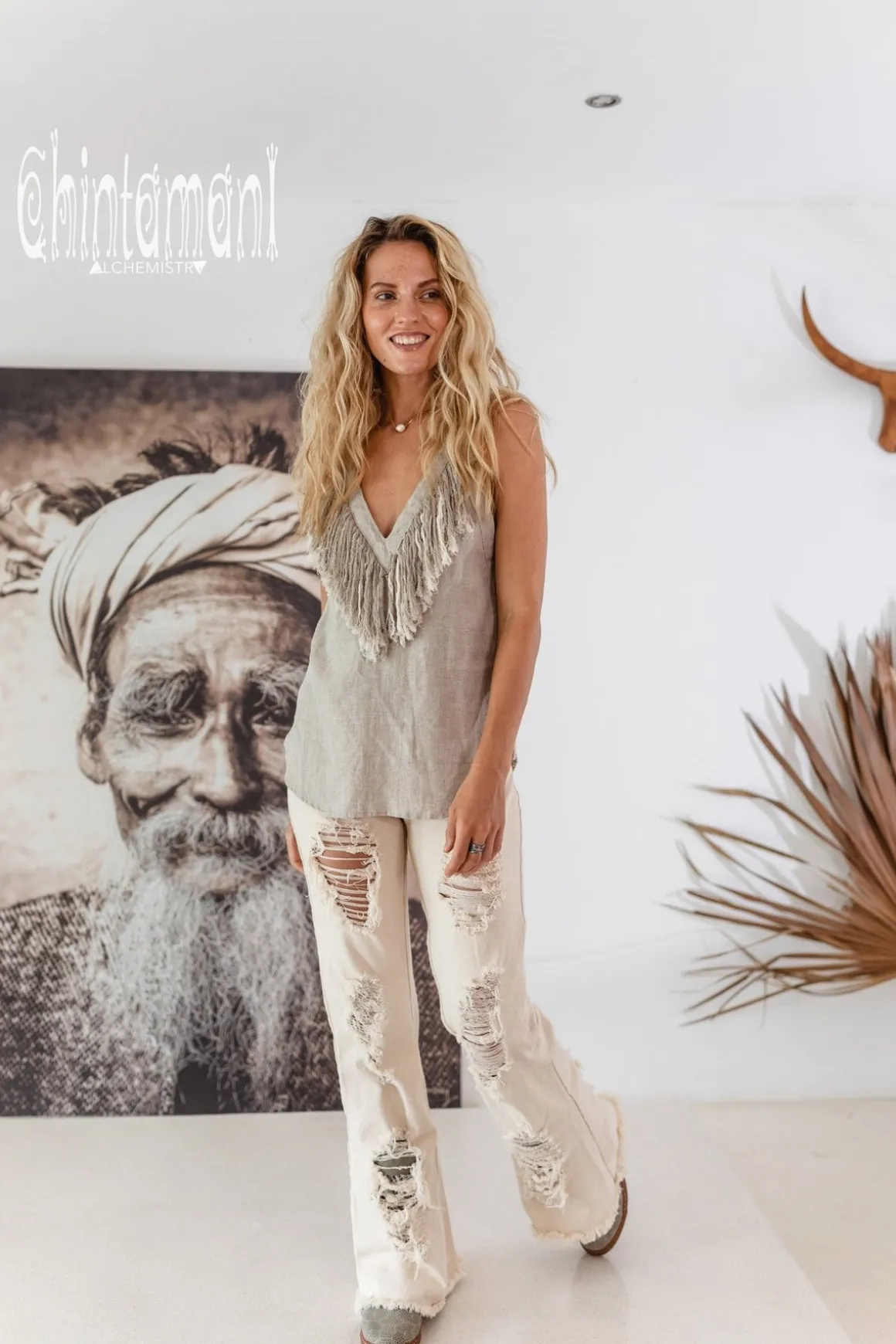 Alma Libra V-Back Top is a unique bohemian tank top, decorated with stunning linen fringes along the neckline. This very original, both tribal and bohemian decorative element is made from strong and thick linen so that the fringe does not wear off and entangle too soon. The back of the Top is also quite amazing – there is a deep triangular v-cut which is secured by the connecting strap. This way your back is displayed, but nothing is exposed, and both shoulder straps stay on their place. This little artefact is available in various beautiful colors – raw unbleached grey, off-white, dusty pink, red ochre and classy black. The decorative fringe combines the main color of the Top and raw grey linen color. Alma Libra Open Back Top creates instant boho chic look if you pair it up with any long skirt or distressed jeans, but there is also a special Alma Libra skirt from our new collection that combines with Open Back Top into breathtaking festival ensemble.