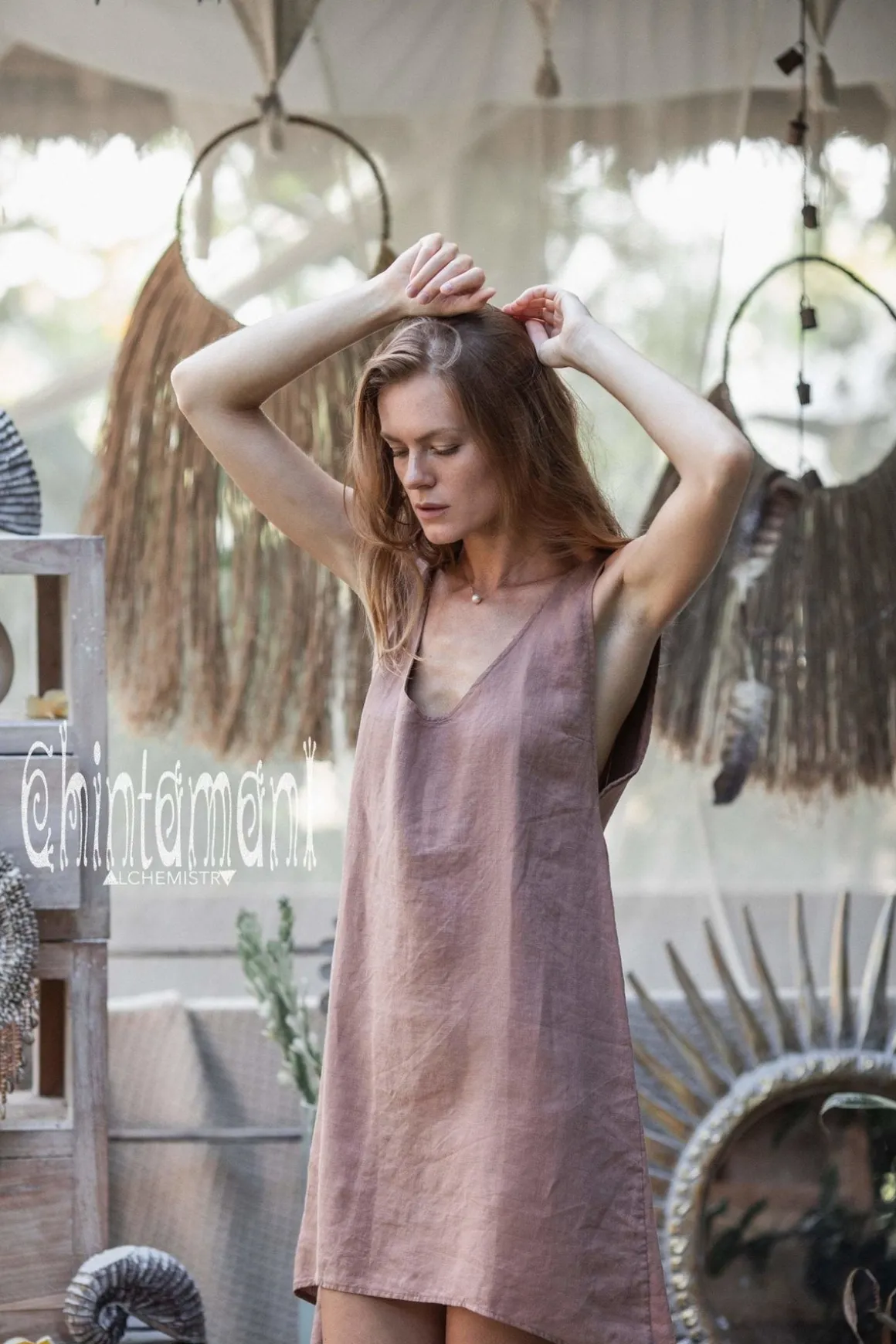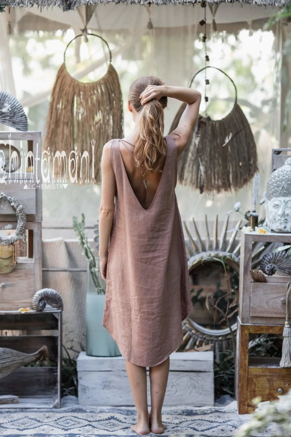 Stunning open back linen dress in dusty rose color from our limited collection comes in two amazing fabrics – noble and durable 100% linen, or luxurious, divinely soft natural silk. It’s sophisticated silhouette shows off your back in a quite sensual way. Although, don’t worry – specially designed lacing with an amazing brass big feather pendant will keep the dress from sliding from your shoulders unexpectedly. As all our tunic dresses, it has our signature designer twist – it is little shorter in the front and longer in the back. A very convenient detail – the bosom of this tank dress is double layered, so you can wear it without any bra, for that very special sensation of soft caress and freedom of natural silk or linen! In fact, the feel of this little masterpiece on your skin is as good, as the looks of it in the mirror!