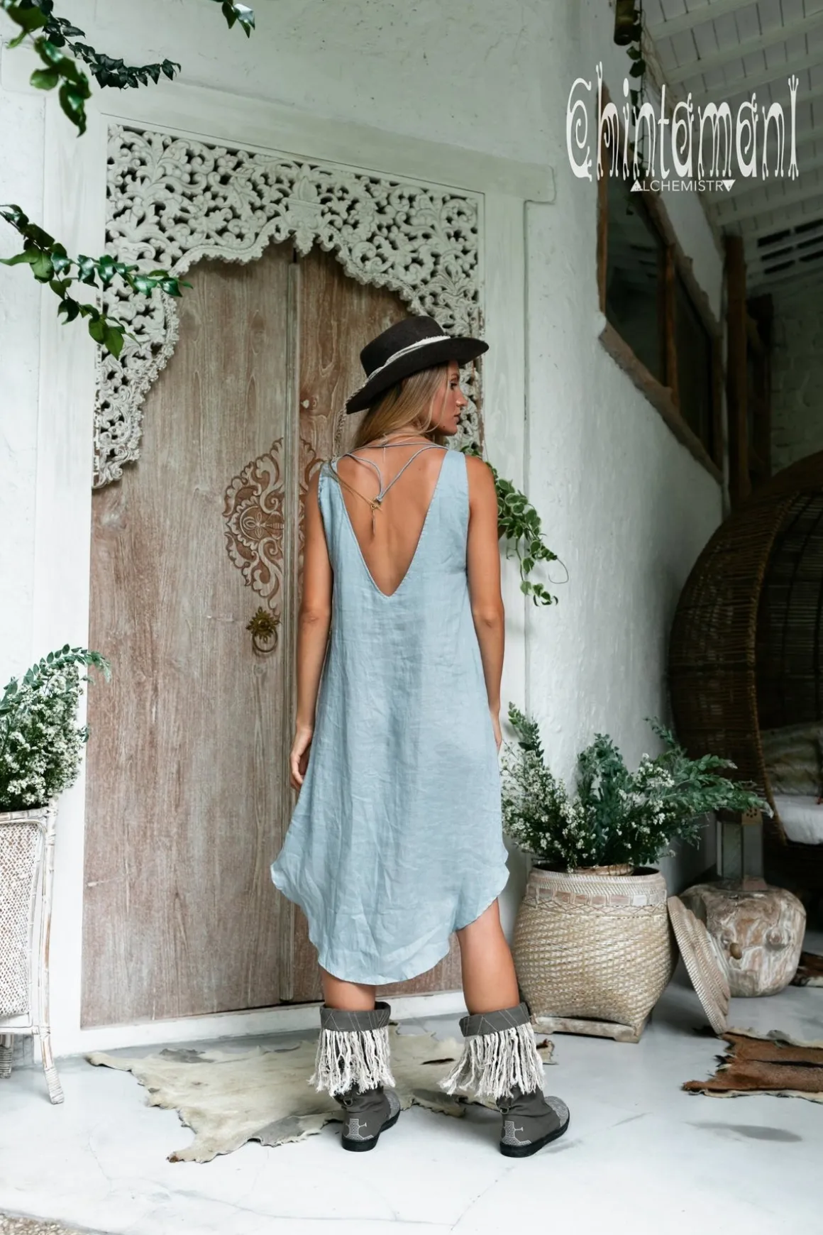 Stunning open back light blue linen dress from our limited collection comes in two amazing fabrics – luxurious, divinely soft natural silk, or noble and durable 100% linen. It’s sophisticated silhouette shows off your back in a quite sensual way. Although, don’t worry – specially designed lacing with an amazing brass big feather pendant will keep the dress from sliding from your shoulders unexpectedly. As all our tunic dresses, it has our signature designer twist – it is little shorter in the front and longer in the back. A very convenient detail – the bosom of this tank dress is double layered, so you can wear it without any bra, for that very special sensation of soft caress and freedom of natural silk or linen! In fact, the feel of this little masterpiece on your skin is as good, as the looks of it in the mirror!
