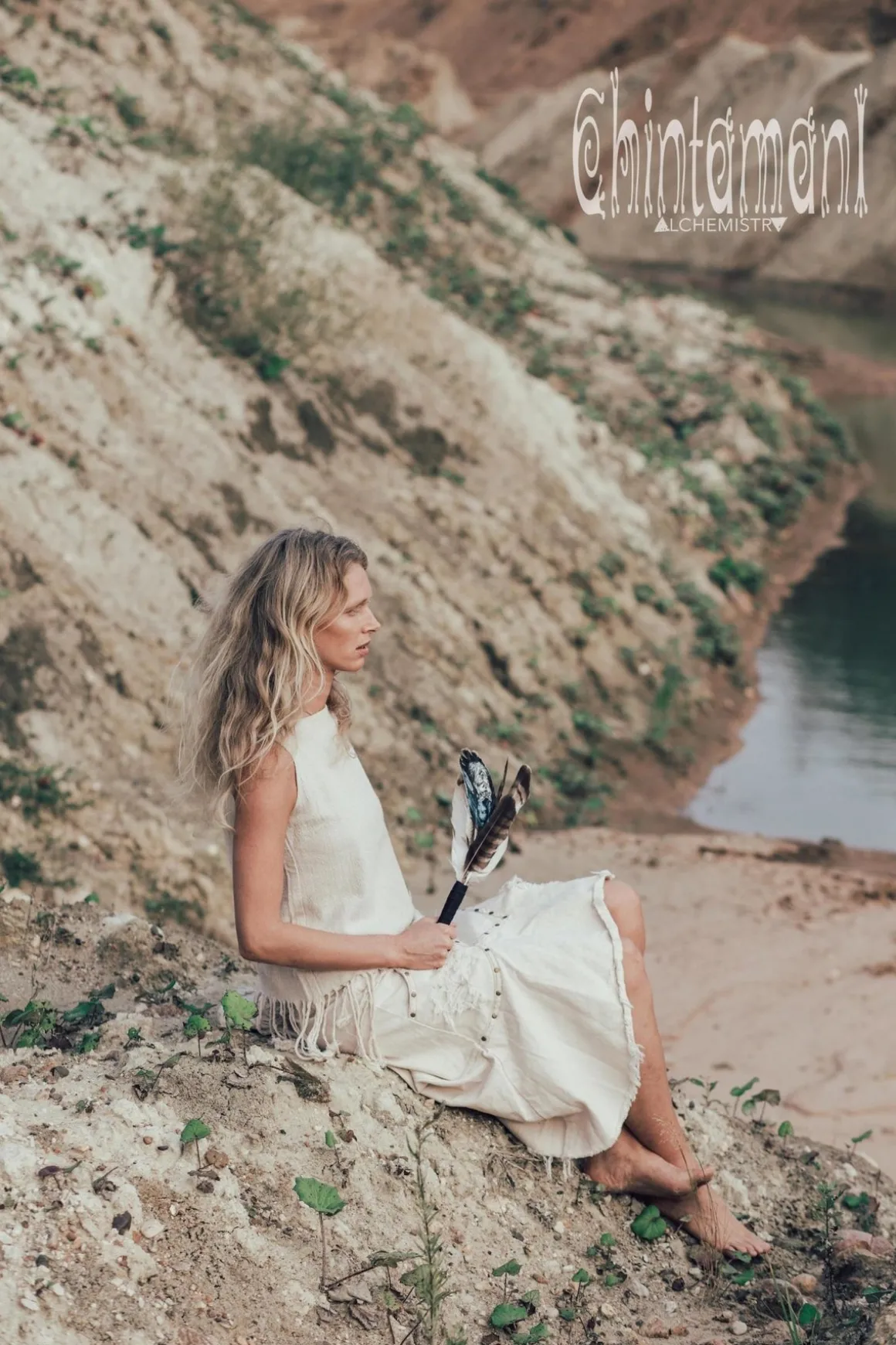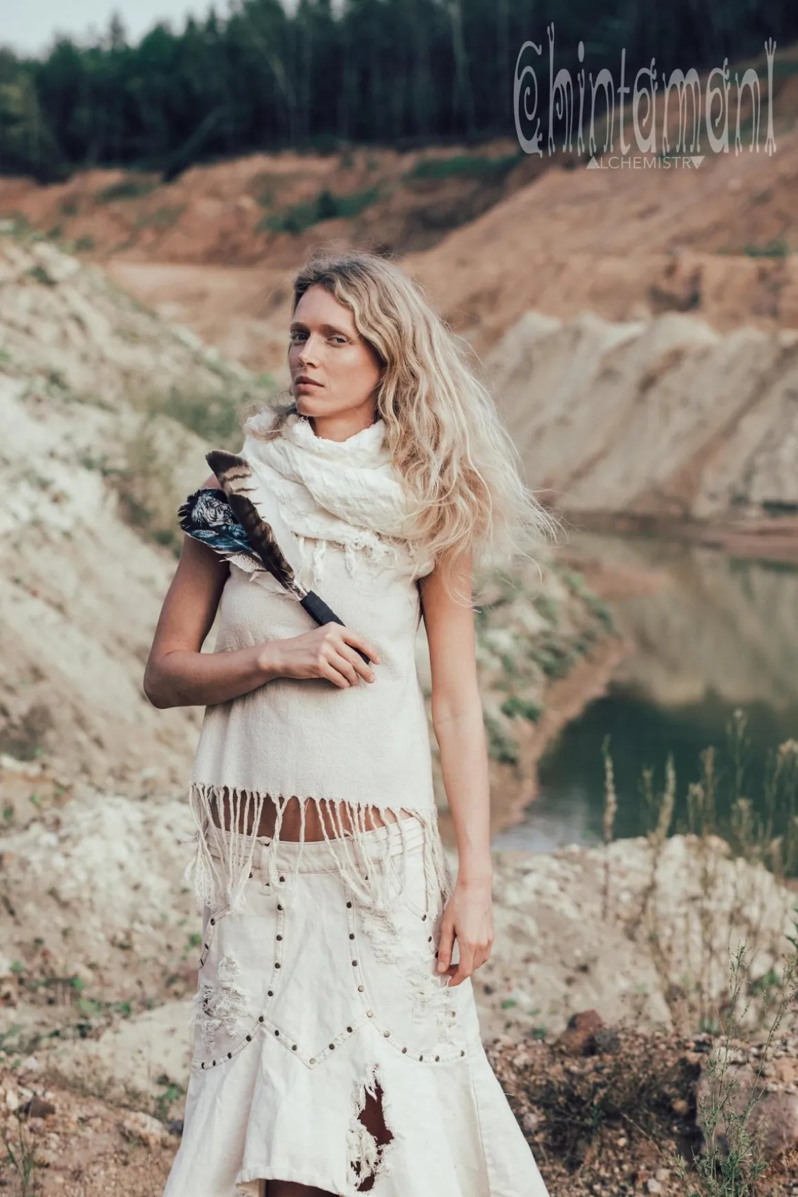 Bleached Denim Skirt is a very special item for jeans lovers, who want to add boho feminine touch to their wardrobe. This garment is low fit and looks especially good with our fringe tops and cotton canvas boots. For creating this boho skirt we use 100% cotton denim made in small factories in Indonesia. It is stone washed for extra softness, artistically ripped, bleached and decorated with clips to appear as an exclusive, one of a kind designer product.