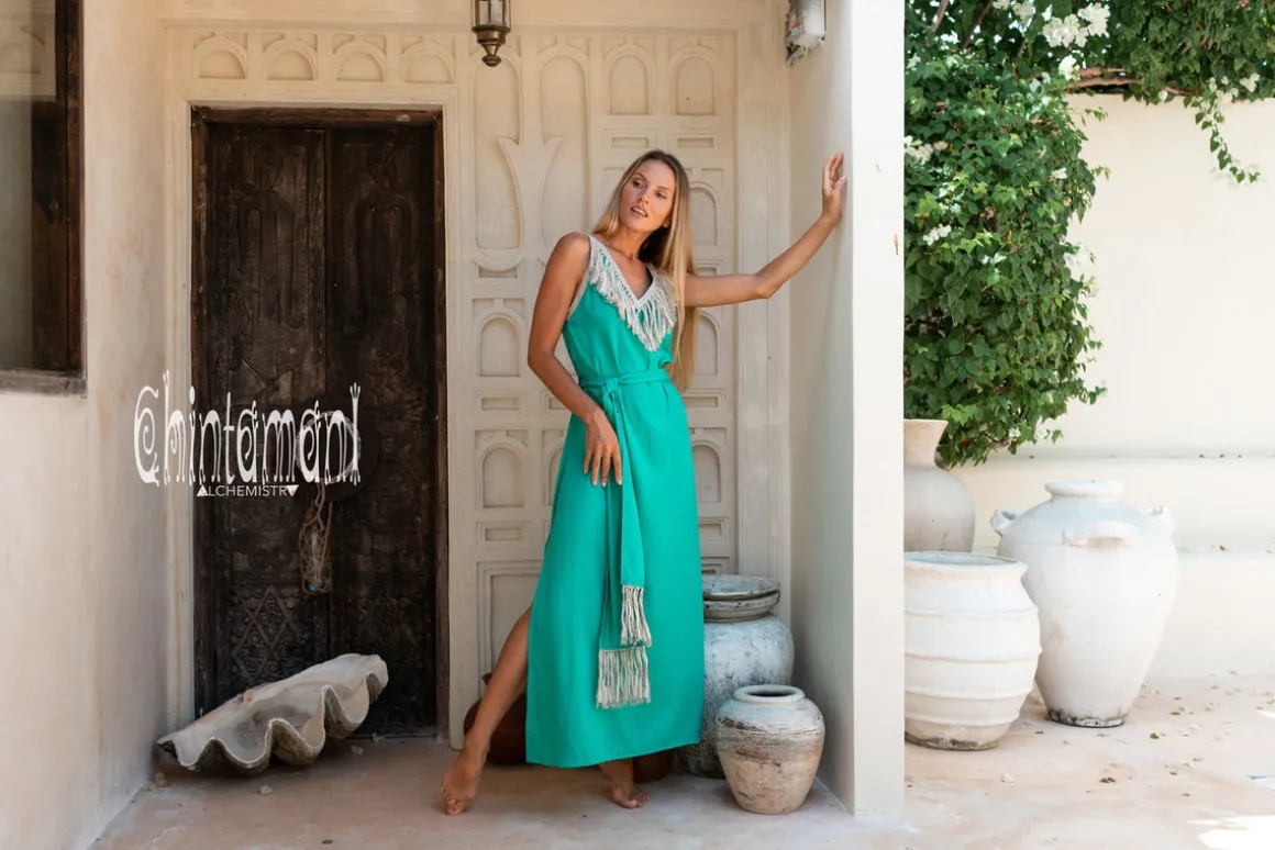 Long Cotton Dress is a divine artefact from our new collection. The silhouette is floaty and simple, with two slits on the sides – so that the dress looks very classy and elegant. Fringe decoration on the v-neck and amazing long belt with fringes adds original boho chic accent, that we love so much. Soft natural Cotton fabric is very airy and moves around your body amazingly, when you walk or dance in this dress. Just a perfect goddess wear, that reminds of sunny ancient Greece and the Youth of this world.