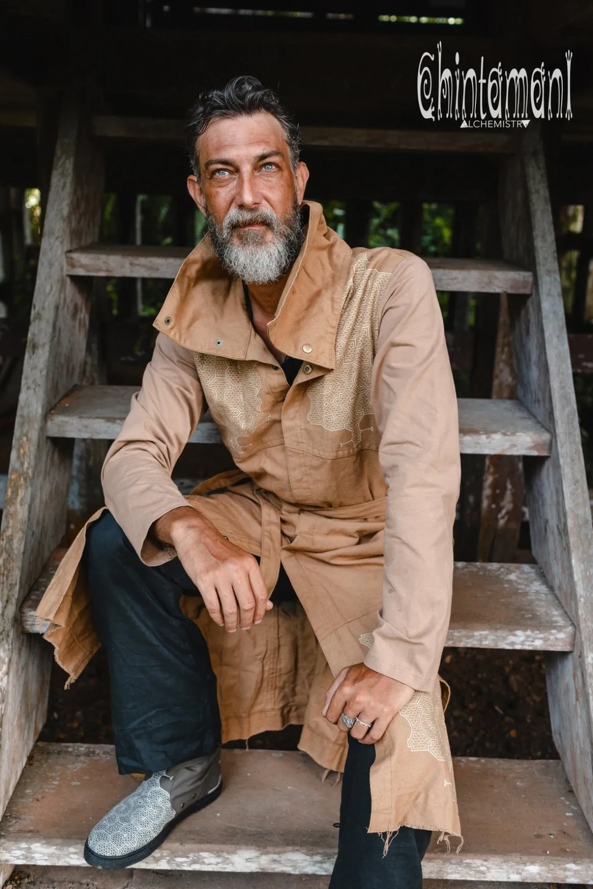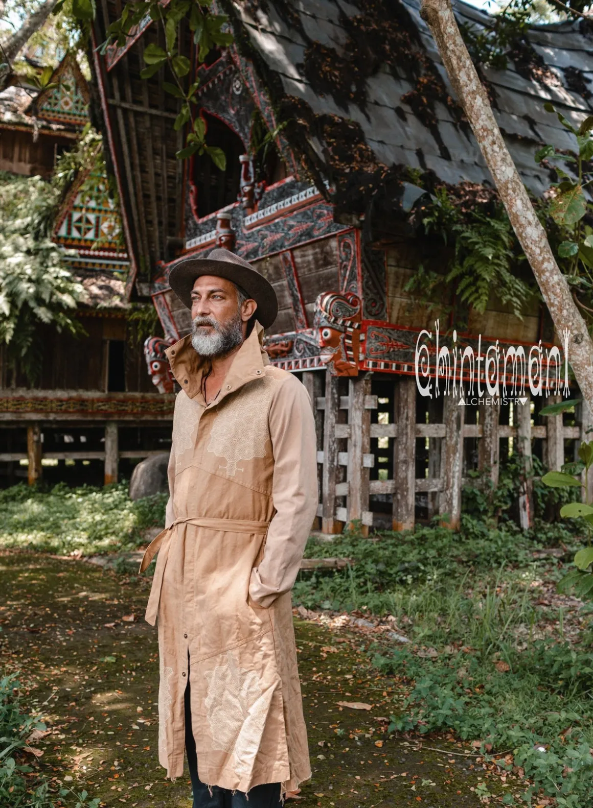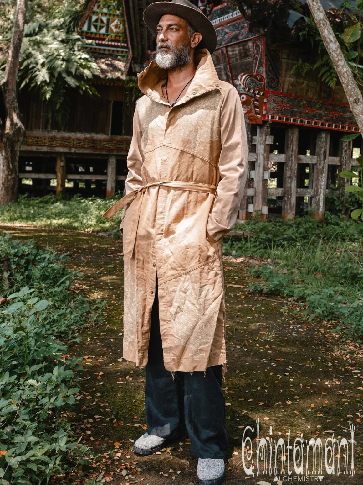 Shipibo print Canvas Coat is an original outerwear from our Men’s collection. It is made from soft cotton canvas and decorated with ethnic Shipibo-conibo screen printed patterns. Very long sleeves and high collar add to the coziness of the model, while strait classy silhouette creates very casual feeling to it, just with a little tint of boho details. Amidst those details we can name our signature brass feather pendants and beautiful Balinese dragon head buckle on the belt. This coat fits better on a slender and not very tall figure. It combines nicely with jeans, strait pants and boots, especially Chintamani Alchemistry boots with similar Shipibo patterns. It is quite light, so will be good in autumn and spring or during the cool northern summer. It can become an awesome festival costume, while also serve as original artsy citywear. The piece is quite durable – you can wash it in the washing machine, but on the light cycle and without twisting.