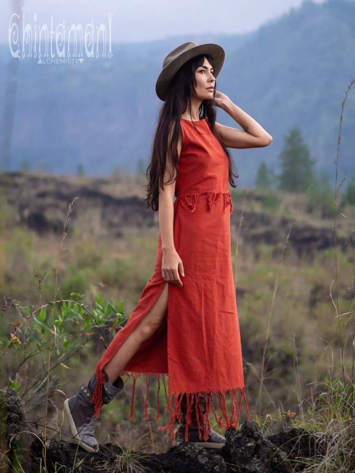 Raw Cotton Sleeveless Long Boho Dress with two layers of fringe. Unfussy and simple, yet gorgeous, this maxi dress can be worn as a casual boho garment, but with the right accessories it can also become an impressive outfit for a special occasion. Fully handmade in raw natural 100% cotton to create that classic bohemian feminine look. Pair this organic goddess dress with sandals, cotton canvas Chintamani Alchemistry boots or simply go barefoot.