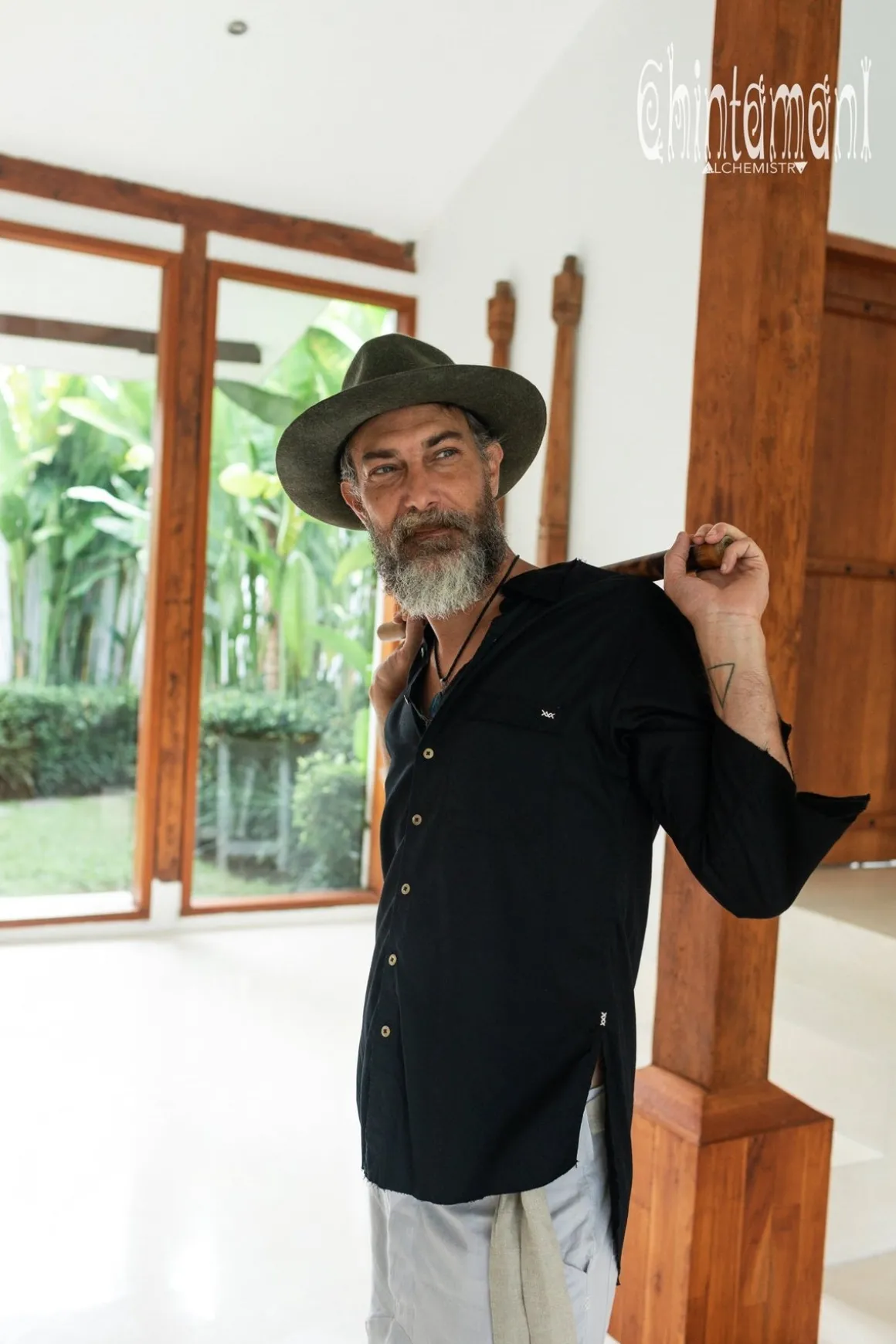 Man Cotton Shirt with Ripped Sleeves is a classy and nonchalant outfit for a very artistic bohemian look. It is made of soft, durable and pleasant to wear Cotton fabric, that will last for years with proper care. The fitting is quite tight, so choose a size bigger for more comfortable loose fit. Along with very elegant cut, this piece has a bunch of amazing handmade details, that make it look really unique. The open hemline, ripped edges on the collar and pocket and ripped 34 sleeves create subtle boho accents. Do not worry, the raw edges are specially stitched and secured to stay just like this, even after you wash this piece. We use beautiful brass buttons for this shirt. The slits on the sides and front pocket are decorated with handmade primitive embroidery to create that feeling of a garment, made by loving hands specially for you. Which is actually true with all Chintamani Alchemistry clothes!