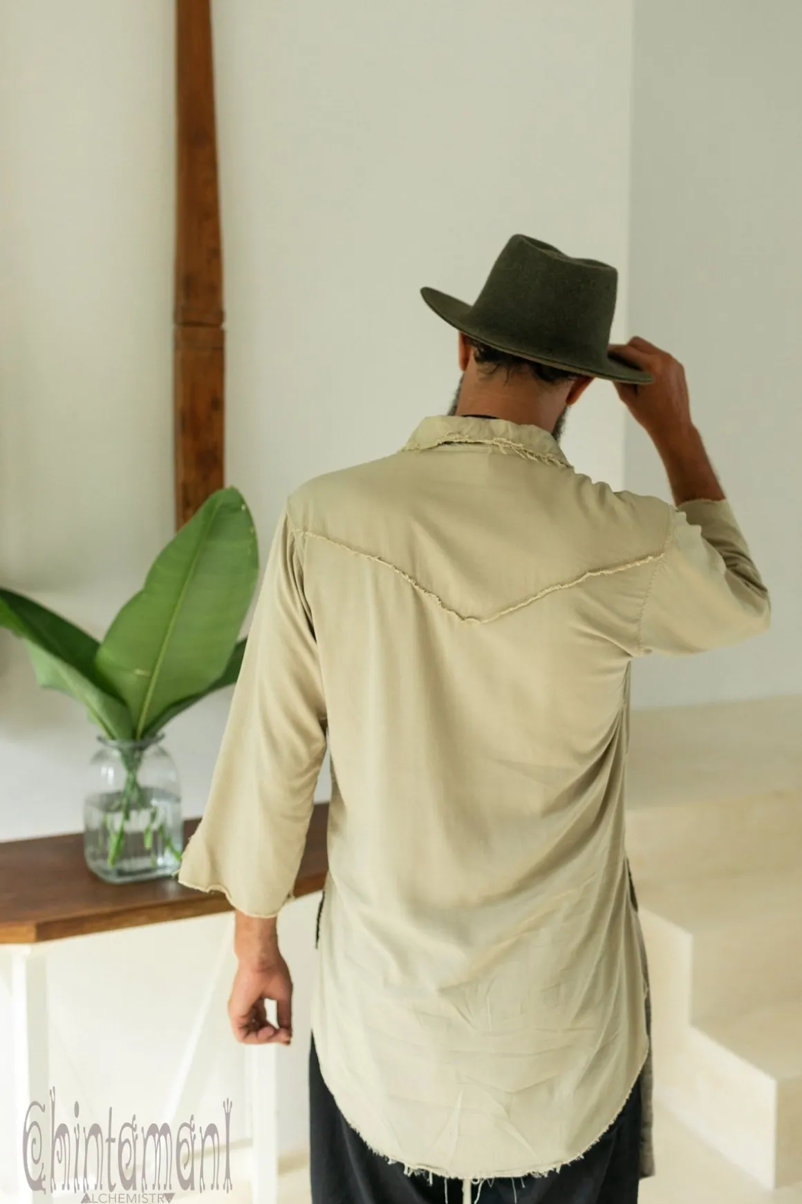Man Cotton Shirt with Ripped Sleeves is a classy and nonchalant outfit for a very artistic bohemian look. It is made of soft, durable and pleasant to wear Cotton fabric, that will last for years with proper care. The fitting is quite tight, so choose a size bigger for more comfortable loose fit. Along with very elegant cut, this piece has a bunch of amazing handmade details, that make it look really unique. The open hemline, ripped edges on the collar and pocket and ripped 34 sleeves create subtle boho accents. Do not worry, the raw edges are specially stitched and secured to stay just like this, even after you wash this piece. We use beautiful brass buttons for this shirt. The slits on the sides and front pocket are decorated with handmade primitive embroidery to create that feeling of a garment, made by loving hands specially for you. Which is actually true with all Chintamani Alchemistry clothes!