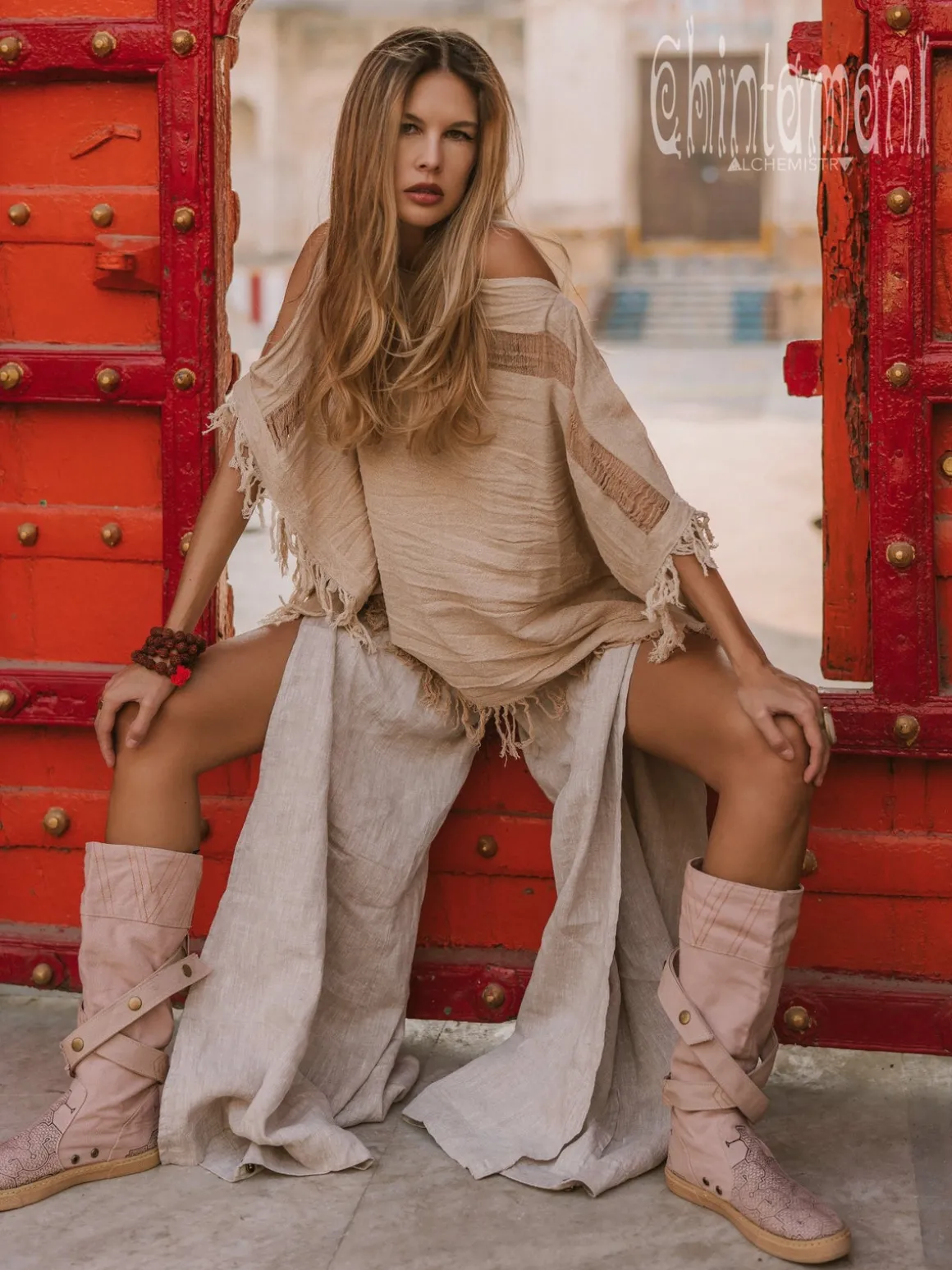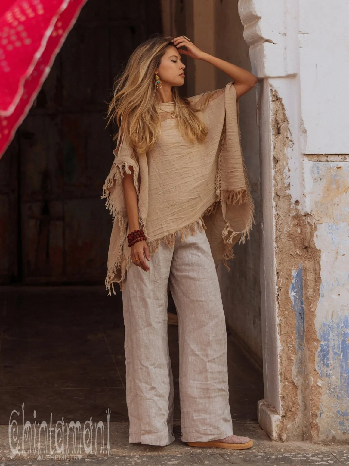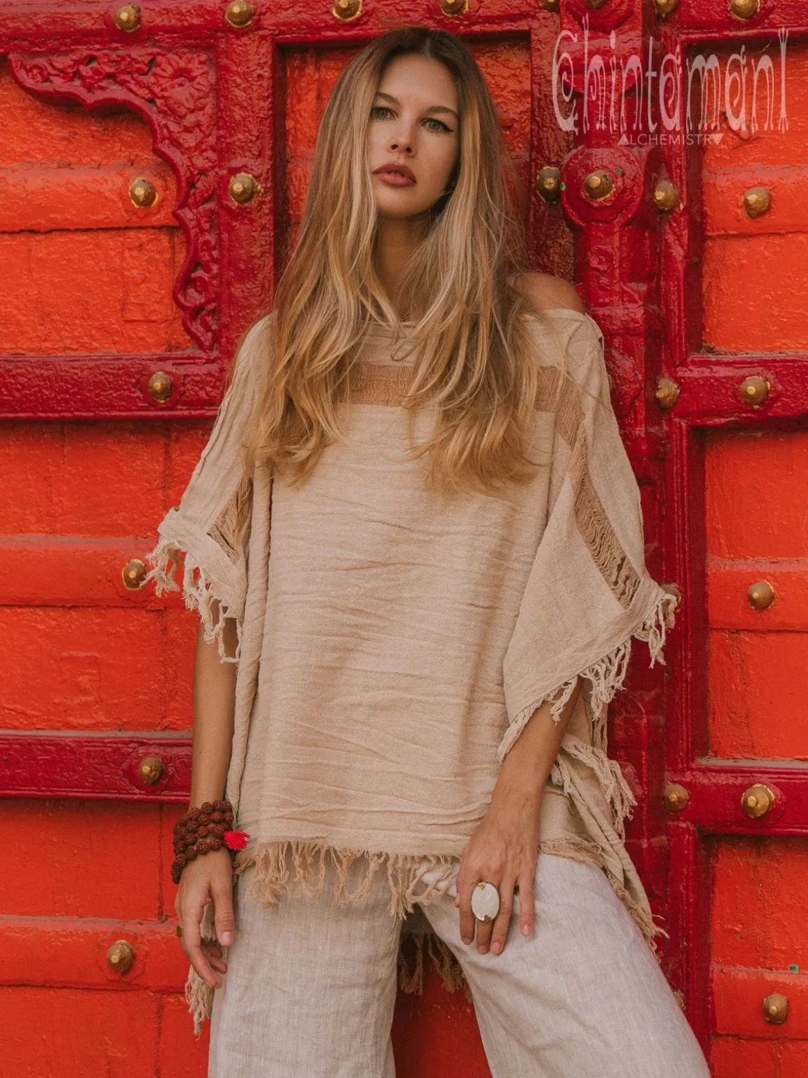 Free Size Bohemian Poncho Top is our universal option, as its open structure and off shoulder design will fit absolutely anybody. It combines raw feeling of beautiful handwoven soft and natural raw cotton with handmade fringes, open edges and decorative removed threads elements to appear as truly bohemian artefact. Carelessly beautiful, this flowing tunic can be combined with skirts or shorts, jeans or trousers. We recommend wearing it with little white or beige bandeau underneath, as transparent decorative stripes on the fabric and open sides of this poncho can be revealing. But be sure it doesn’t fall off or reveal too much – there are side straps to keep the bottom hemline together. The Poncho Top is available in beige and off white colors, as well as white with fern green stripes.