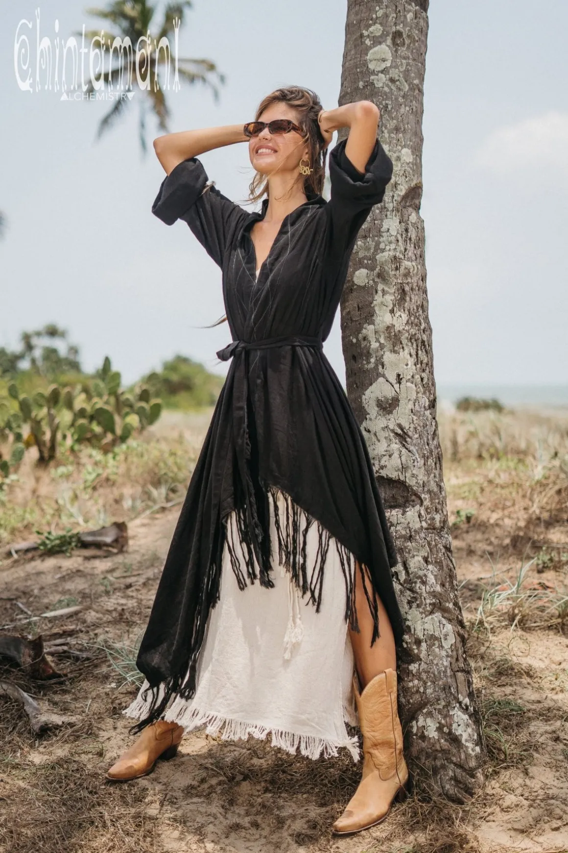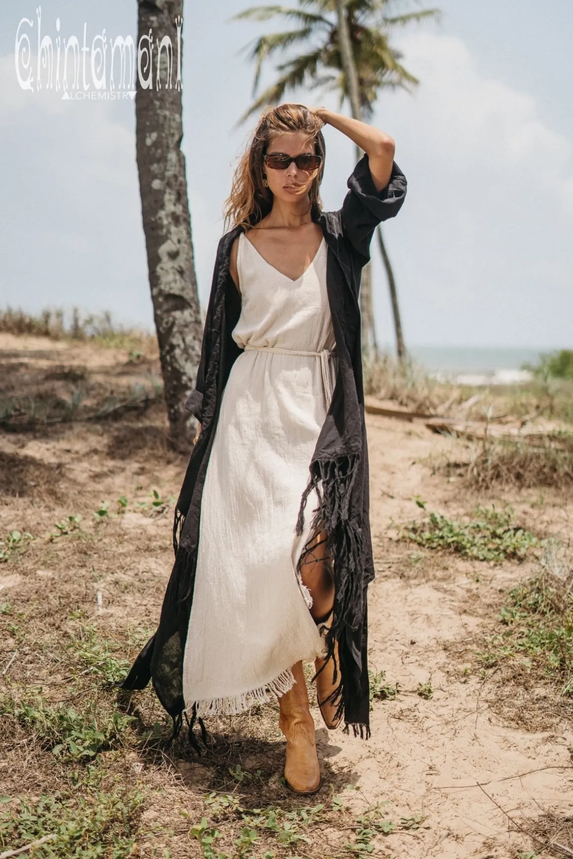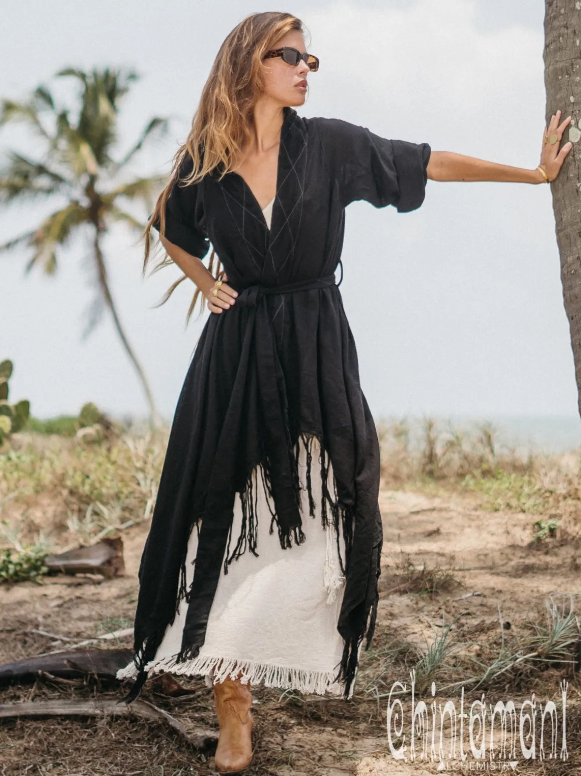 This gorgeous Asymmetric Kimono Cardigan is one of a kind creation, which we are extremely proud of. It is a universal piece – it can be used as a ready festival outfit or as a gorgeous addition to evening dress. It looks very bohemian with long skirt, but becomes a classy artistic coat if worn with jeans. The fabric of this piece, hand woven natural cotton, made in small batches in indian homes, is considered to be a national heritage. It is very light, breathable material, that look stunningly organic and raw. The kimono wrap top is adorned with hand stitched patterns and extremely long fringe. It comes in one free size and can be shaped in different forms by a beautiful decorated belt. It also can be worn as a royal kaftan mantle, creating that amazing flow of fabric while you move!