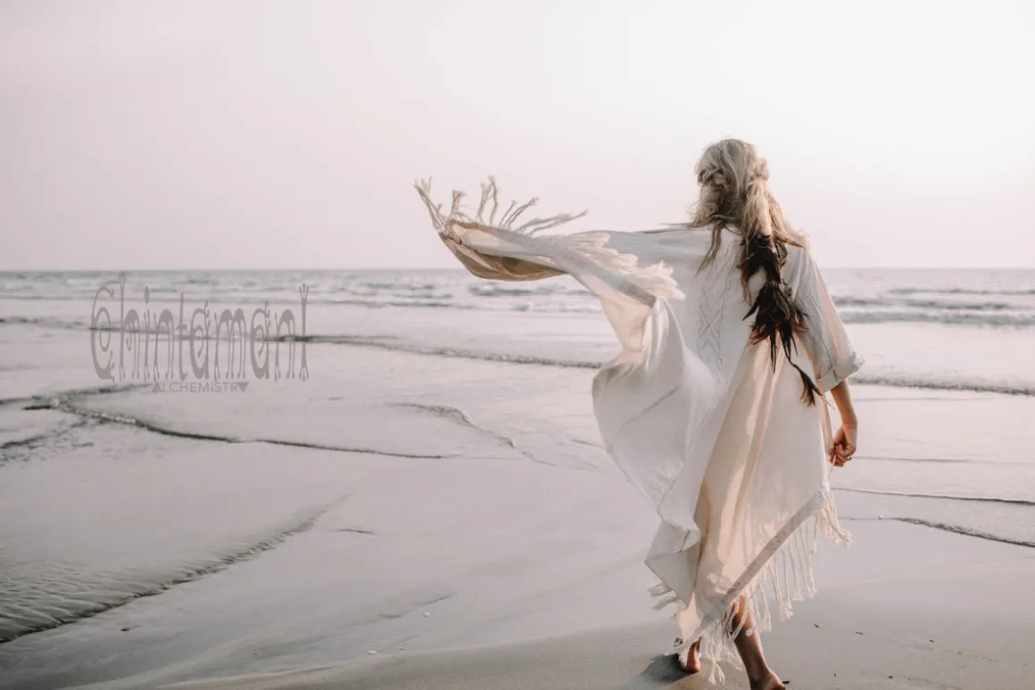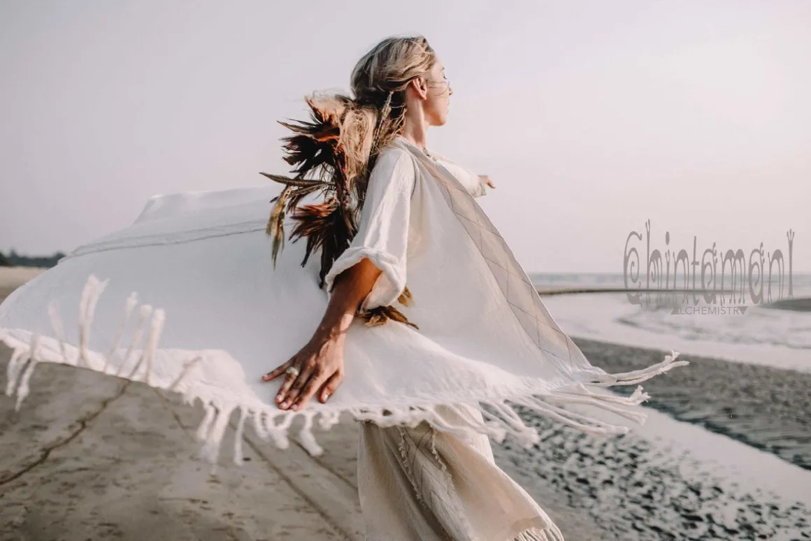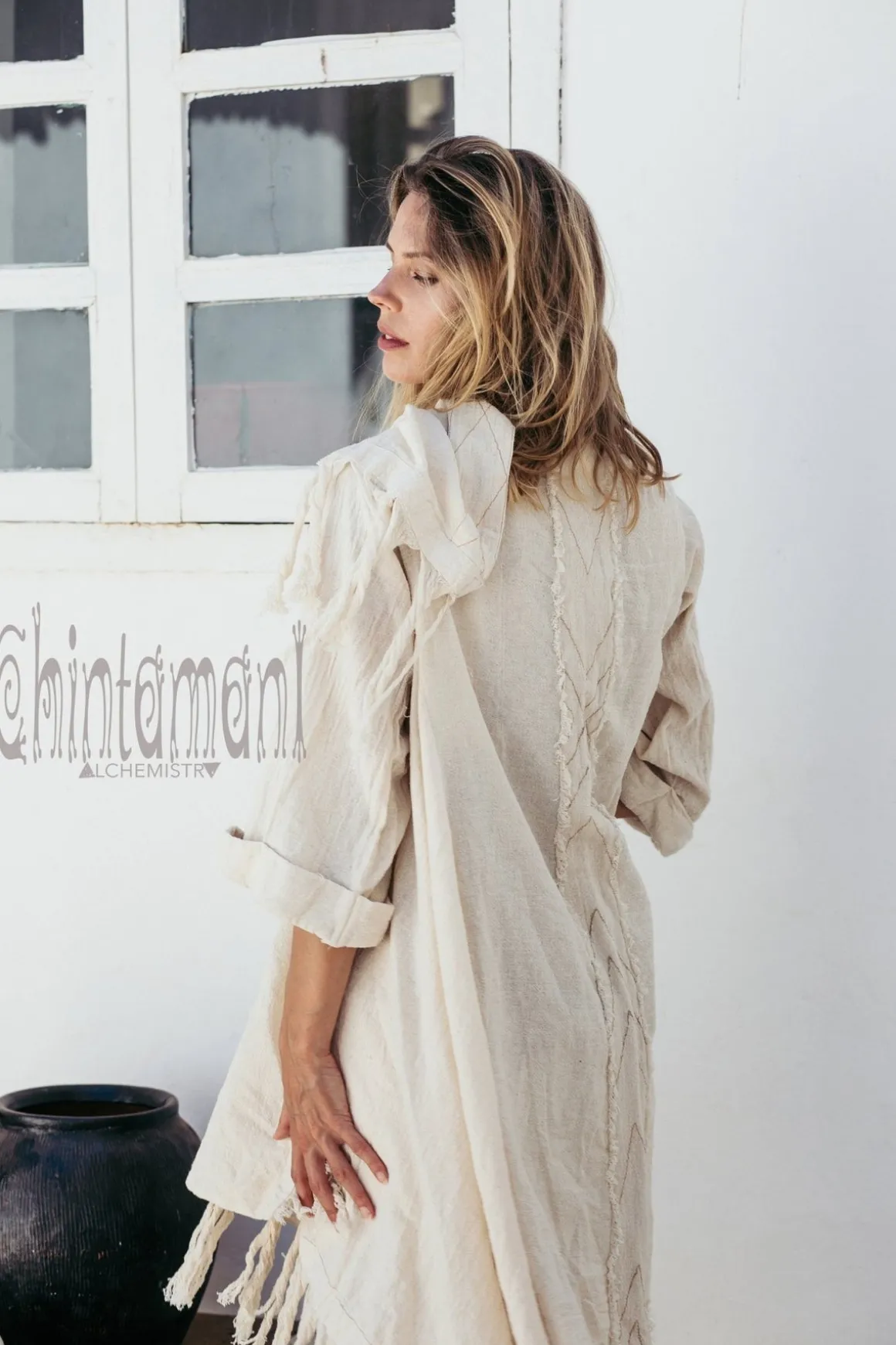 This gorgeous Asymmetric Kimono Cardigan is one of a kind creation, which we are extremely proud of. It is a universal piece – it can be used as a ready festival outfit or as a gorgeous addition to evening dress. It looks very bohemian with long skirt, but becomes a classy artistic coat if worn with jeans. The fabric of this piece, hand woven natural cotton, made in small batches in indian homes, is considered to be a national heritage. It is very light, breathable material, that look stunningly organic and raw. The kimono wrap top is adorned with hand stitched patterns and extremely long fringe. It comes in one free size and can be shaped in different forms by a beautiful decorated belt. It also can be worn as a royal kaftan mantle, creating that amazing flow of fabric while you move!