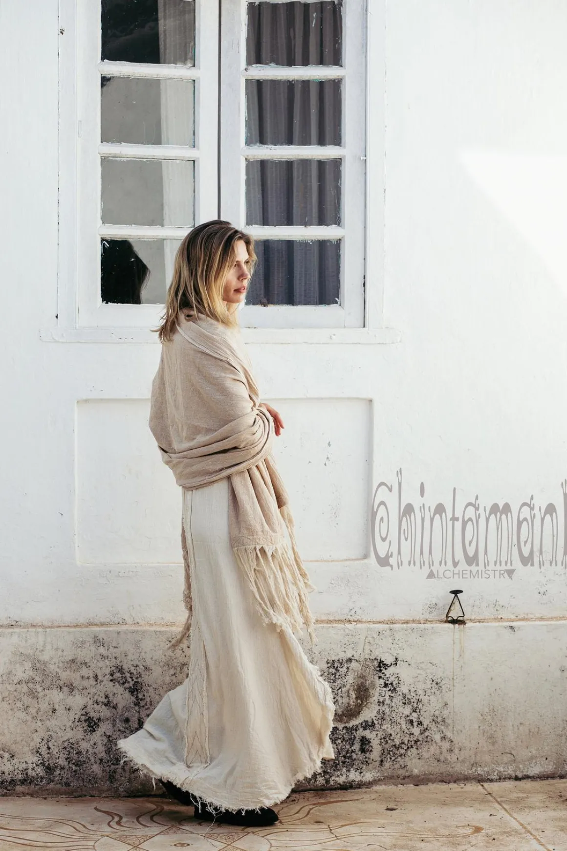 Stately gorgeous Huge Boho Shawl Wrap is a versatile creation of Chintamani Alchemistry, that can serve you so many ways in your travels and at home. Its remarkable size (1 by 2 meter of pure handwoven raw cotton) makes for countless options. This oversized scarf can be a turban, a blanket, a wrap dress, a mantle, a beach sarong, an ultimate protection from sun and wind – natural cotton is a magic breathable material that can resist even desert heat. The item comes in two distinctive colors of our Raw cotton collection – off white and unbleached beige. Amazing decorative super long fringe will add boho chic detail to anything you create from our Shawl. Of course, it will look stunning just royally residing on your shoulders as well!