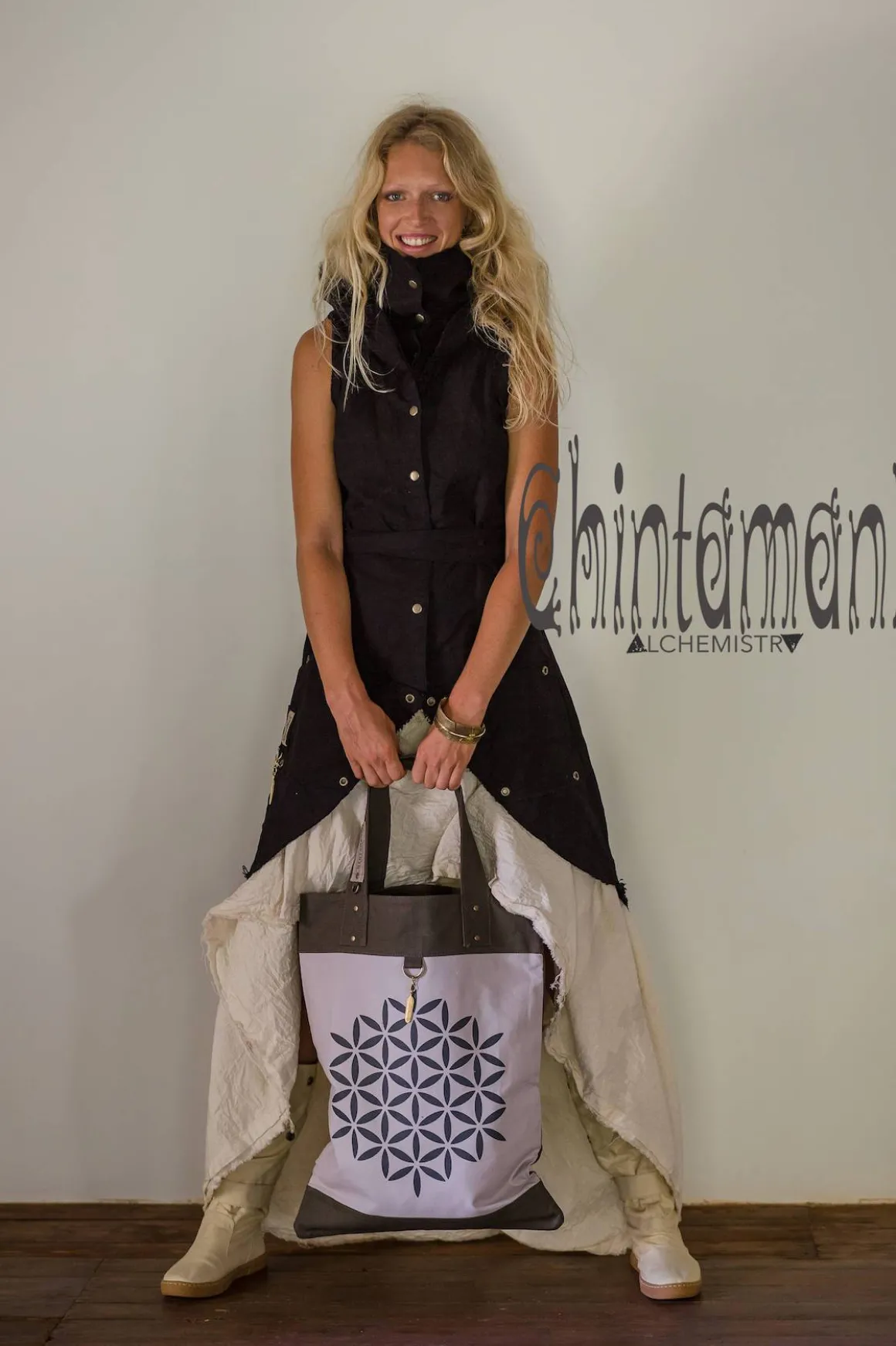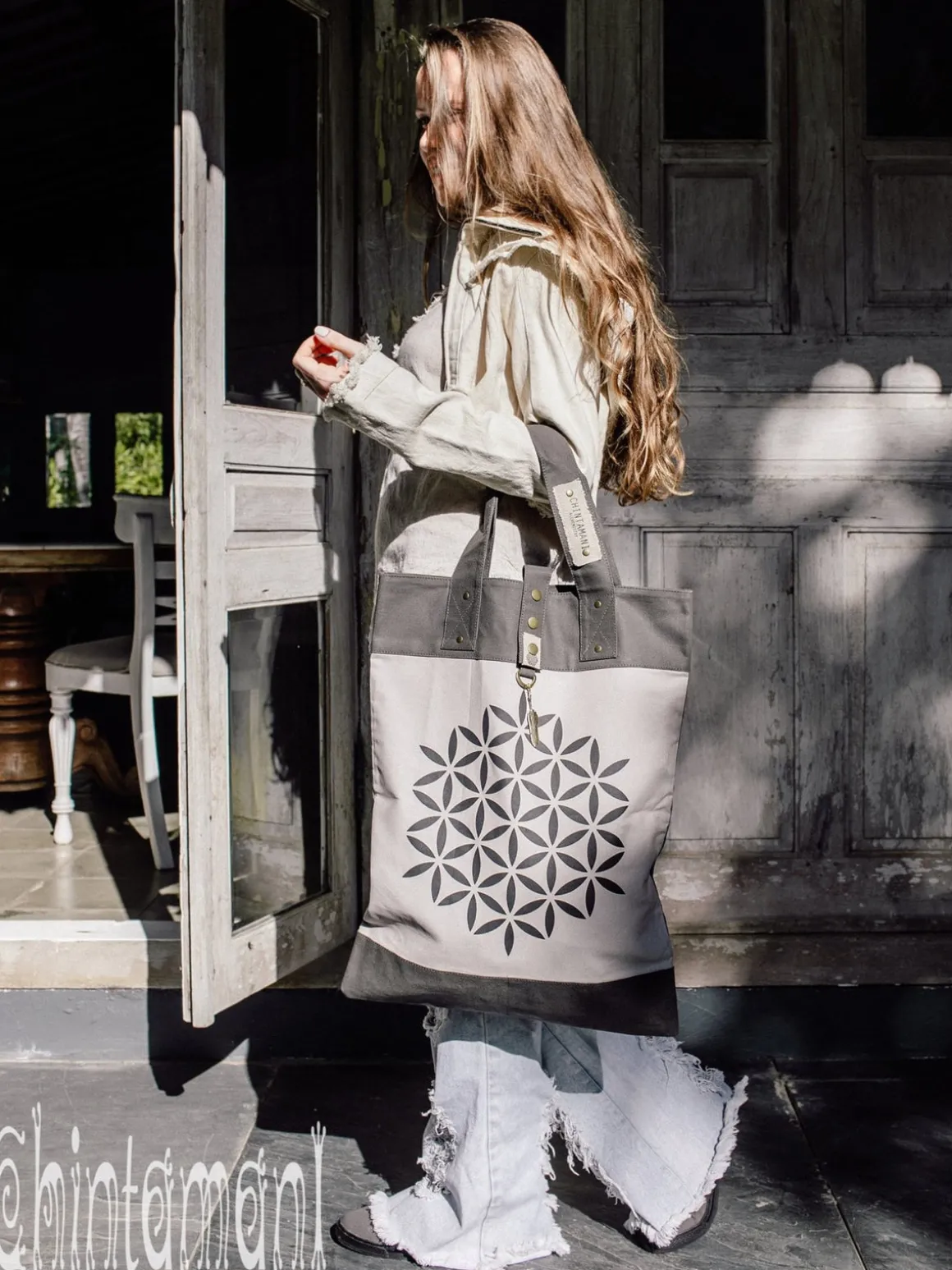 Beautiful Cotton Canvas Tote Bag is a simple and handy accessory for everyday shopping. Why use single use plastic bags from the shops when you can opt for this gorgeous reusable alternative! The handles are very strong – so you can be confident about filling it up. It has a secure inside pocket for your keys and wallet. As with all our bags, this stunning Shoulder Bag is decorated with handmade Sacred Geometry screen prints. For this model we use the ancient Flower of Life pattern. The lock of the bag comes with our little pendant compliment – decorative brass feather Made in Love by our artisanal workshop on Bali.