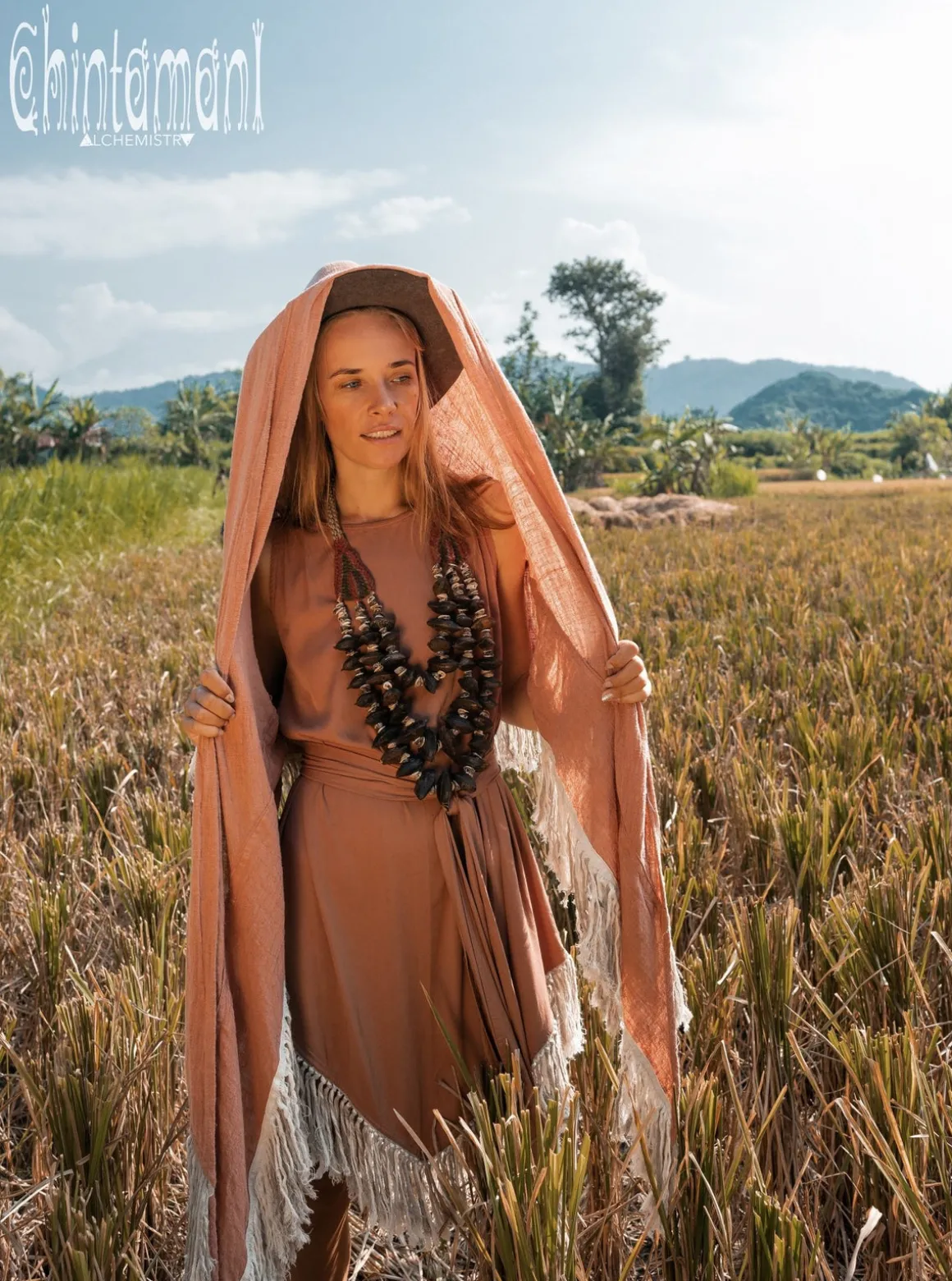 Ultimately bohemian Alma Libra Fringe Shawl is a beautiful accessory for chilly evenings. It is made of soft raw cotton and decorated with two rows of the signature Alma Libra collection linen fringe, so long, fluffy and unique. This wrap boho shawl is quite easy to style – just through it around you neck, and the boho chic look is ready. But if you take a little more time and effort, it can also become a gorgeous turban – a real oriental princess crown! Natural 100% pure cotton makes this scarf very light and pleasant to wear even in hot weather. We make them in shiny cream-white, pink or classy black color, the second option is unisex – so that you can get one for you and your partner as well. This little artifact is so much us – light, feathery, soft and original!