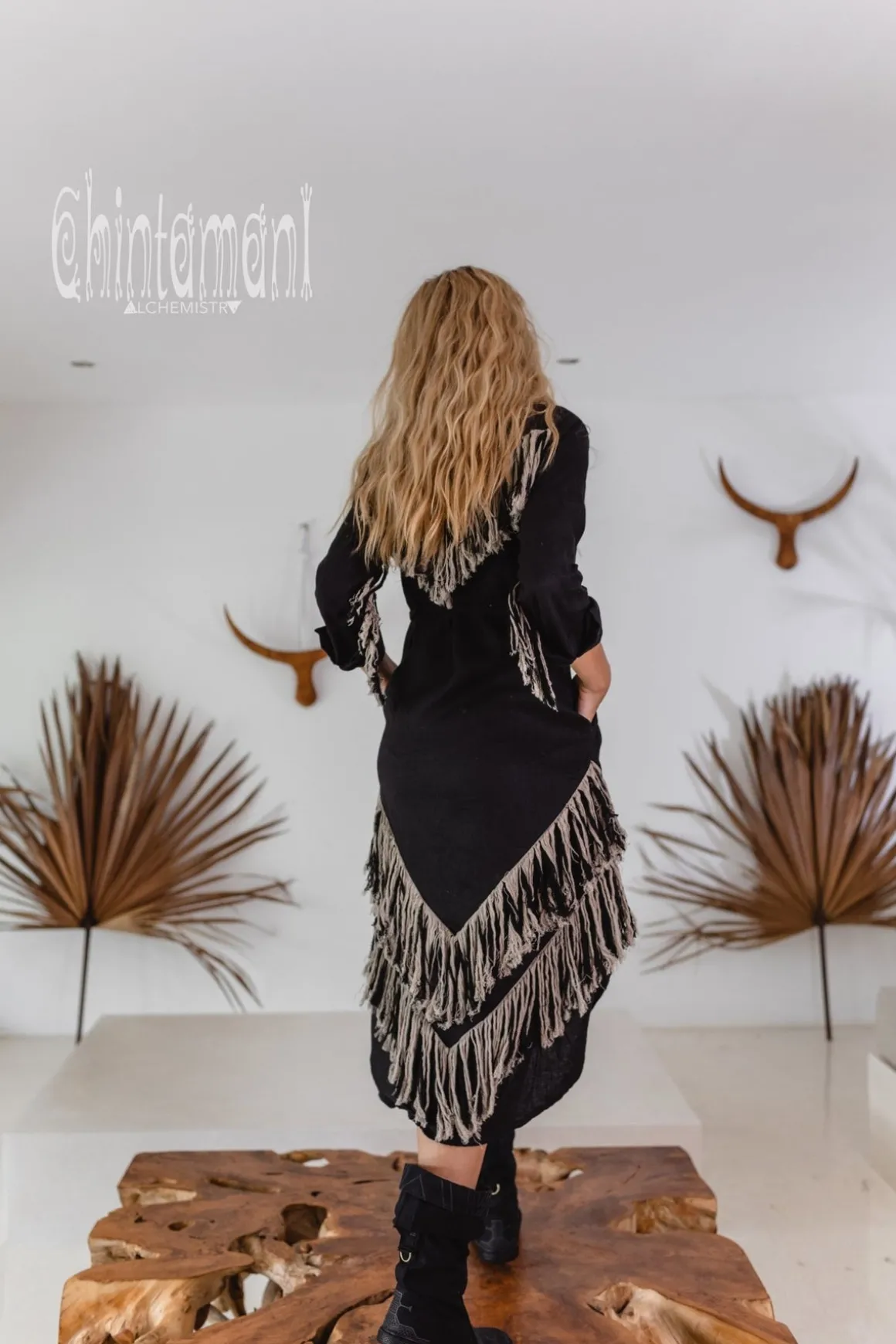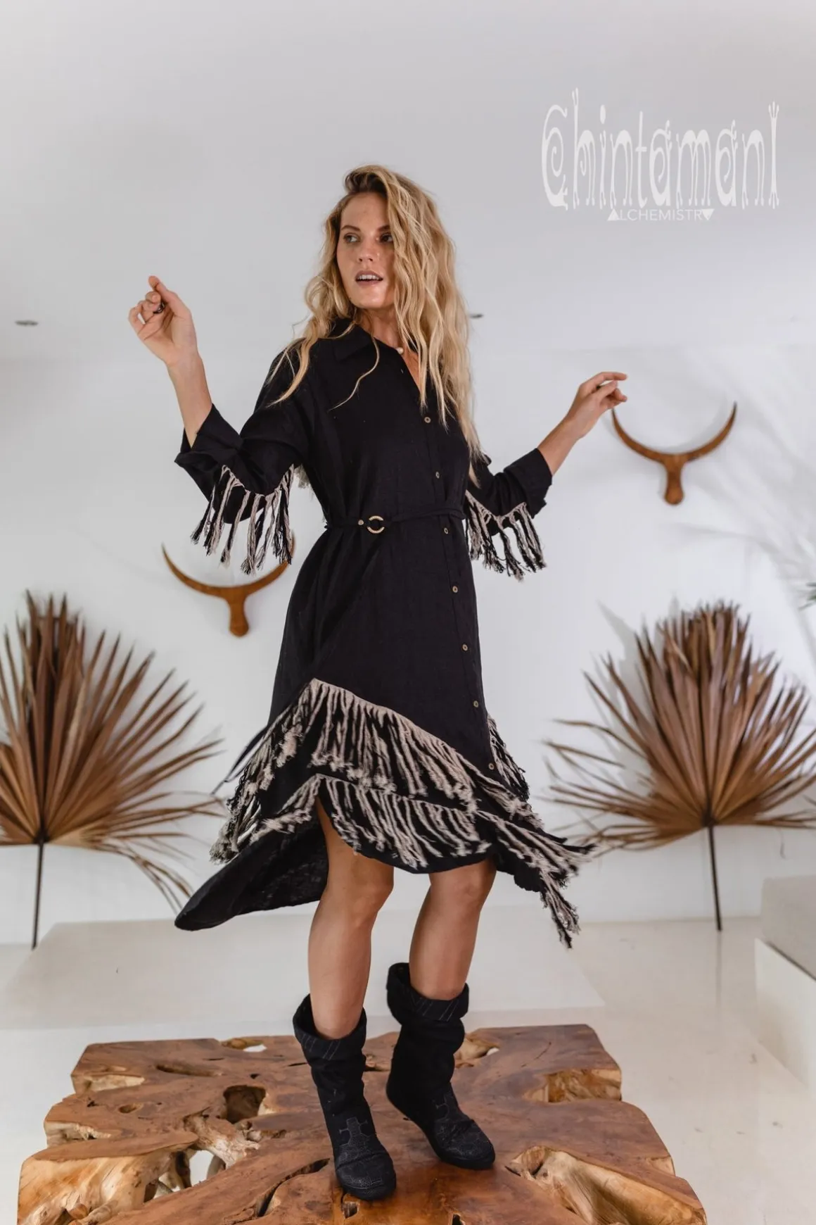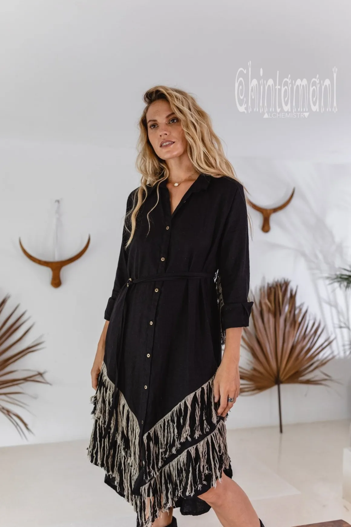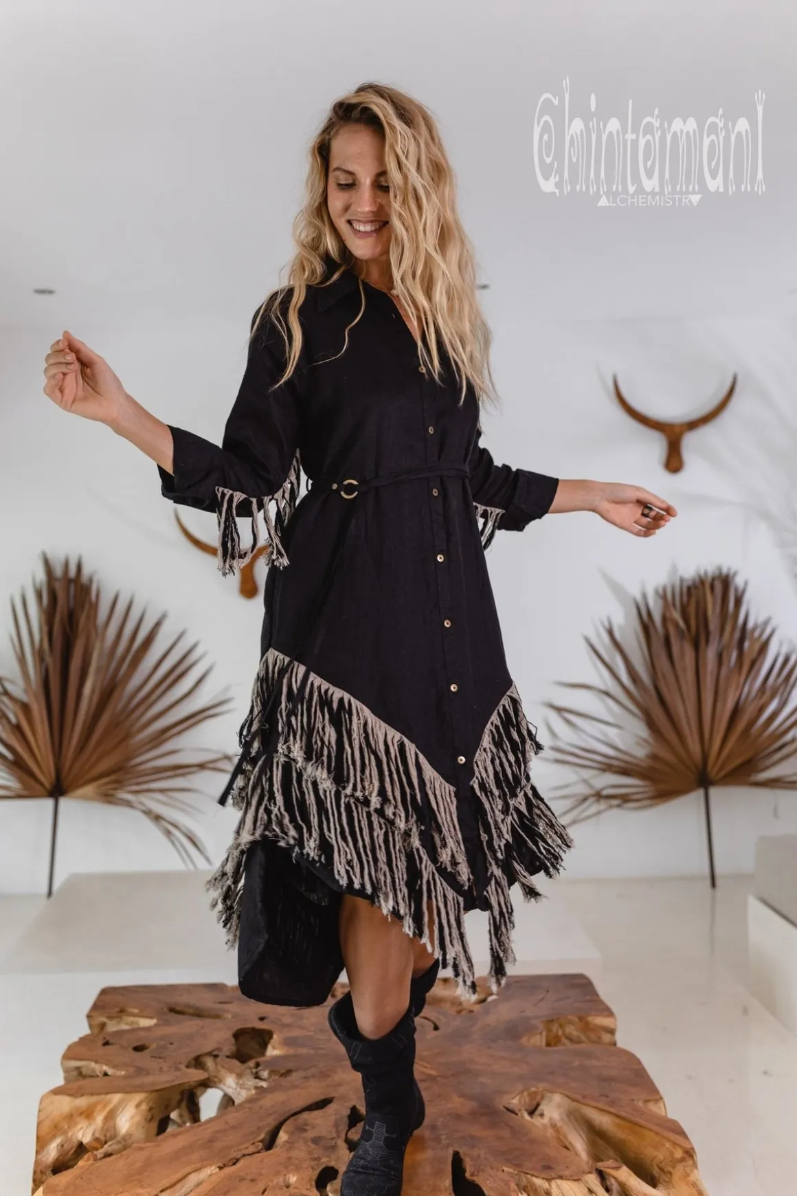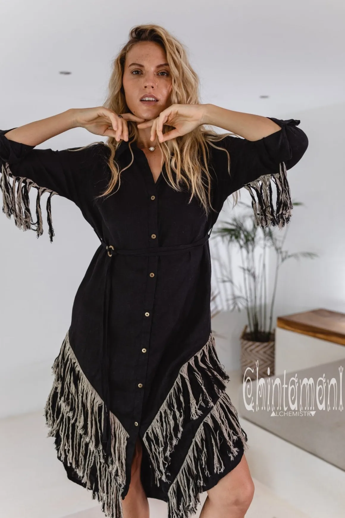 This is a freespirited creation which combines a very elegant shirt dress with the tribal shamanic long linen fringe of our new Alma Libra collection. The result is a stunning bohemian gown with layers of amazing double colored fringe on the back, in front and on the sleeves. This looks so unusual, but in the main time it is very comfortable and easy to wear. In general, it is a loose shirt with our signature asymmetric hemline and long sleeves that completely covers from excessive sunshine and protects from evening chill. There are two very handy deep pockets on the sides. This piece is made of very soft 100% natural breathable linen and feels just amazing on your skin. It is available in 5 colors of our Alma Libra collection – black, off-white, red ochre, sage green, blue and dusty pink. The loose silhouette of this model can be shaped by a belt, decorated with solid brass beautiful ring buckle that comes in set. Then the shirt magically transforms into a gorgeous feminine dress. The Shirt Dress closes up with the row of neat metal buttons, but you can also wear it unbuttoned as a cape and combine with our simple asymmetric linen dresses, or gorgeous jumpsuits to add a very boho finishing layer to your look. Alma Libra Shirt Dress is a very original Chintamani Alchemistry masterpiece, that combines city casual with elements of tribal American Indian, untamed boho and even Amazon sacred healing shamanic outfits.
