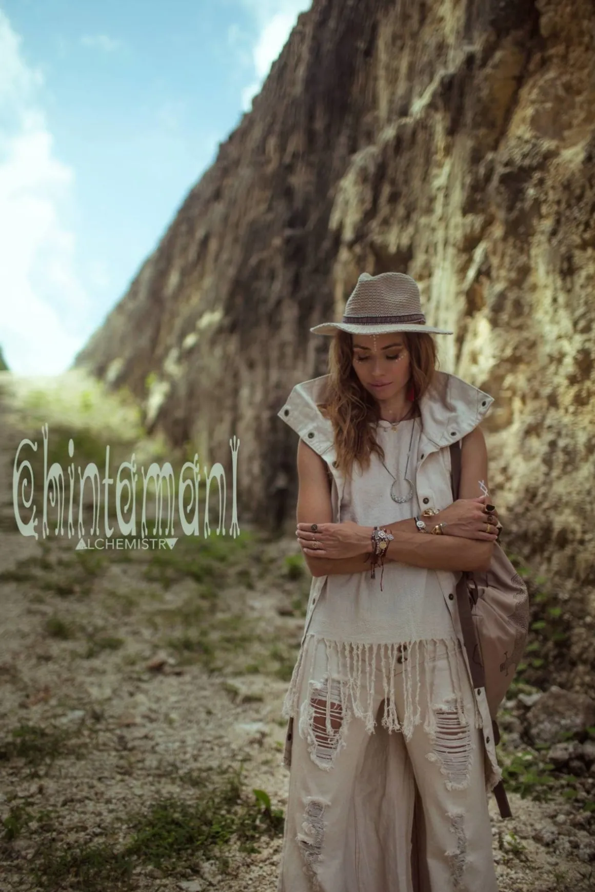 Long Fringe White Bohemian Top is another beautiful, simple and natural basic piece from our raw cotton collection. The cut of the boho top is very simple – handwoven 100% natural raw cotton speaks for itself. The only decorative element of this top – super long fringe, appears naturally at the open edge of the material. This is a longer version of our basic Top, there is also a Crop Top of the same design. The item comes in natural beige and off white distinctive colors of our Raw cotton collection, as well, as in classic black. It is very comfortable and suits almost any figure. Crop Top will look amazing with Chintamani Alchemistry skirts or jeans, worn on hips. This basic piece is an essential Boho staple to have in your wardrobe!