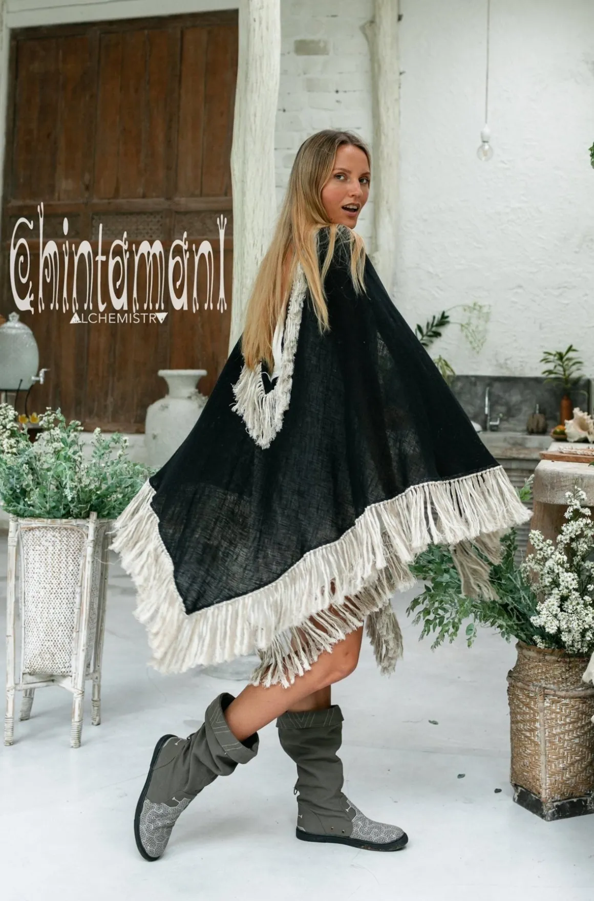 Cotton Open Back Poncho is a very original designer garment to compliment your boho outfit on a cool summer evening. High cotton canvas collar is reminiscent of elegant XIX century lady cloak, while long gorgeous linen fringe on the hemline brings an ultimate boho touch to the piece. The back of the poncho is open and also decorated with the statement fringes of our Alma Libra collection. It is made of 100% natural raw and very soft cotton. In hot climate you can wear this Poncho with our open back dresses, for light and layered boho ensemble. In cooler weather just put on some warm dress, shirt or long sleeve sweater underneath – and you are fully protected, while still looking gorgeously bohemian. It comes in 4 colors: Black, Off White, Dusty Pink and Desert Sage.