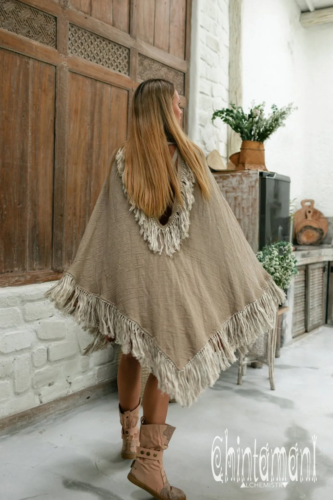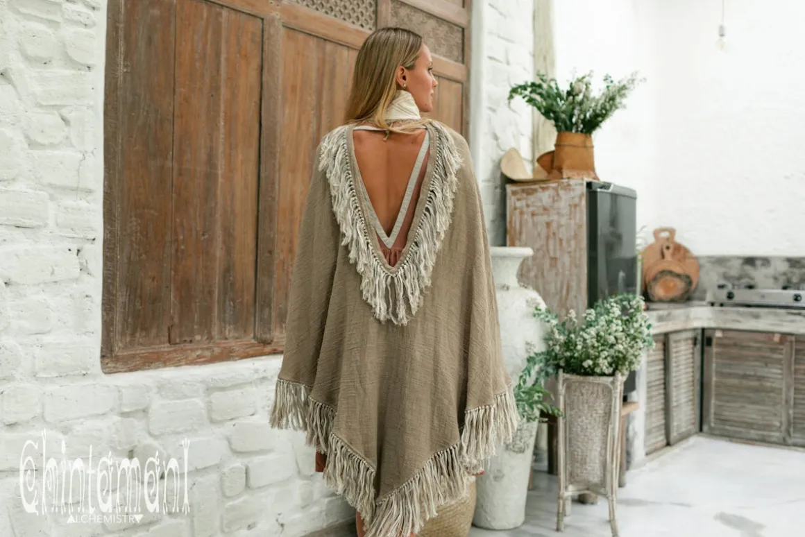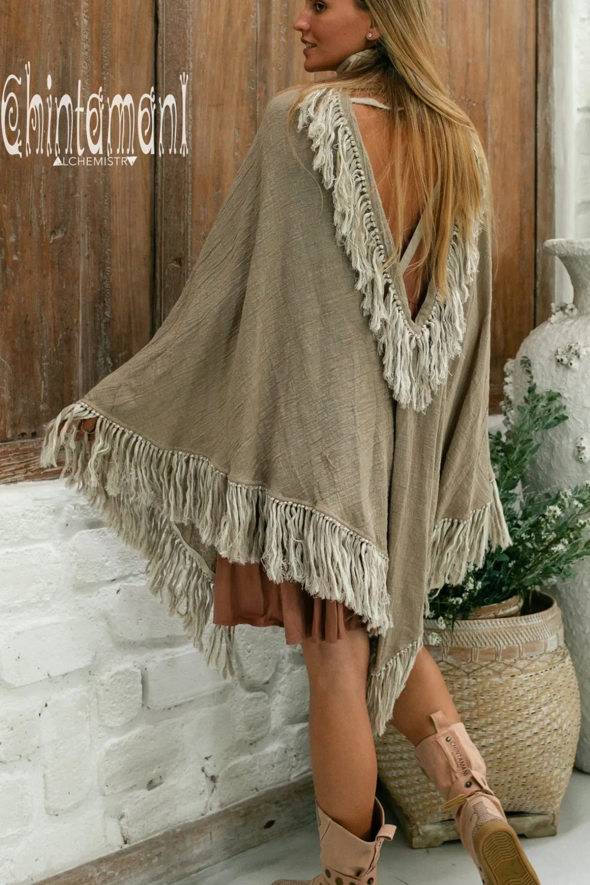 Cotton Open Back Poncho is a very original designer garment to compliment your boho outfit on a cool summer evening. High cotton canvas collar is reminiscent of elegant XIX century lady cloak, while long gorgeous linen fringe on the hemline brings an ultimate boho touch to the piece. The back of the poncho is open and also decorated with the statement fringes of our Alma Libra collection. It is made of 100% natural raw and very soft cotton. In hot climate you can wear this Poncho with our open back dresses, for light and layered boho ensemble. In cooler weather just put on some warm dress, shirt or long sleeve sweater underneath – and you are fully protected, while still looking gorgeously bohemian. It comes in 4 colors: Black, Off White, Dusty Pink and Desert Sage.