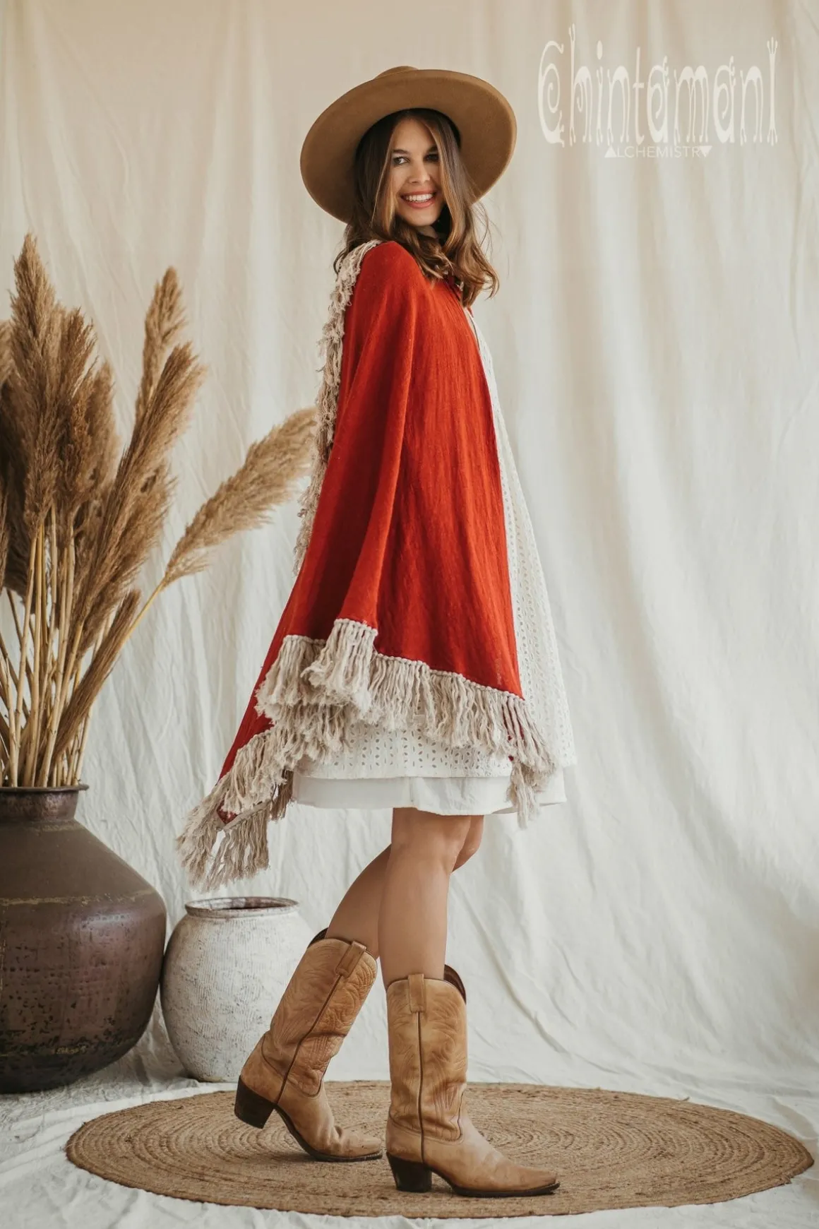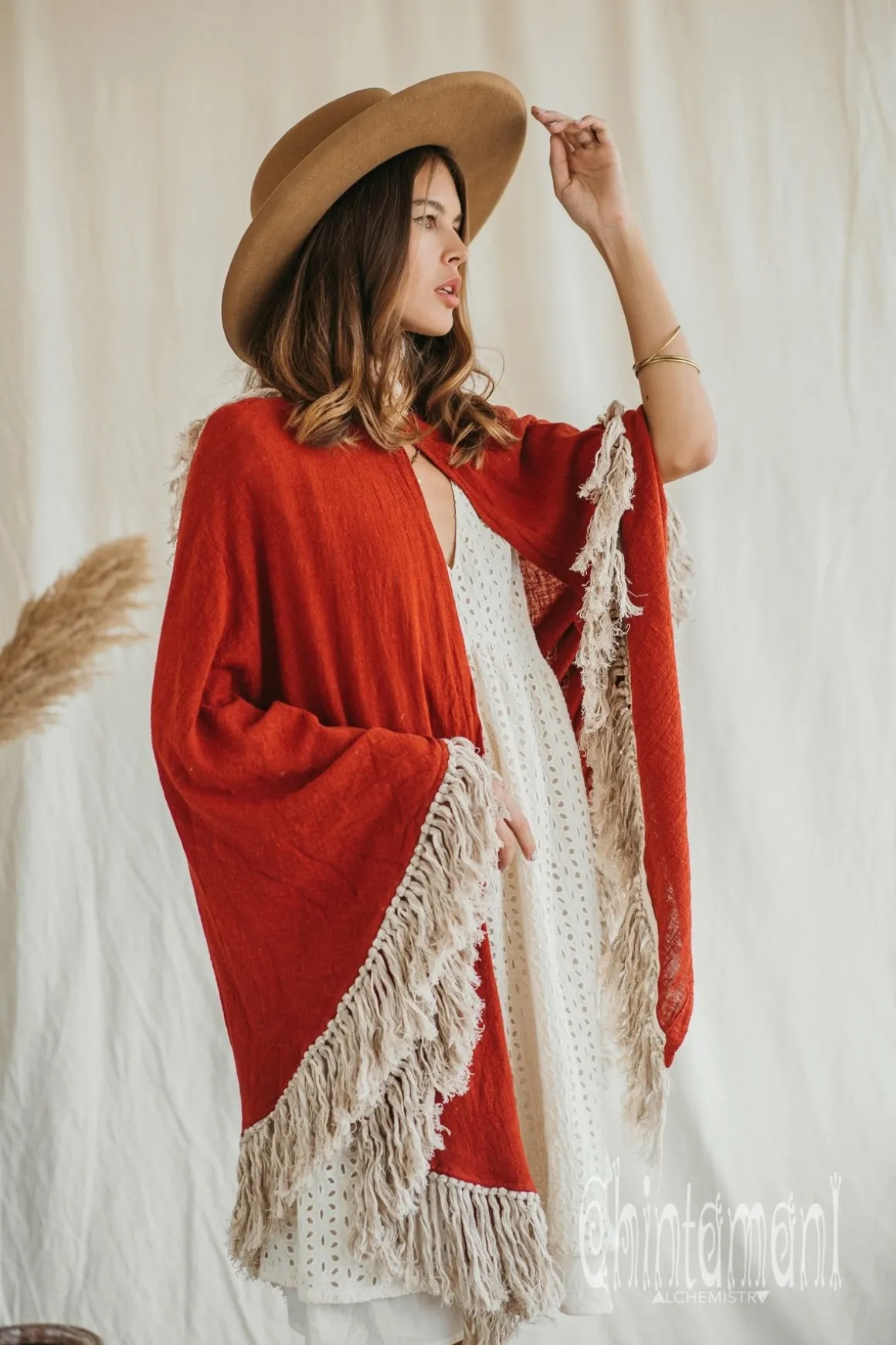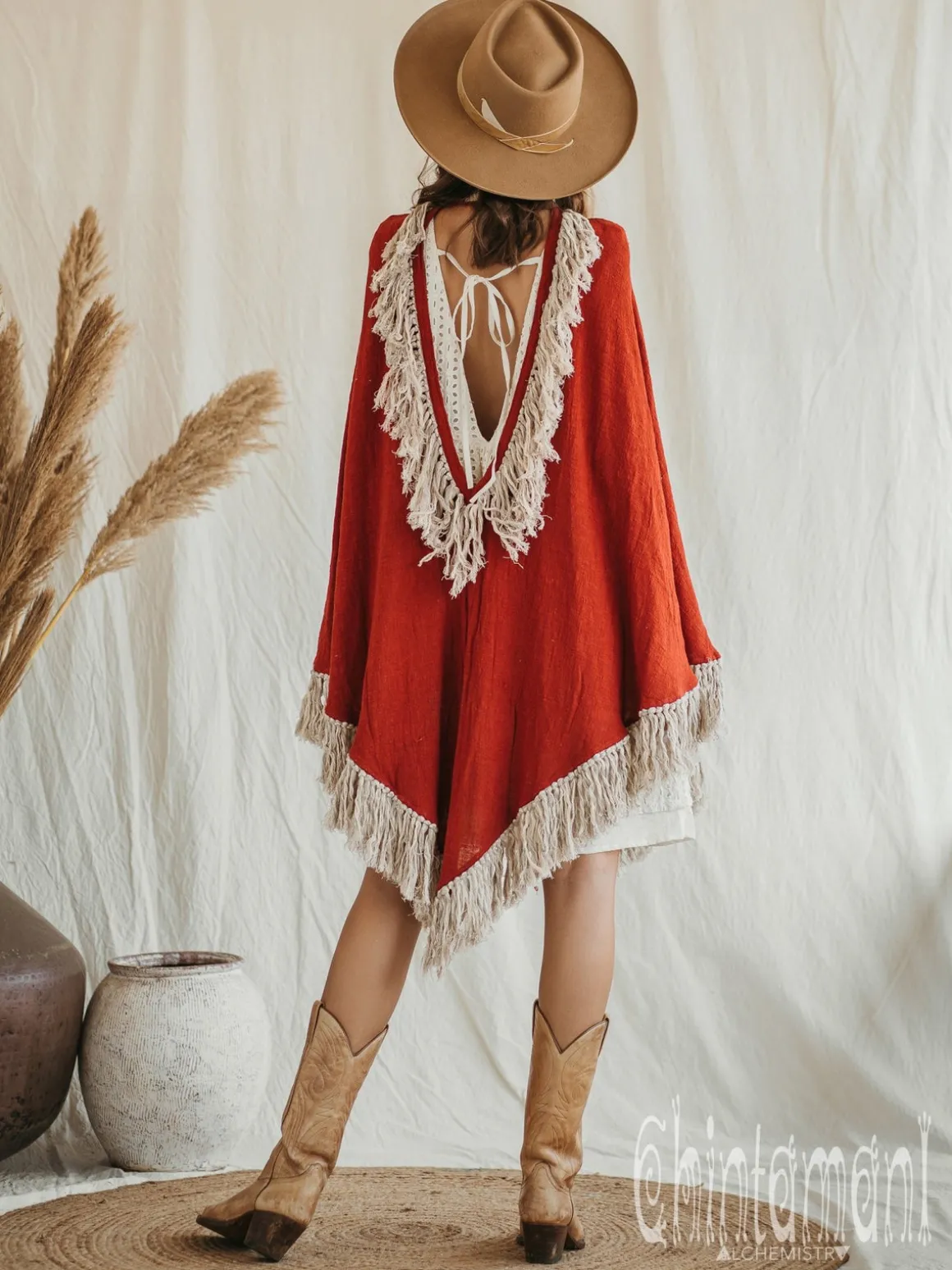 Cotton Open Back Poncho is a very original designer garment to compliment your boho outfit on a cool summer evening. High cotton canvas collar is reminiscent of elegant XIX century lady cloak, while long gorgeous linen fringe on the hemline brings an ultimate boho touch to the piece. The back of the poncho is open and also decorated with the statement fringes of our Alma Libra collection. It is made of 100% natural raw and very soft cotton. In hot climate you can wear this Poncho with our open back dresses, for light and layered boho ensemble. In cooler weather just put on some warm dress, shirt or long sleeve sweater underneath – and you are fully protected, while still looking gorgeously bohemian. It comes in 4 colors: Black, Off White, Dusty Pink and Desert Sage.