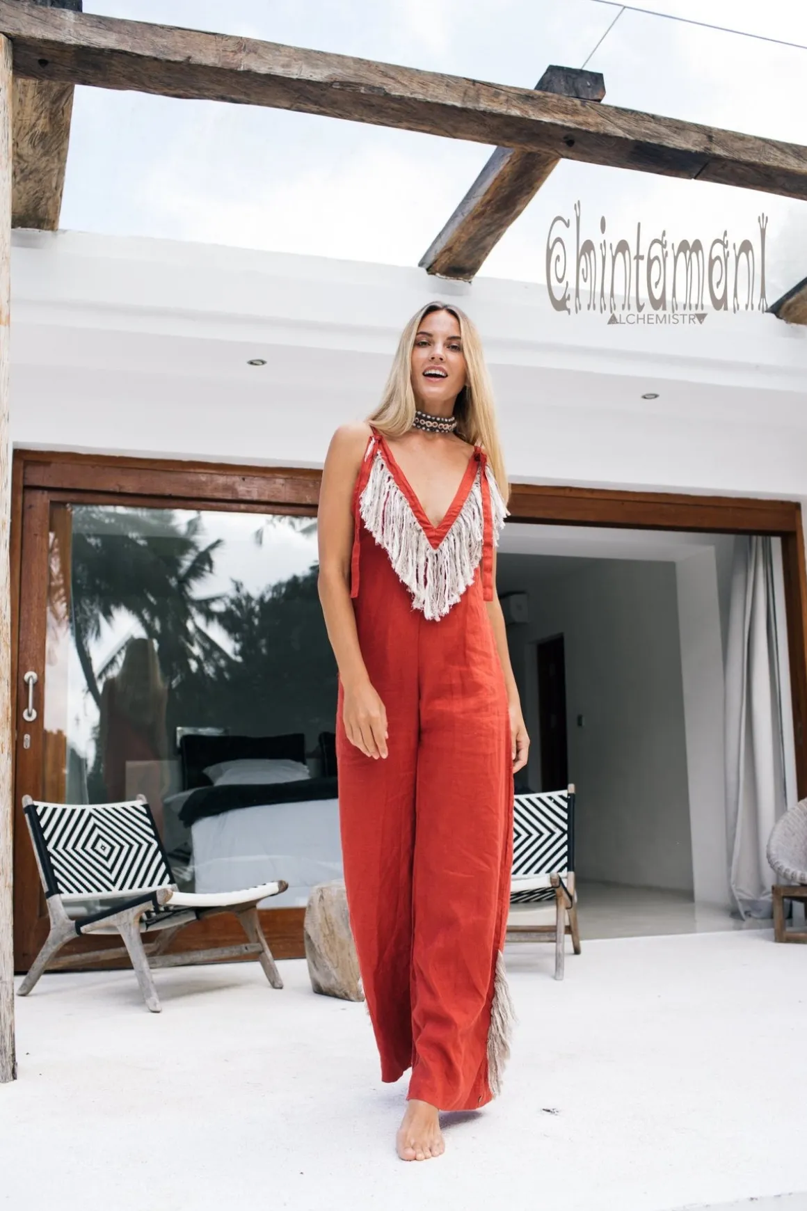 Amazingly feminine Alma Libra boho jumpsuit is a daring stand alone fashion statement. Comparing to our previous bestselling elegant Long Linen Jumpsuit, the silhouette of this one is more sensual and sleek. It has stunning V-cut on the back and a plunging neckline decorated with gorgeous long linen fringe. These two details finalize the transformation of a work robe (that is still a big part of jumpsuit image) into chic evening gown. Neat metal eyelets for the shoulder straps and additional fringe on the side of the trousers add more boho decorative details to this model. There is an invisible zipper on the back, that helps the derriere part of this piece to fit incredibly perfect. Loose, almost bell bottom long trousers will look classy with high heels or playfully hippie with wedge-heeled sandals. This is a jaw dropping model elegant enough for an evening cocktail party, but with a little twist of rebellious bohemian mischief to it. Alma Libra jumpsuit is made of thin very soft natural linen, available in hand dyed basic colors of white, black as well, as soft feminine dusty pink and red ochre.