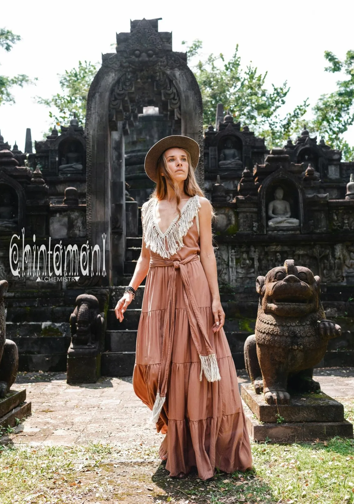Tiered Maxi Dress with Fringes is another gem from our Boho Alma Libra collection. It is a very graceful outfit, with timeless silhouette. Gorgeously feminine and so pleasant to wear, it will look amazing with heeled sandals or our ethnic canvas boots. Stunning long linen fringe on the neckline complete the Bohemian Princess look. Open back adds the charm and makes it even more suitable for hot and lazy summer days. It is very floaty by design. Light, soft and natural Cotton fabric brings this idea to life perfectly. You can use fringed belt, that comes with the dress, to accentuate waistline, or just wear it free and simple.