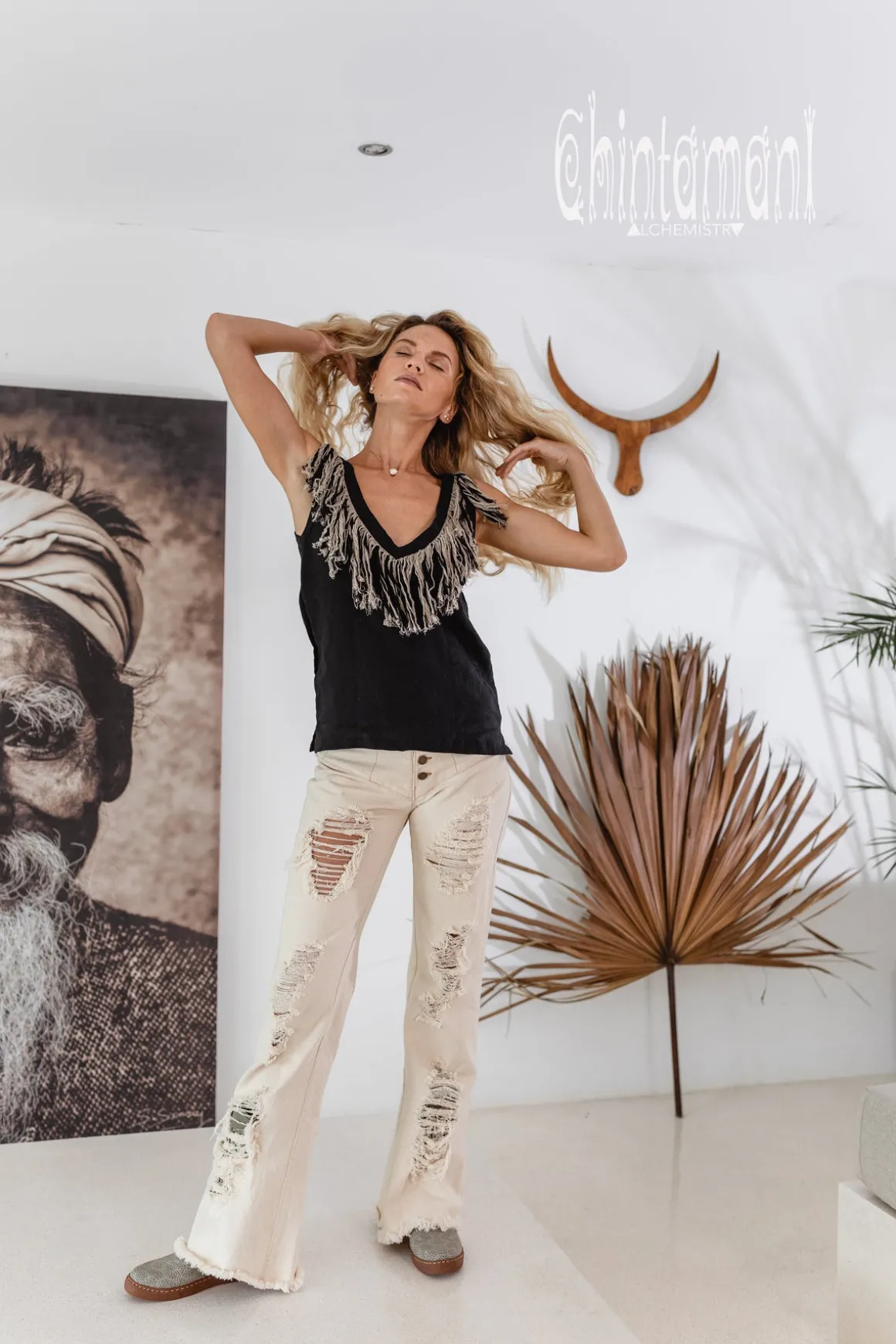 The main feature of our Alma Libra Fringe Necklace Top is a stunning decorative long fringe around the neckline. This element is a uniting original detail from our new collection – it looks tribal, bohemian and elegant at the same time. With this model it reminds of some Polynesian ceremonial gorget. The fringe is made of thick, pure, strong linen, so it does not entangle or wear off even after several washes. The Top itself is also made of linen – strong, durable and naturally breathable fabric that is so pleasant to wear. You can have it in natural unbleached silver grey color of raw fabric, or in very gentle hand dyed tints – dusty pink, crème or noble black. It is a loose fit model that combines wonderfully with all our skirts or distressed jeans, to create complete boho chic ensemble. You can also wear this top with something completely neutral, like jeans shorts – to add just a little designer accent to your everyday outfit.
