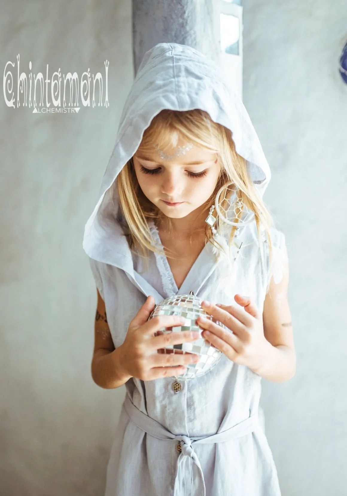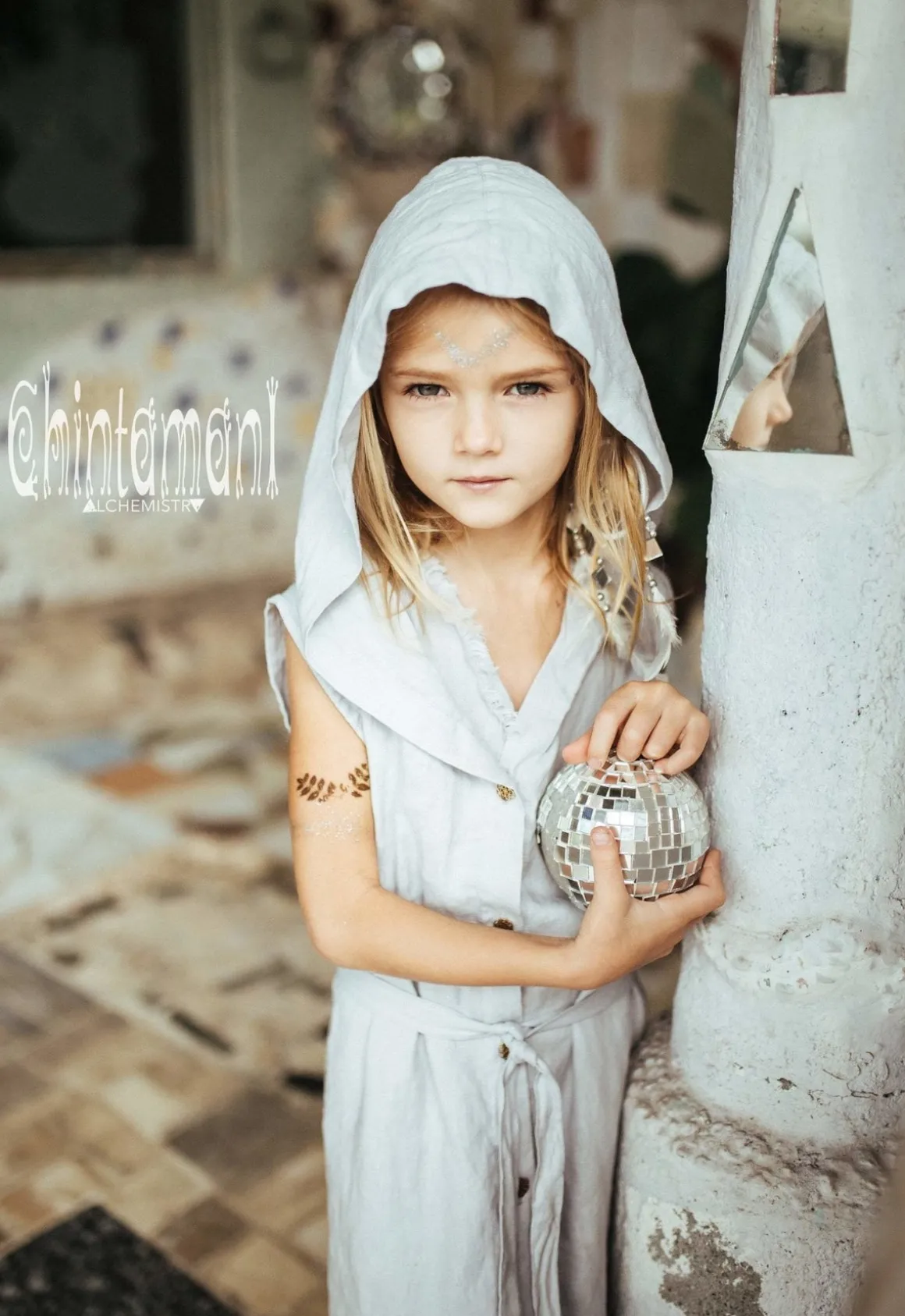 Perfect composition to mother’s linen look. Chintamani kids tunic with custom made seed of life brass buttons. Its a long top style hooded cover with buttons and belt. Fits perfect with dress, pant, skirt or leggins. We were inspired to see how small woman loves them.