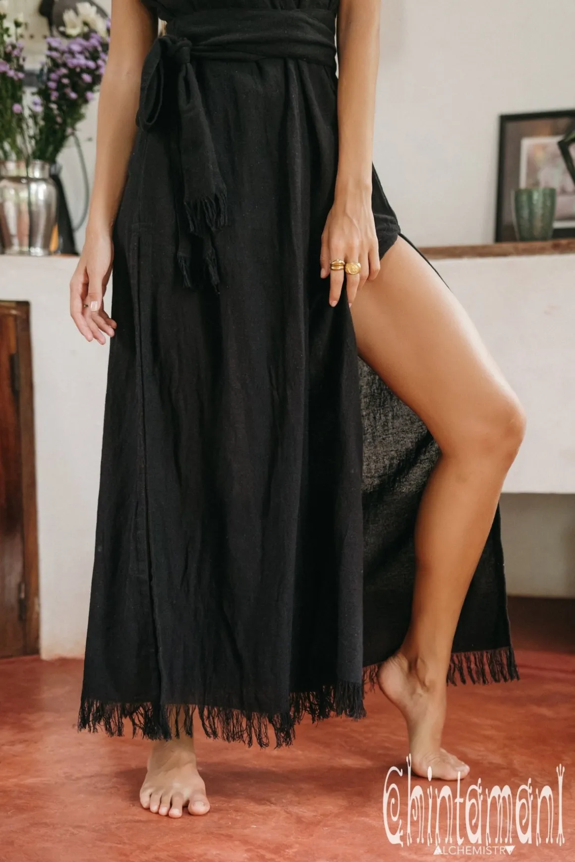 Indian Raw Cotton Boho Dress by Chintamani Alchemistry. Very light gorgeous kimono wrap dress for sunny mornings in the garden or long walks along the beach. Wrap around design with deep V neck line and side slits is comfortable and look stunningly natural and classy. A piece to wear over and over again. This Goddess organic dress looks wonderful with Chintamani Alchemistry high shoes. Can be combined with our raw cotton cardigans or mantles.