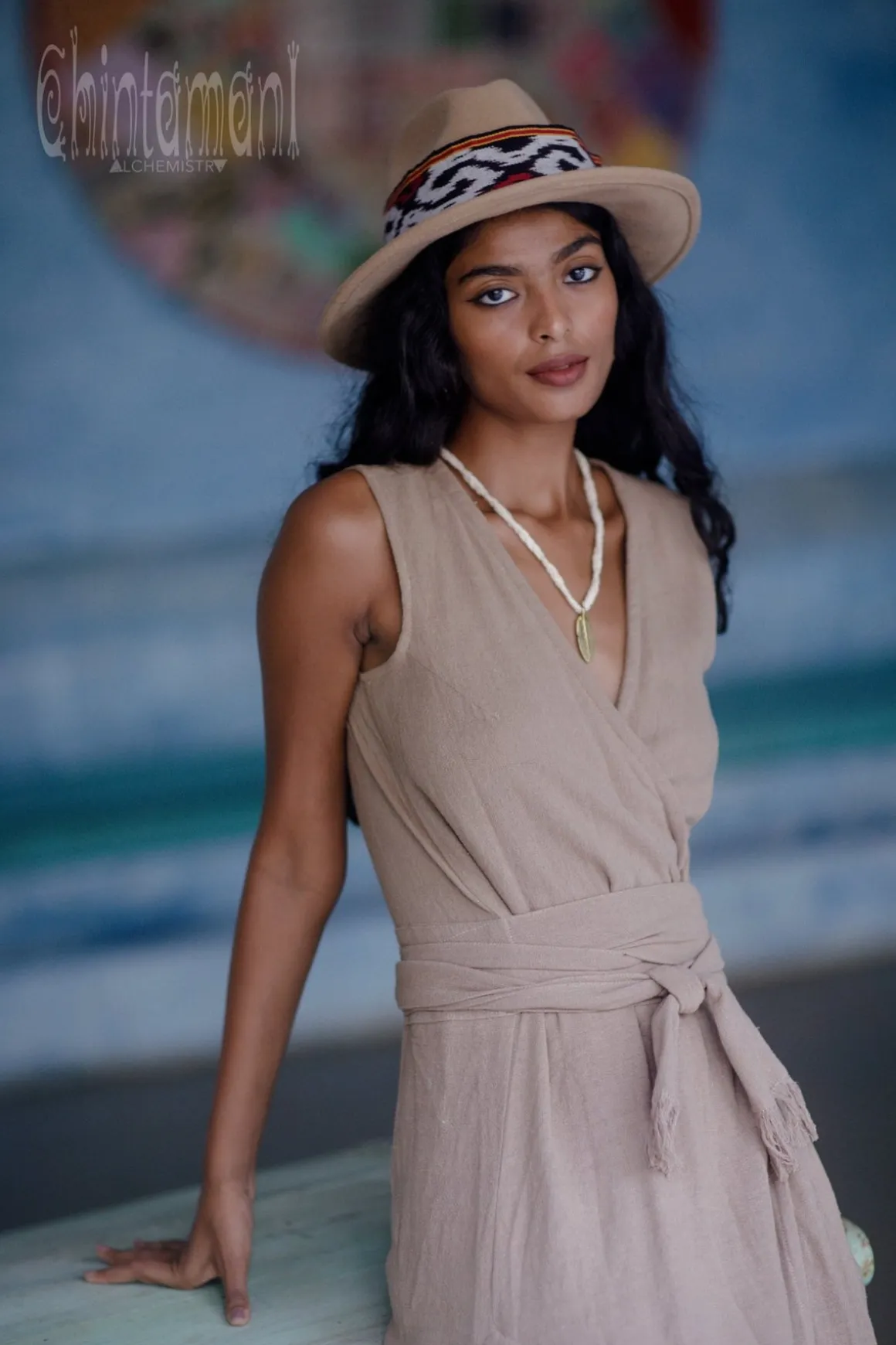 Indian Raw Cotton Boho Dress by Chintamani Alchemistry. Very light gorgeous kimono wrap dress for sunny mornings in the garden or long walks along the beach. Wrap around design with deep V neck line and side slits is comfortable and look stunningly natural and classy. A piece to wear over and over again. This Goddess organic dress looks wonderful with Chintamani Alchemistry high shoes. Can be combined with our raw cotton cardigans or mantles.