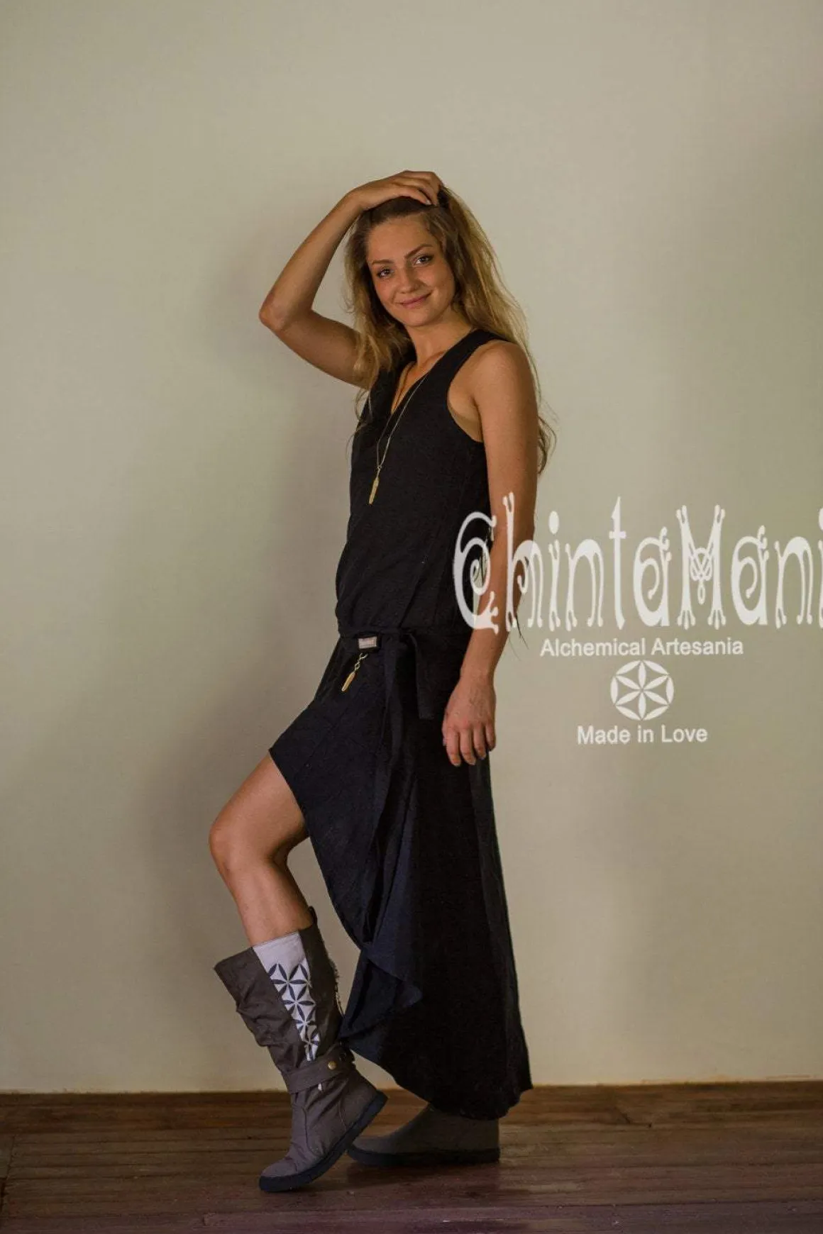 Full Vegan boho high shoes made of 100% cotton canvas with flower of life screen print. These elegant canvas boots will suit a traveler, a dreamer or a city dweller, who likes natural feel and comfort. They complement any leg shape and can be worn either with pants, skirts or dresses. Wearing stunning Chintamani Alchemistry shoes, one doesn’t have to compromise between amazing boho chic look and ability to walk for miles and dance for hours. Flat, comfortable sole is stitched all around so it will last for years of continuous use. All our boots are decorated with sacred patterns. Two Solid Brass Chintamani feather pendants go together with each pair.