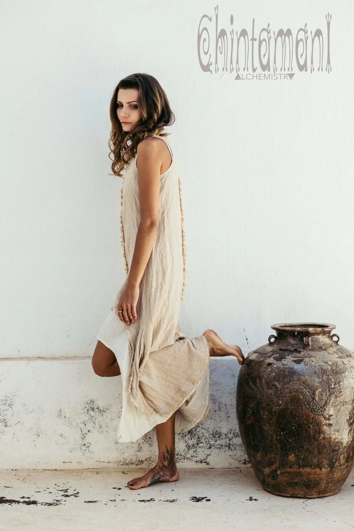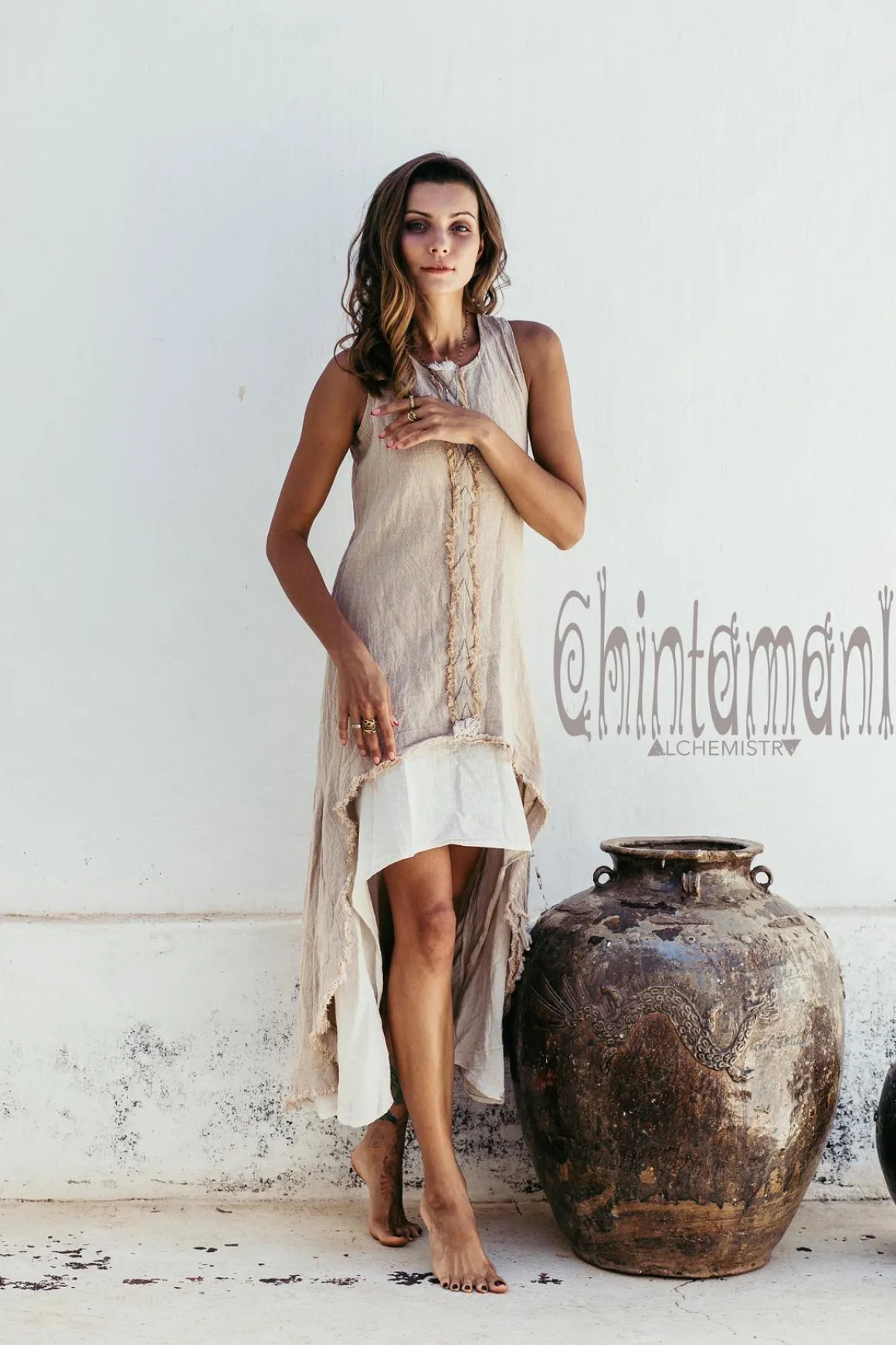 Hand woven natural indian cotton 2 layer bohemian dress with stitched patterns and fringe. This gorgeous boho maxi dress combine very raw outlook with our original asymmetrical flowing skirt cut. Inner thin cotton dress wonderfully contrast crude outer fabric to create a unique look for a special occasion. This artsy fully handmade piece is a good option for any artistic event, be it a concert, an exhibition or a fair. Can be worn with Chintamani Alchemistry cardigans, shawls, ponchos.