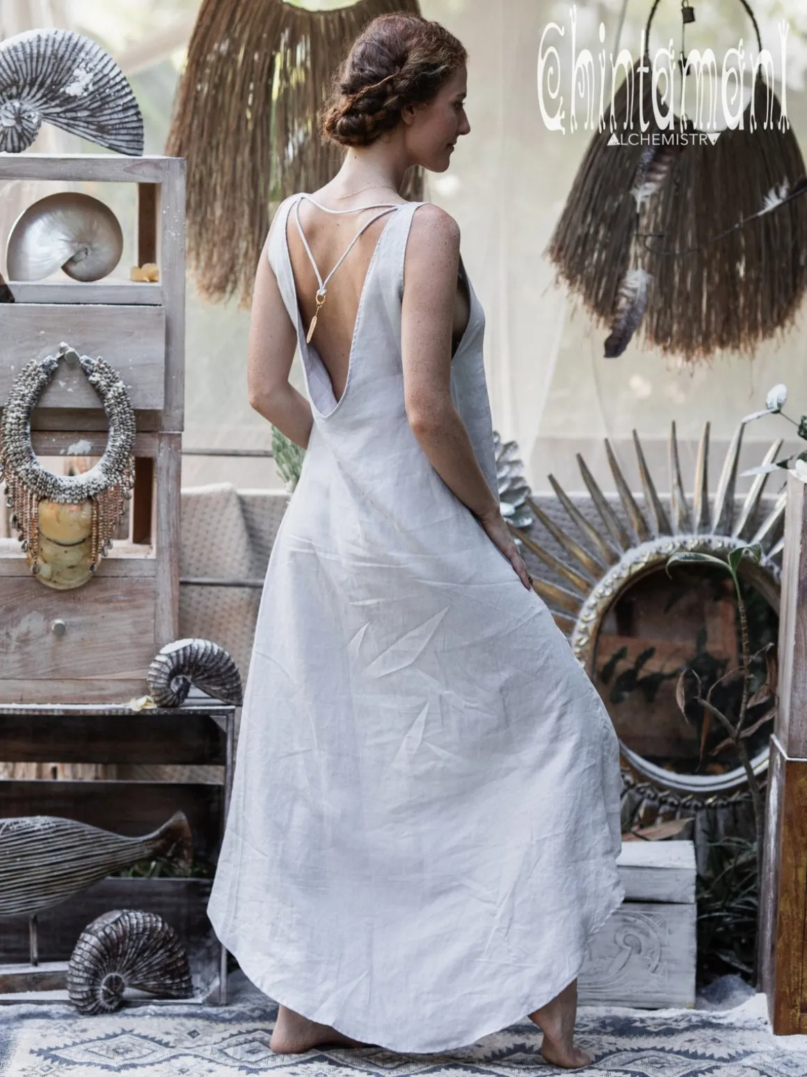 Graceful open back grey maxi linen dress from our limited collection comes in noble and durable 100% pure washed linen. Its sophisticated silhouette shows off your back in a quite sensual way. Although, don’t worry – specially designed lacing with an amazing brass big feather pendant will keep this bohemian dress from sliding from your shoulders unexpectedly. As some of Chintamani Alchemistry high low long dresses, it has our signature accent – a floaty cascading tail, that looks especially stunning, while you walk. A very convenient detail – the bosom of this backless dress is double layered, so you can wear it without any bra, for that very special sensation of soft caress and freedom of natural soft linen! Made from a very high quality exquisite fabrics, the piece was designed for special occasions, but, in fact, this amazing creation feels so good, you will want to wear it every day!