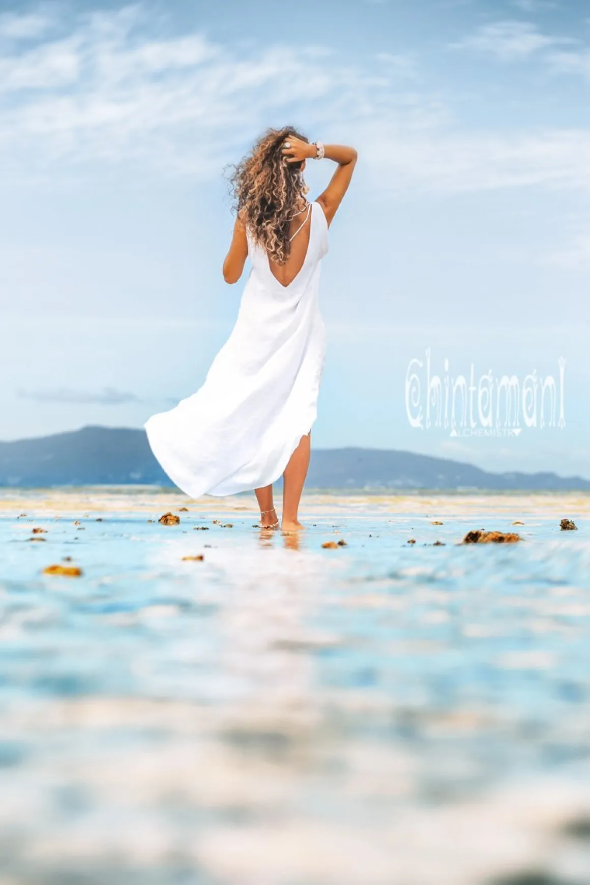 Graceful maxi open back white linen dress from our limited collection comes in noble and durable 100% pure washed linen. Its sophisticated silhouette shows off your back in a quite sensual way. Although, don’t worry – specially designed lacing with an amazing brass big feather pendant will keep this boho dress from sliding from your shoulders unexpectedly. As some of Chintamani Alchemistry long dresses, it has our signature accent – a floaty cascading tail, that looks especially stunning, while you walk. A very convenient detail – the bosom of the dress is double layered, so you can wear it without any bra, for that very special sensation of soft caress and freedom of natural soft linen! Made from a very high quality exquisite fabrics, the piece was designed for special occasions, but, in fact, this amazing creation feels so good, you will want to wear it every day!
