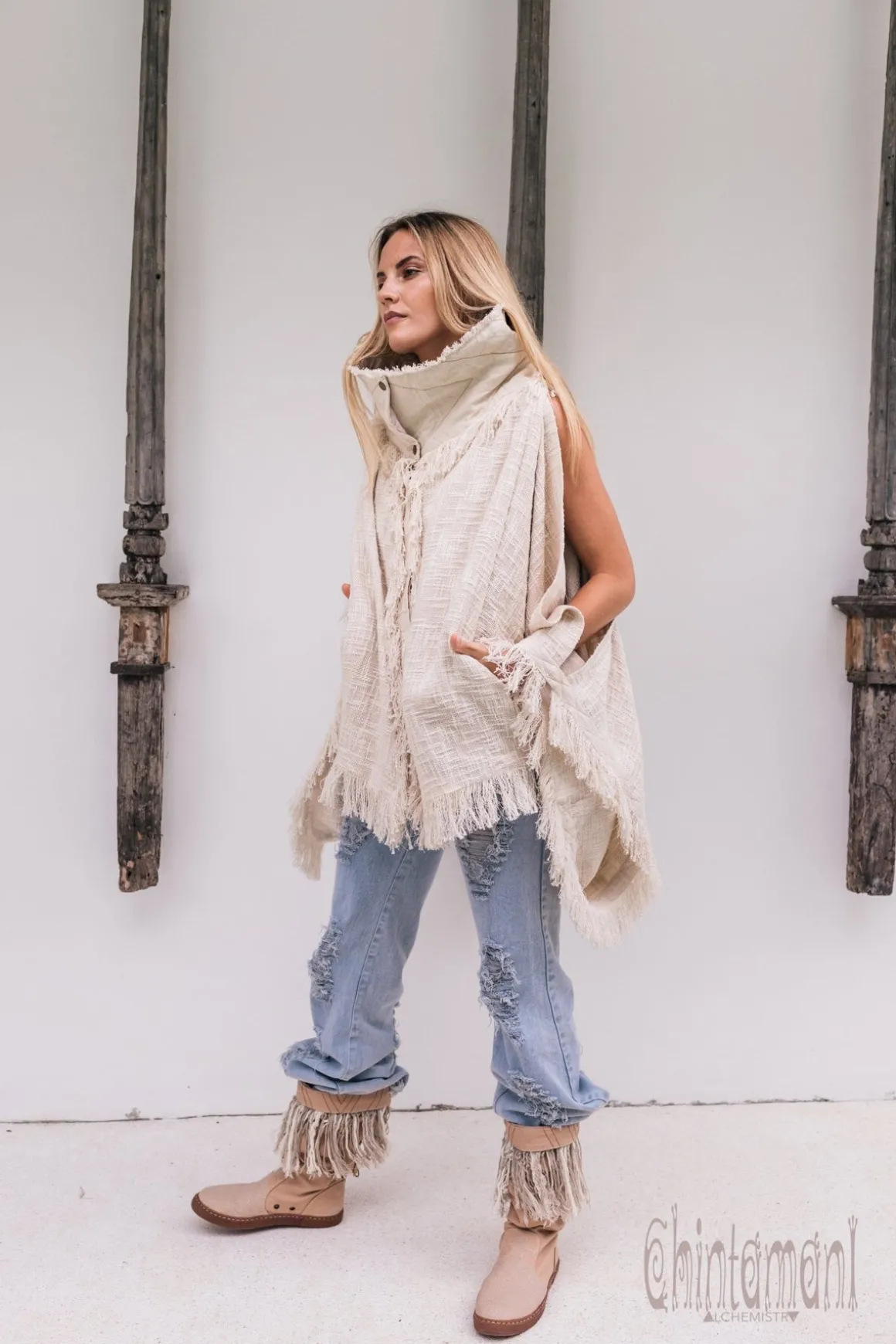 Another fluffy wonder from Chintamani Alchemistry, High Neck Jacket is a lighter, more versatile version of our bestseller High Neck Poncho. It is also made of amazingly textured thick cotton with a royally high canvas collar, reminiscent of Elizabethan frill, when you open it up. All the hemlines are decorated with soft beautiful fringes. The gorgeous sleeves are wide and heavy, but have slits on top that show off your arms, which make the model look way more light and floaty. This way, you can wear this jacket as it is during warm summer nights, or pair it with a long sleeve sweater for cooler weather. There are also small pockets on the sides for extra cozyness. High Neck Jacket looks very cute with hippie jeans and boots, but it will turn out quite elegant if you pair it with a long skirt or wide classic trousers and heels.