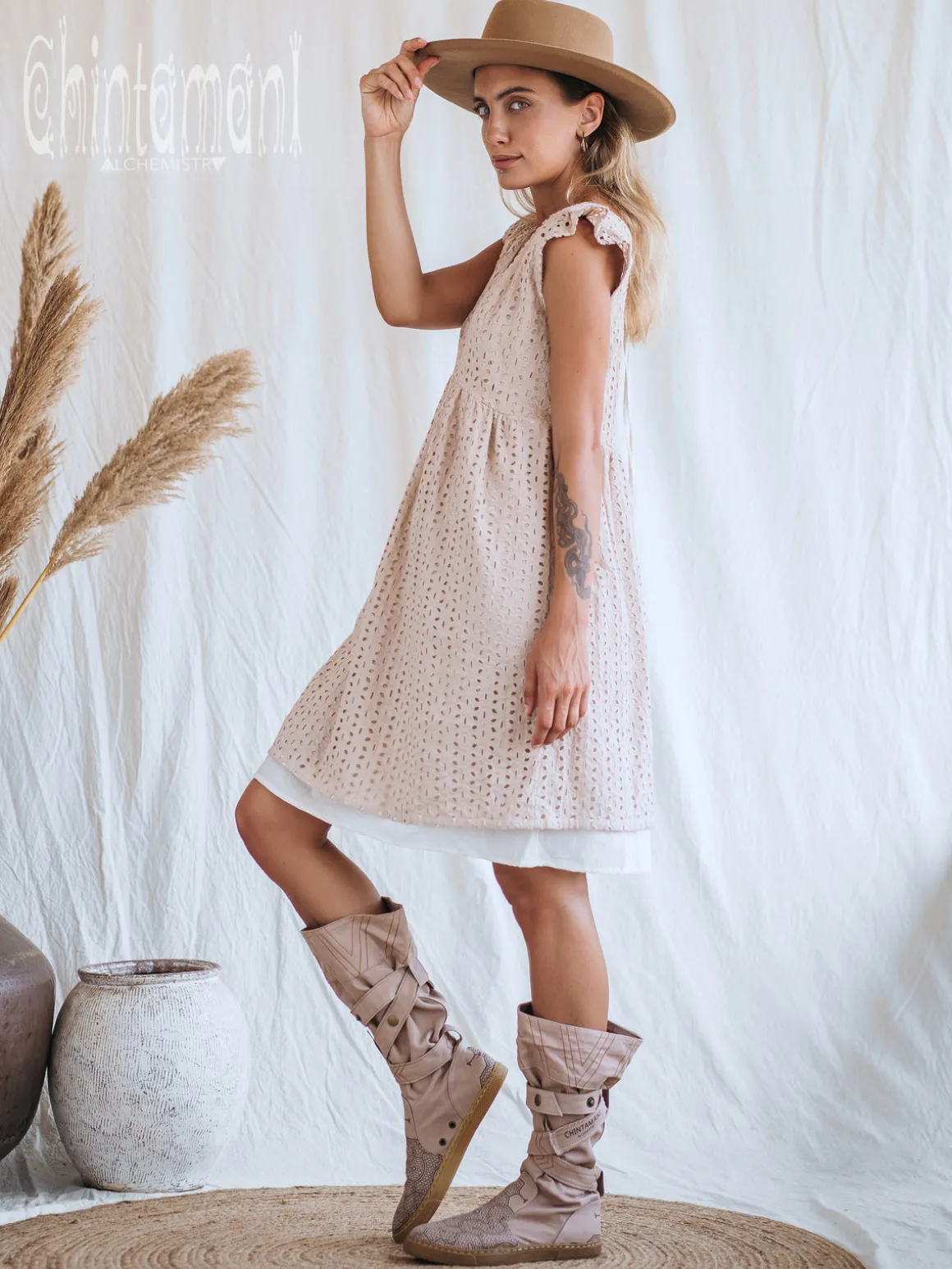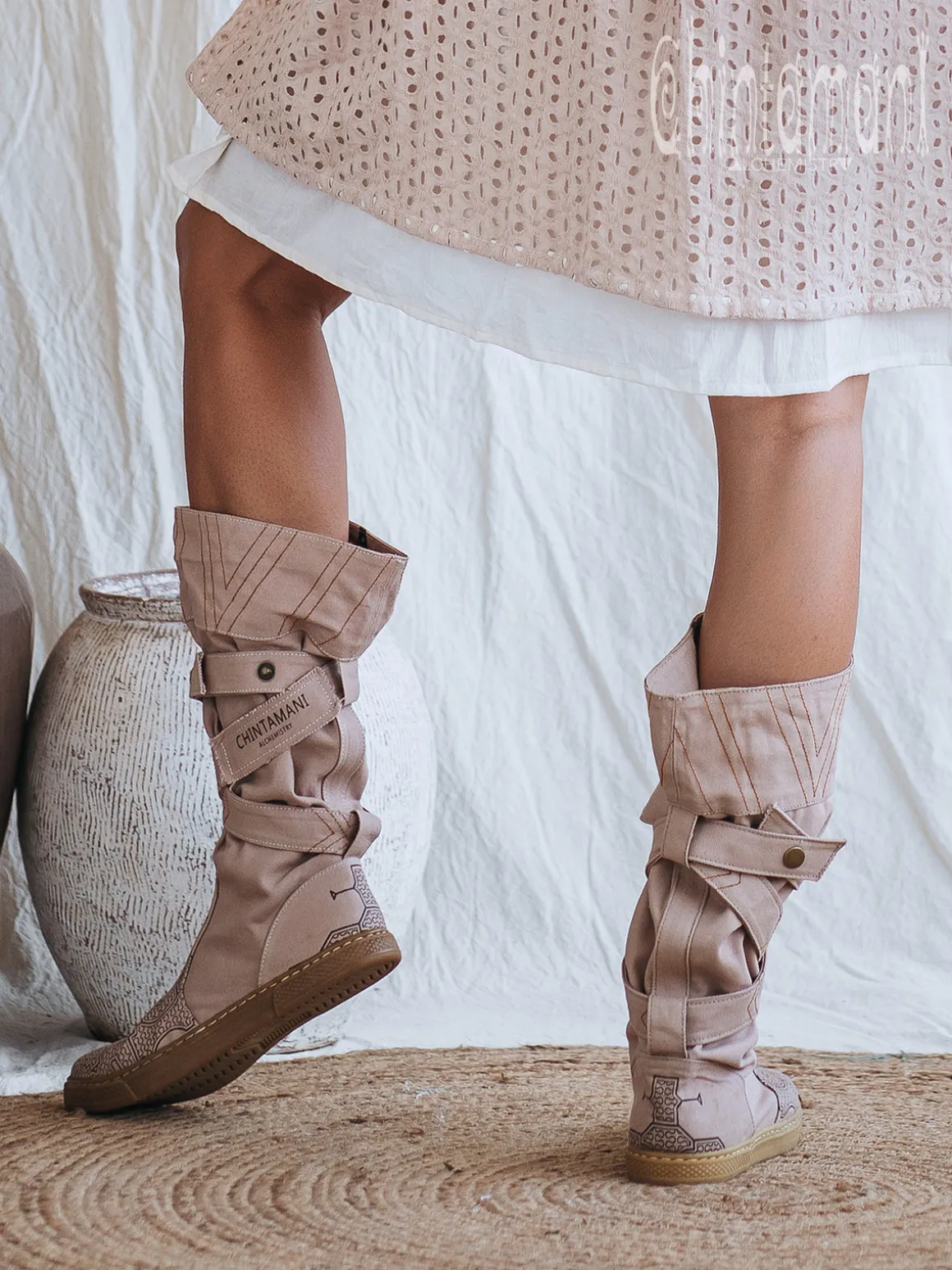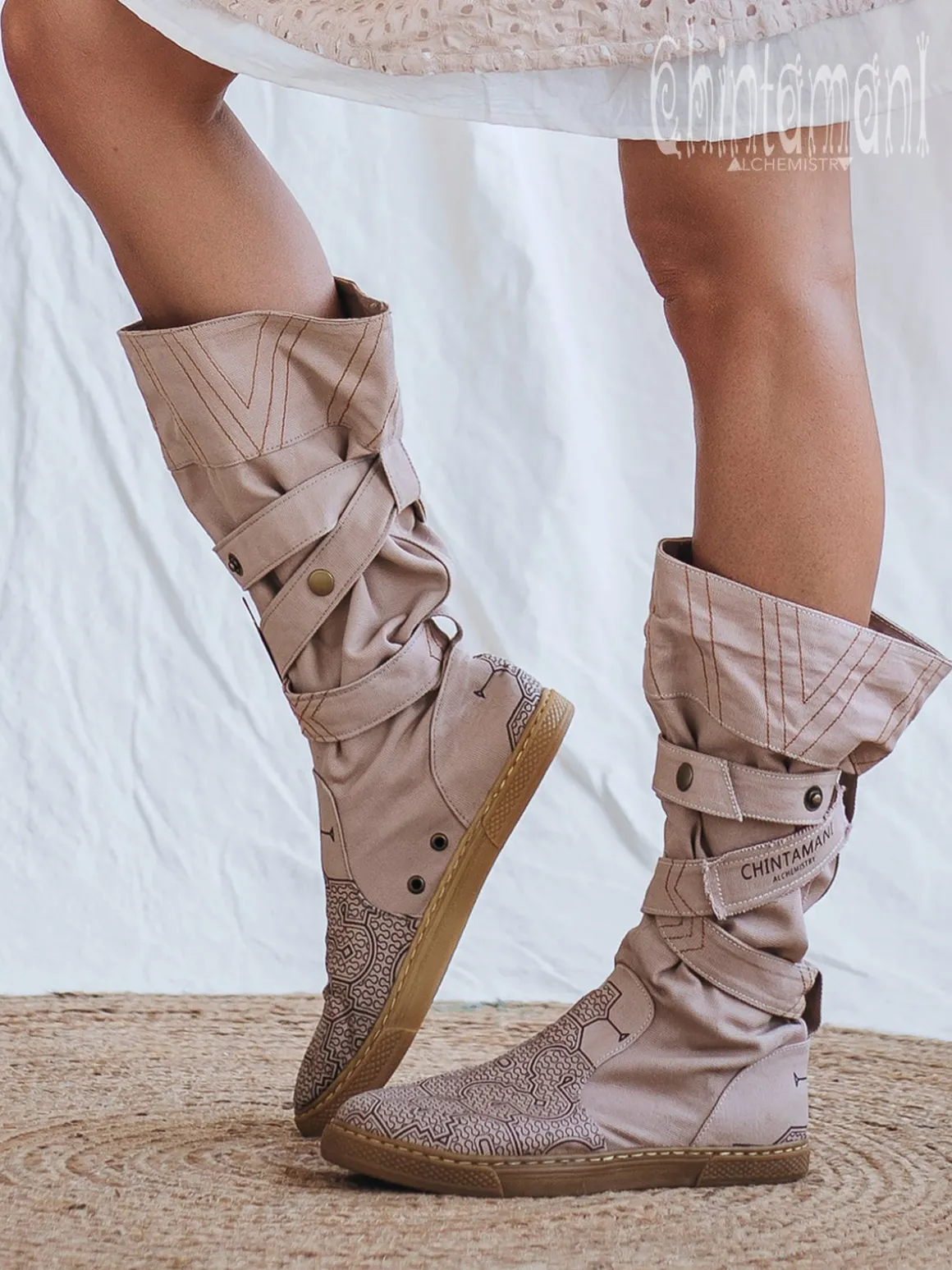 Full Vegan bohemian high shoes made of 100% cotton canvas. These elegant canvas high boots will suit a traveler, a dreamer or a city dweller, who likes natural feel and comfort. They complement any leg shape and can be worn either with pants, skirts or dresses. Wearing stunning Chintamani Alchemistry shoes, one doesn’t have to compromise between amazing boho chic look and ability to walk for miles and dance for hours. Flat, comfortable sole is stitched all around so it will last for years of continuous use. Solid Brass Chintamani feather buckle go together with each pair.