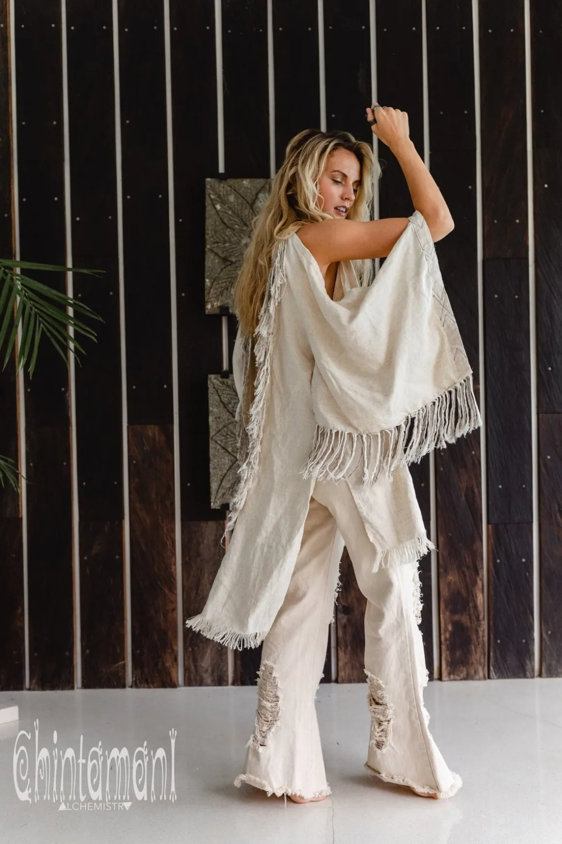 The main uniting element of our Alma Libra collection is long decorative fringes. They are handmade from 100% natural strong and thick linen, so that they are very durable and do not entangle after washing. The fringes usually come in a mix of two colors: one is the same tint as a garment it decorates, with the addition of raw unbleached silver-grey threads. It takes many hours to create this stunning decoration which makes each and every piece from our new collection a one of a kind artefact.