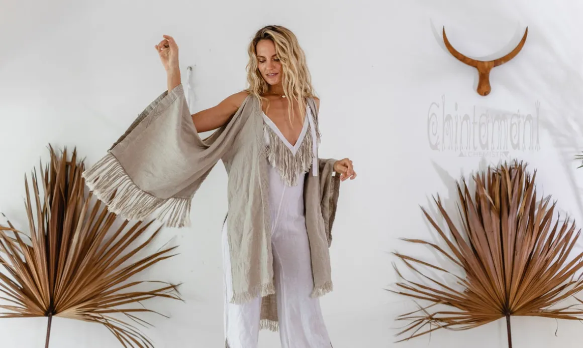 Long decorative fringes are handmade from 100% natural strong and thick linen, so that they are very durable and do not entangle after washing. The fringes usually come in a mix of two colors: one is the same tint as a garment it decorates, with the addition of raw unbleached silver-grey threads. It takes many hours to create this stunning decoration which makes each and every piece from our new collection a one of a kind artefact.