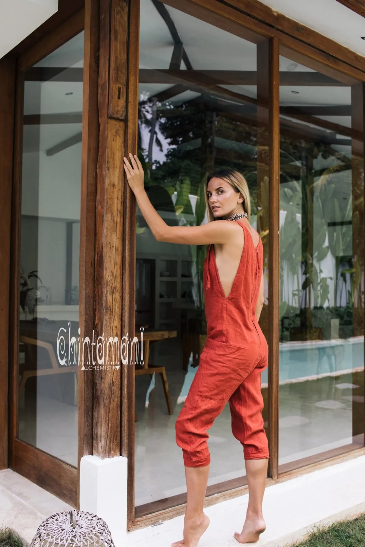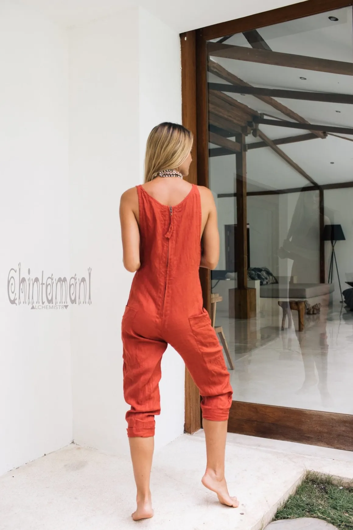 Elegant and cozy linen jumpsuit overall, made of 100% natural gorgeous Linen fabric. We were working on creating the perfect cut casual jumpsuit for years, and finally here is one! It is very airy, but not too wide, trousers fit tight on hips and flow freely on the bottom, straps are adjustable, as they are fixed with decorative brass rings. This model’s 34 length of the trousers makes it very convenient for everyday wear, it combines nicely with boots or just flip flops. There is very durable, high quality zipper on the back, so it is really easy to get out of this super comfortable piece. Linen fabric is antibacterial and breathable by its nature, so you can easily wear our jumpsuit romper without any underwear or compliment it with little bandeau, as well, as simple t-shirt. Cardigan or kimono on top of it will create very classy ensemble that is suitable even for formal events. There are 5 natural colors for this handcrafted piece: Black, White, Dusty Pink, Light Grey and Red Ochre.