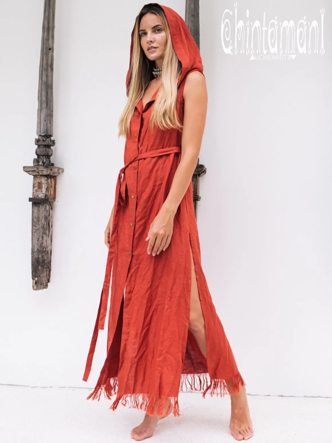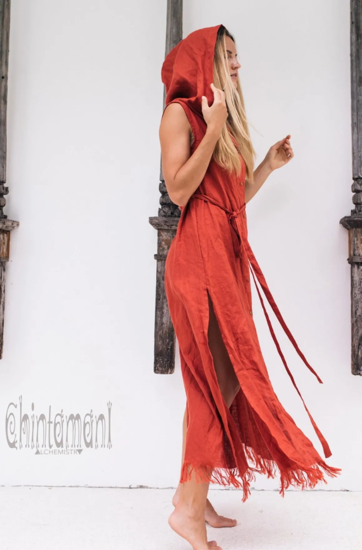 Gorgeous Hooded Red Ochre Linen Dress is an elegant bohemian creation made from natural linen with attention to every detail. Its main feature is a huge, soft hood, that looks very romantic and medieval. Handmade fringe on the hemline add to the artsy look. Meanwhile very classy shirt cut, little belt with a buckle on the back and raw, noble texture of 100% linen turn this model into casually elegant masterpiece. Deep side cuts, that open only if you start moving around, is a little sensual, very feminine accent. Buttons for this model are specially made in our jewelry workshop in Bali in form of our signature flower of life geometrical pattern. This is a unique work of art from Chintamani Alchemistry new pure natural collection!