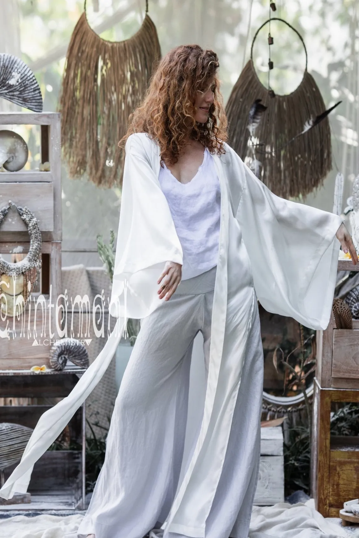 Grey Boho Linen Pants are floaty and noble basic piece, Mediterranean holiday classic, that inspires dreams of wide straw hats and deep blue seas. This flare pants are as light and natural, as they appear – made of pure linen or silk (in our exquisite silk collection). The fabric of this garment will spoil your skin with its gentle touch! When you start dancing in them, design of the pants will reveal hidden detail – side slits for extra freedom of movement. Thus, this garment will look amazing on professional dancers and can be used for practices. Note, that during everyday wear the slits are invisible, so the trousers can be easily used for smart casual events, paired with our raw linen wrap tops or simple cotton shirt. You can wear these organic pants low on hips or high up – the buttons on the back of the belt can be adjusted for better fit.