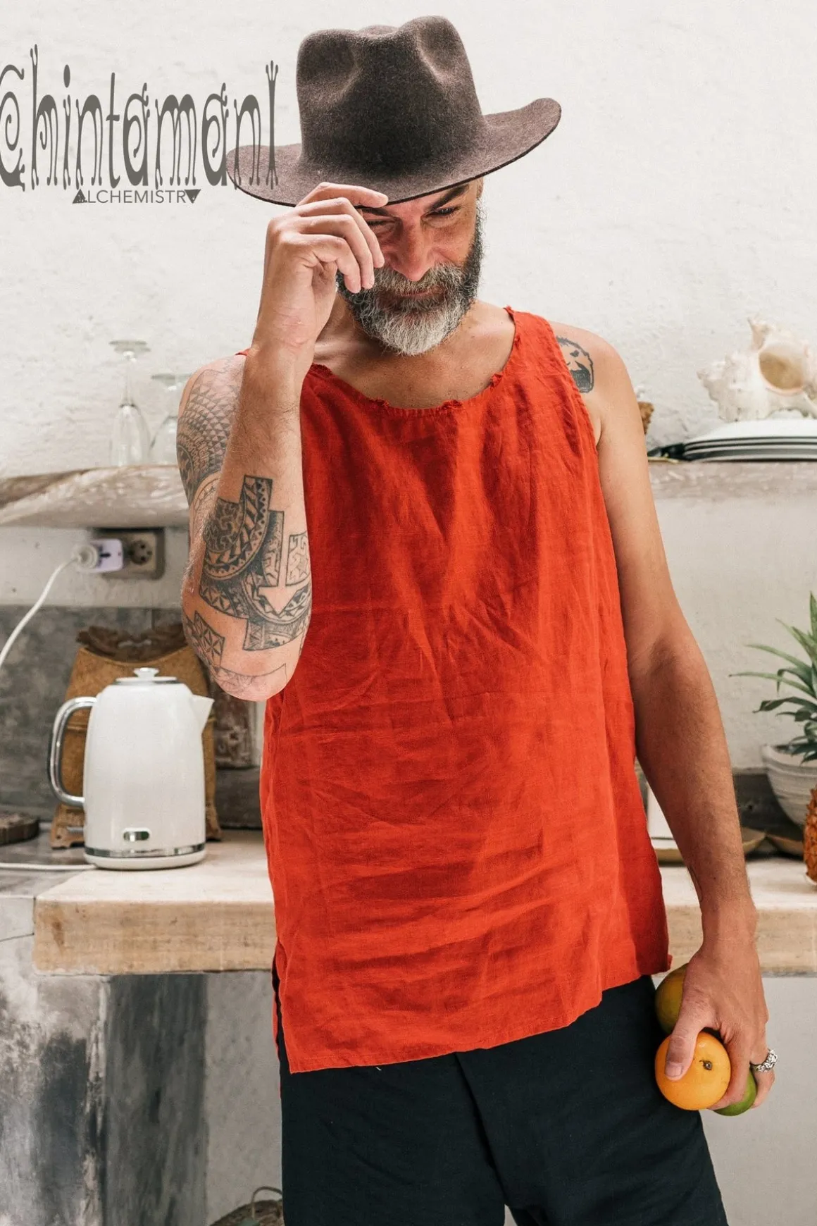Simple basic red ochre men’s top made out of soft natural linen. Sleeveless cut shows off hands and shoulders, meanwhile airy silhouette, a bit longer on the back, creates artsy bohemian look. This garment made of 100% natural fabric feels especially good in hot weather. We recommend to buy one size bigger for loose, comfortable fit. It will go amazing with long light-colored trousers or something ethnic, like Thai fisherman pants or even sarong. Our basic linen top comes in 4 colors – classic black, raw grey (the color of unbleached fabric), red ochre or sophisticated pink.