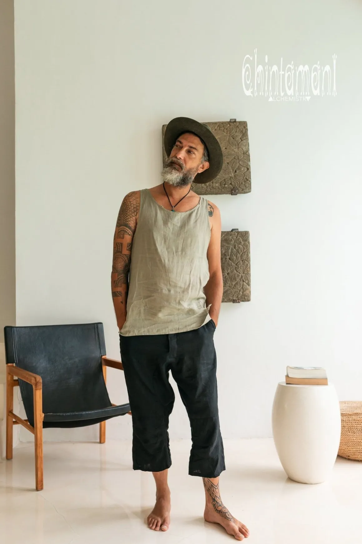 Simple basic sage green men’s top made out of soft natural linen. Sleeveless cut shows off hands and shoulders, meanwhile airy silhouette, a bit longer on the back, creates artsy bohemian look. This garment made of 100% natural fabric feels especially good in hot weather. We recommend to buy one size bigger for loose, comfortable fit. It will go amazing with long light-colored trousers or something ethnic, like Thai fisherman pants or even sarong. Our basic linen top comes in 4 colors – classic black, raw grey (the color of unbleached fabric), red ochre or sophisticated pink.