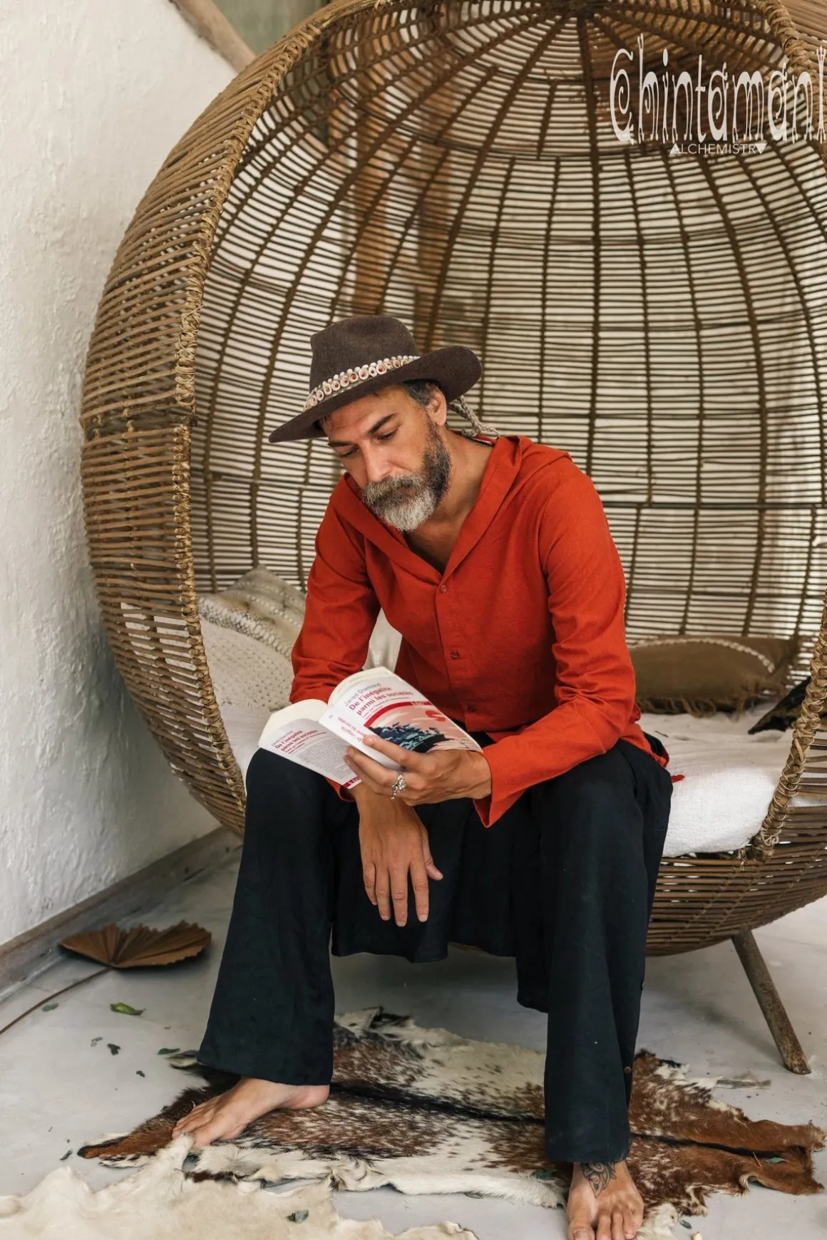 This red ochre hooded shirt for men is a very comfortable piece to wear with jeans or pants in a cooler climate. It has big pilgrim hood, extra long sleeves for coziness and even side pockets! The back is decorated with geometric “worn out” screen printed patterns, to add some artsy twist to this simple and classic model. The hemline is open, so that this piece will combine perfectly with any of your boho wardrobe, be it ethnic trousers, distressed jeans or our beautiful soft Linen pants. Hoody shirt comes in two classic colors – black and white.
