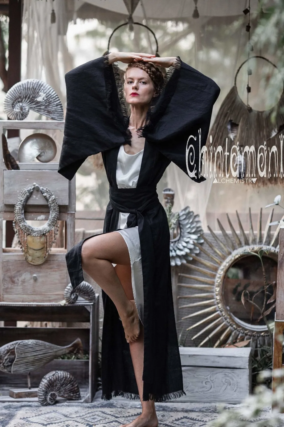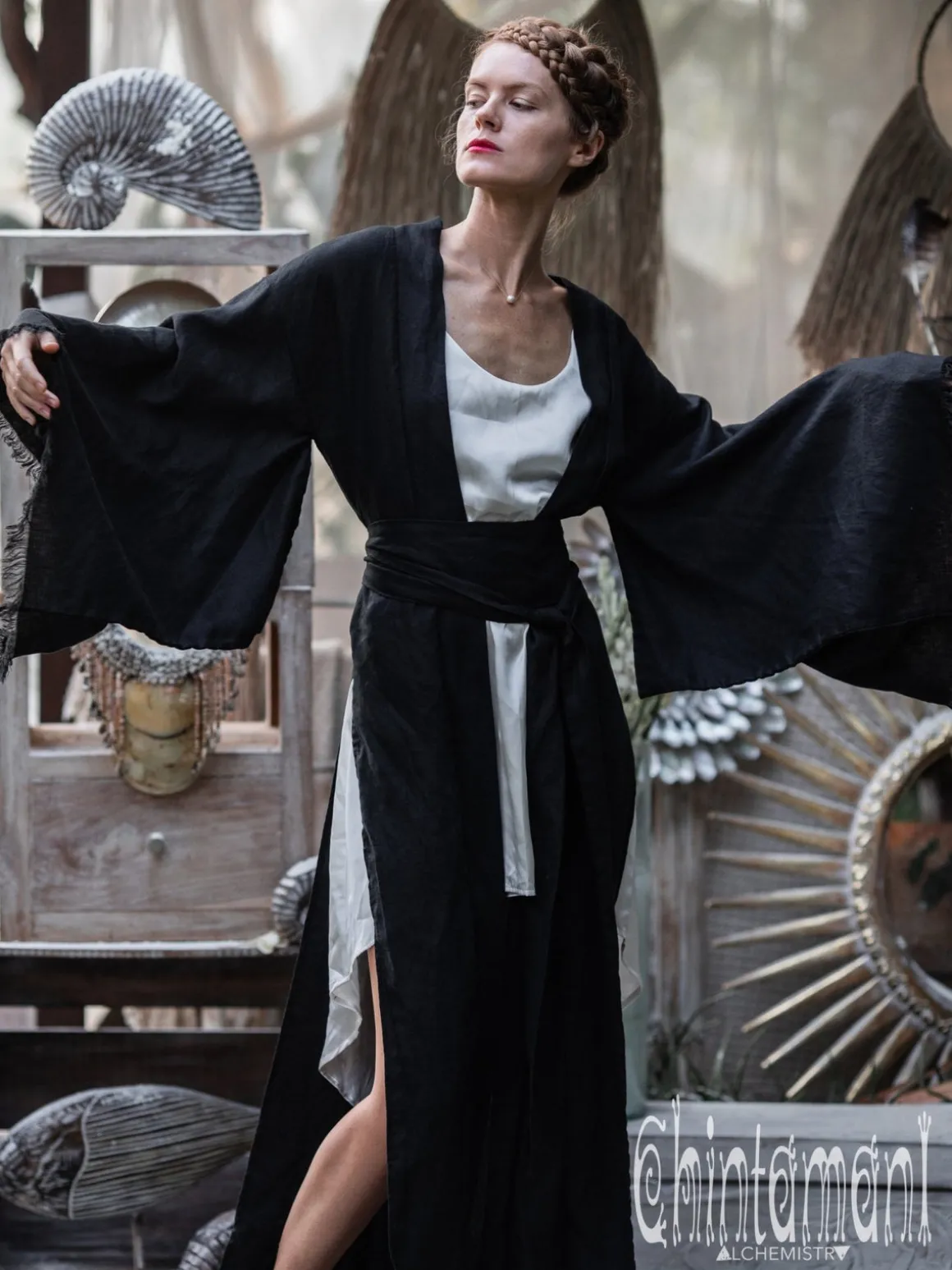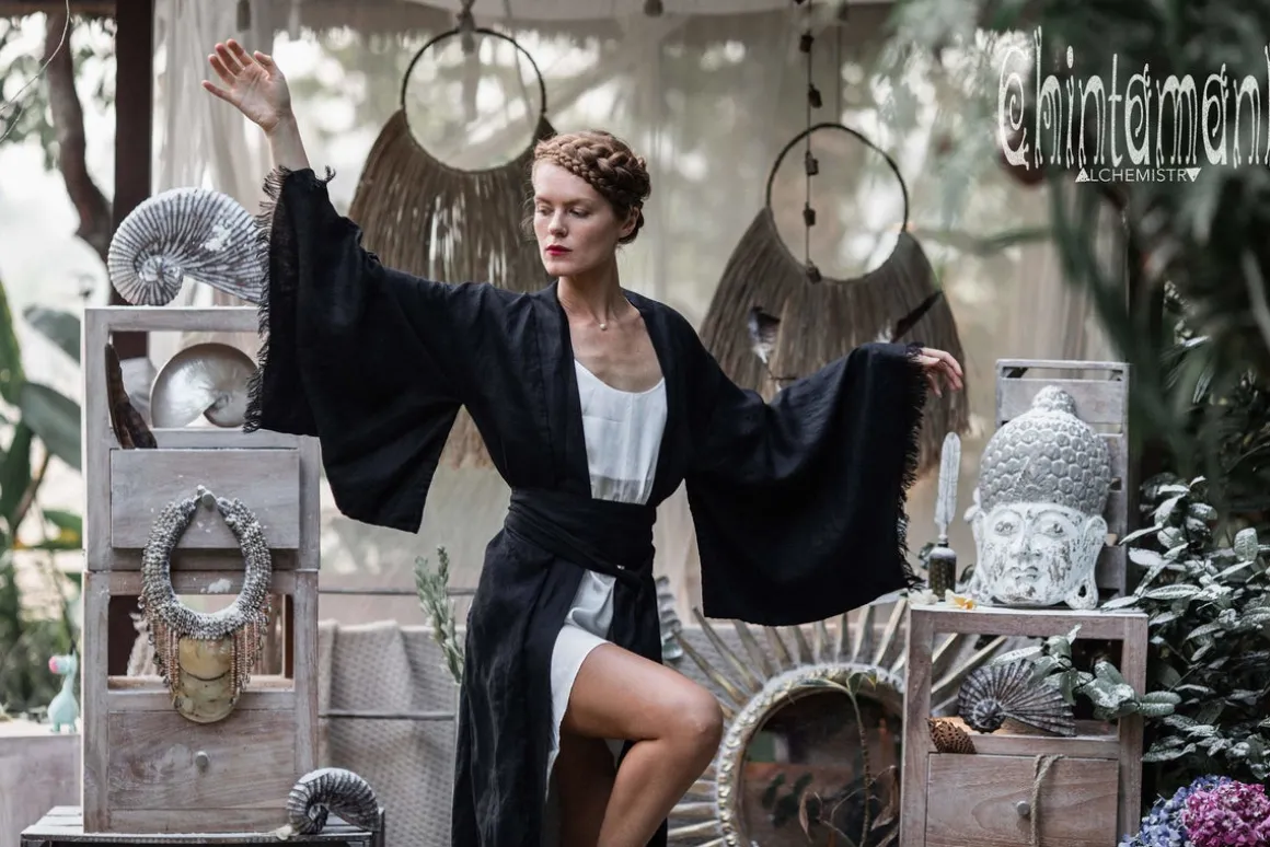Unique precious gem from our limited collection, this Japanese inspired black linen kimono robe is an exotic, but very comfortable gown, made in luxurious pure silk or noble 100% linen. This is our newest creation, that required all Chintamani Alchemistry experience in tailoring and fabric research, in order to create a real masterpiece, laconic and perfect. It can be worn as a classic kimono, or as a gorgeous bohemian mantle on top of our linen or silk dresses. You can also tie the front folds of the piece, to create a stunningly flowing wrap top. An exquisite boudoir piece to spoil all your senses, this long kimono cardigan comes with a massive 2,5 meter linen belt, that shapes its Japanese silhouette.