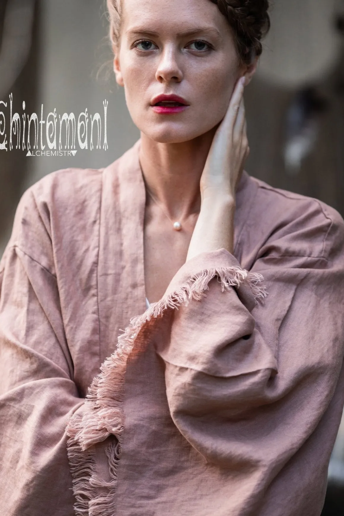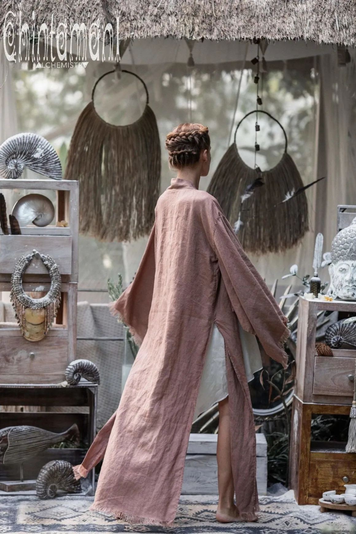 Unique precious gem from our limited collection, this Japanese inspired linen kimono cardigan is an exotic, but very comfortable gown, made in luxurious pure silk or noble 100% linen. This is our newest creation, that required all Chintamani Alchemistry experience in tailoring and fabric research, in order to create a real masterpiece, laconic and perfect. It can be worn as a classic kimono, or as a gorgeous bohemian mantle on top of our linen or silk dresses. You can also tie the front folds of the piece, to create a stunningly flowing wrap top. An exquisite boudoir piece to spoil all your senses, this boho kimono comes with a massive 2,5 meter linen belt, that shapes its Japanese silhouette.