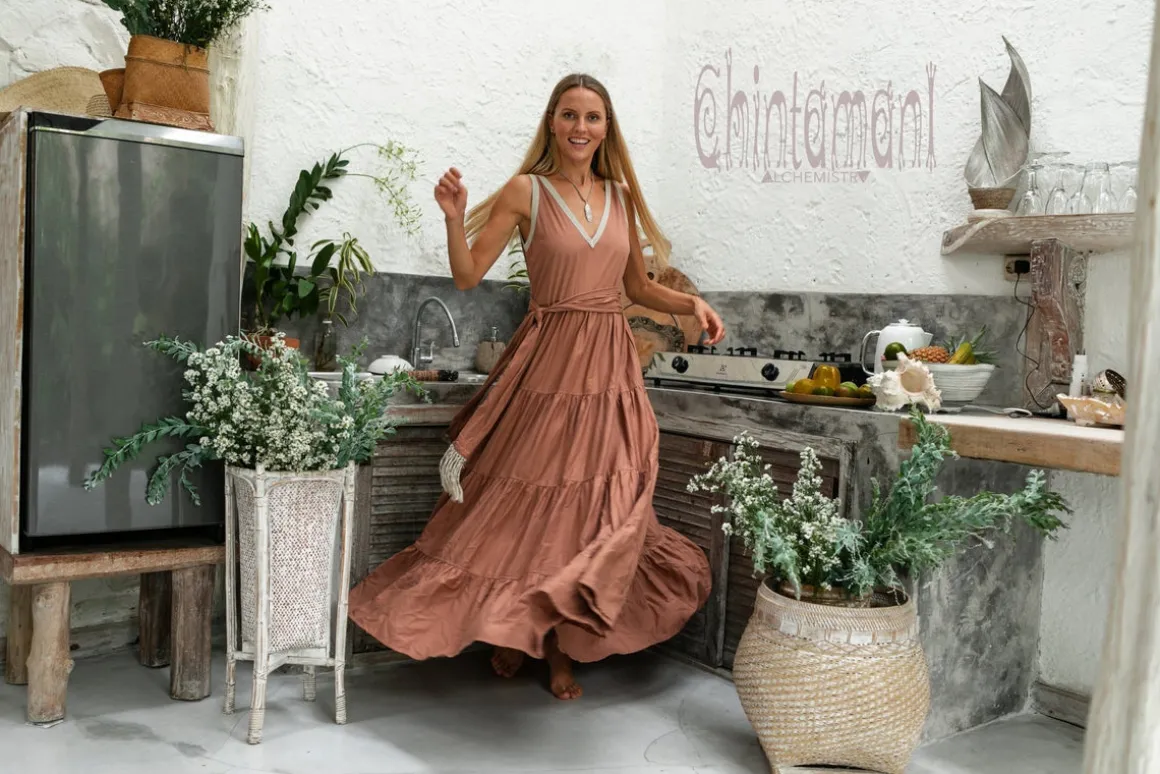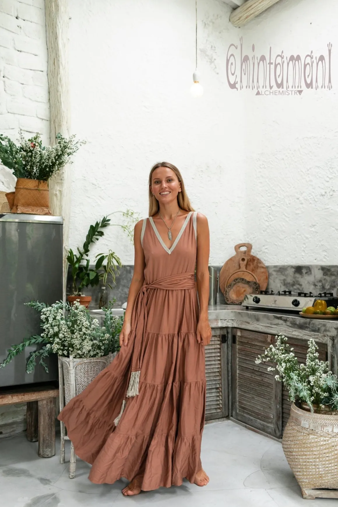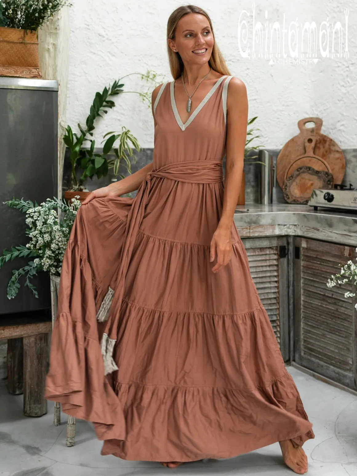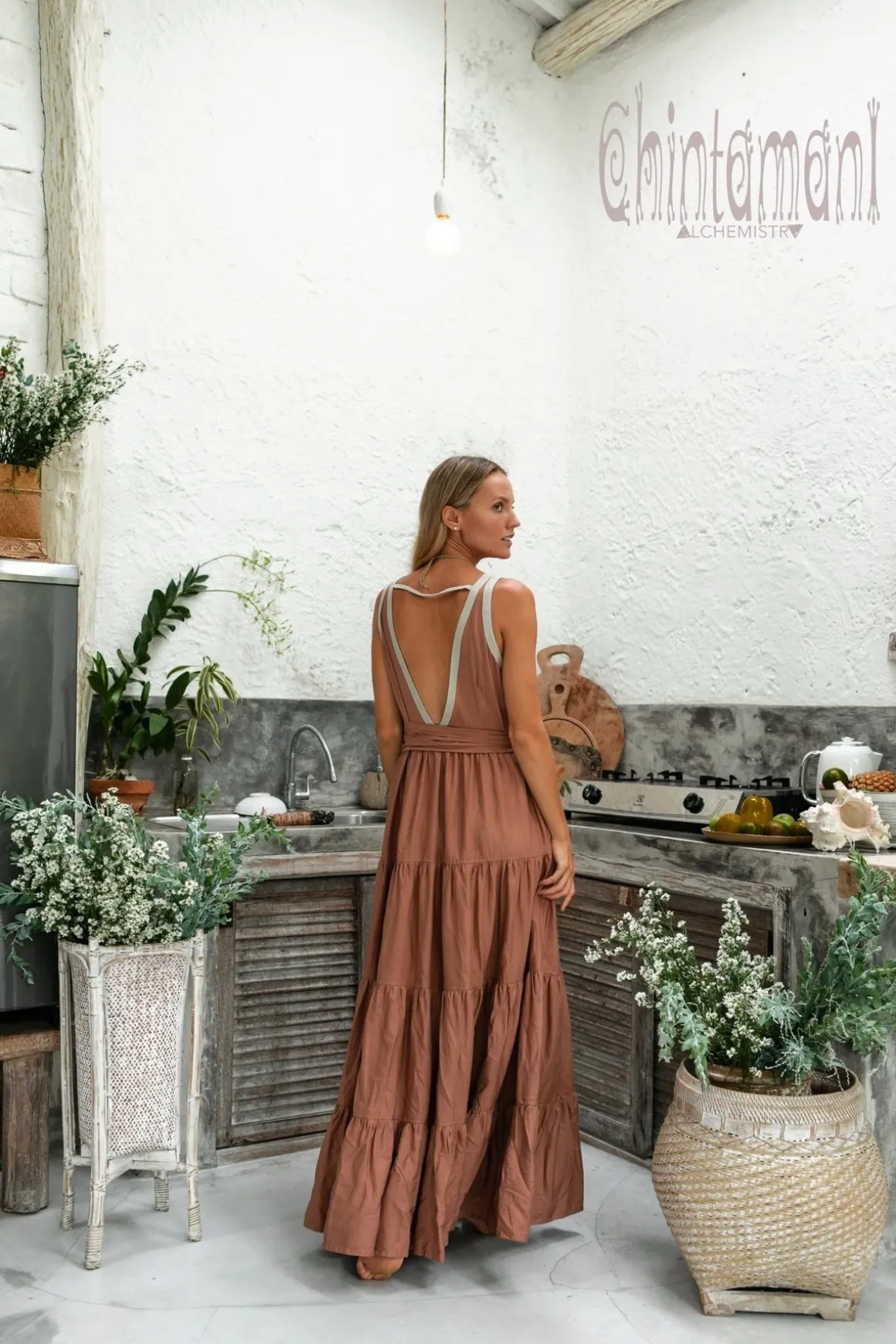Alma Libra Tiered Boho Maxi Dress is a very simple and graceful summer outfit, with timeless silhouette. It is gorgeously feminine, soft dress, that will look amazing with heeled sandals or our ethnic canvas boots. Open back adds the charm and makes it even more suitable for hot and lazy summer days. It is very floaty by design. Light, soft and natural Cotton fabric brings this idea to life perfectly. You can use fringed belt, that comes with the dress, to accentuate waistline, or just wear it free and simple.